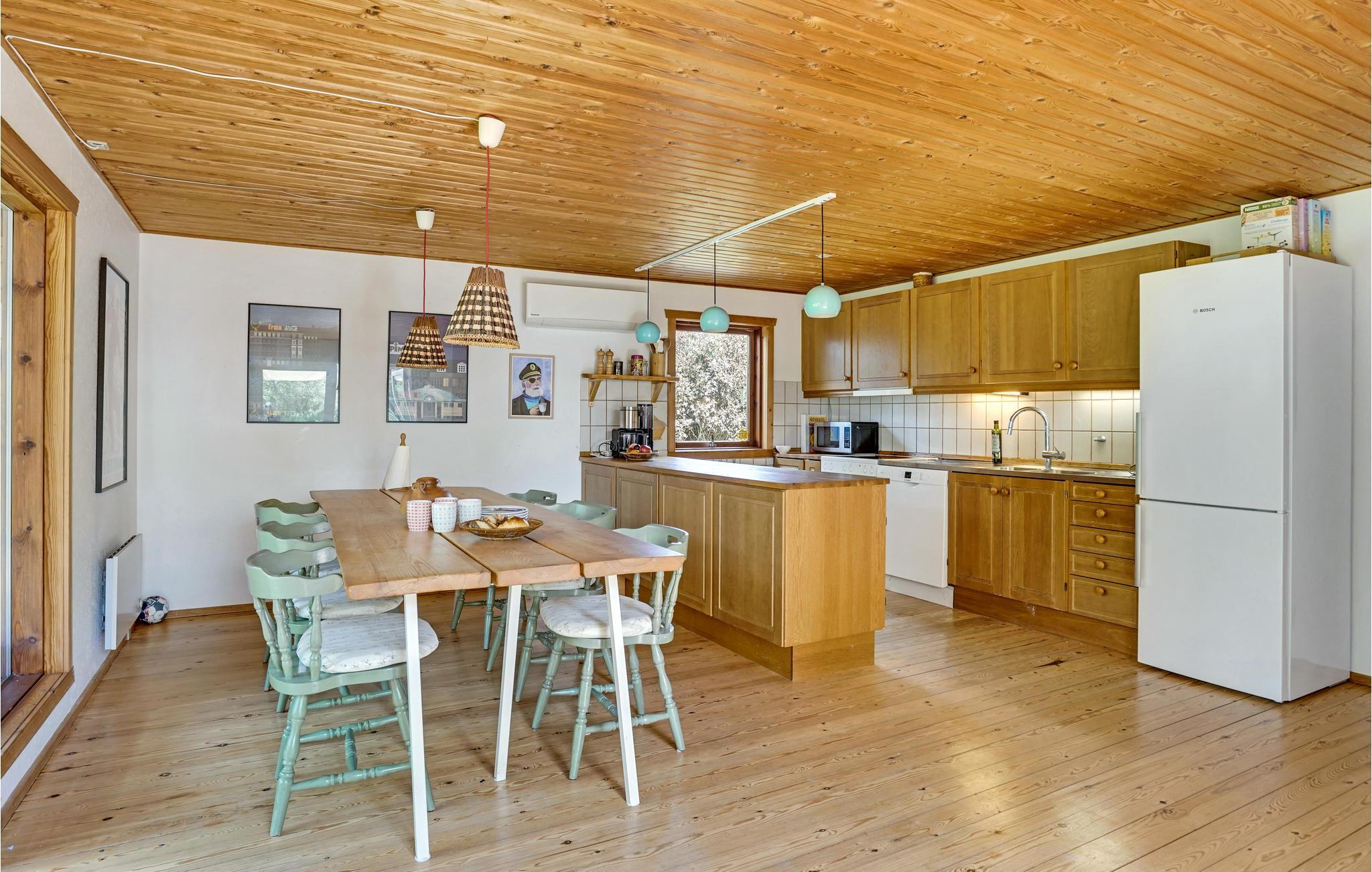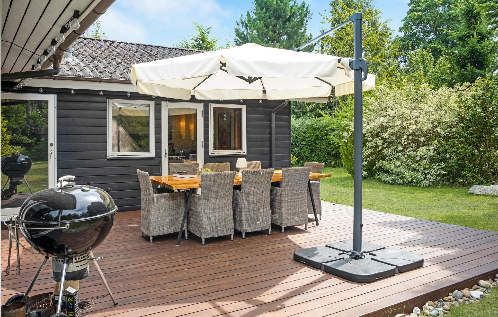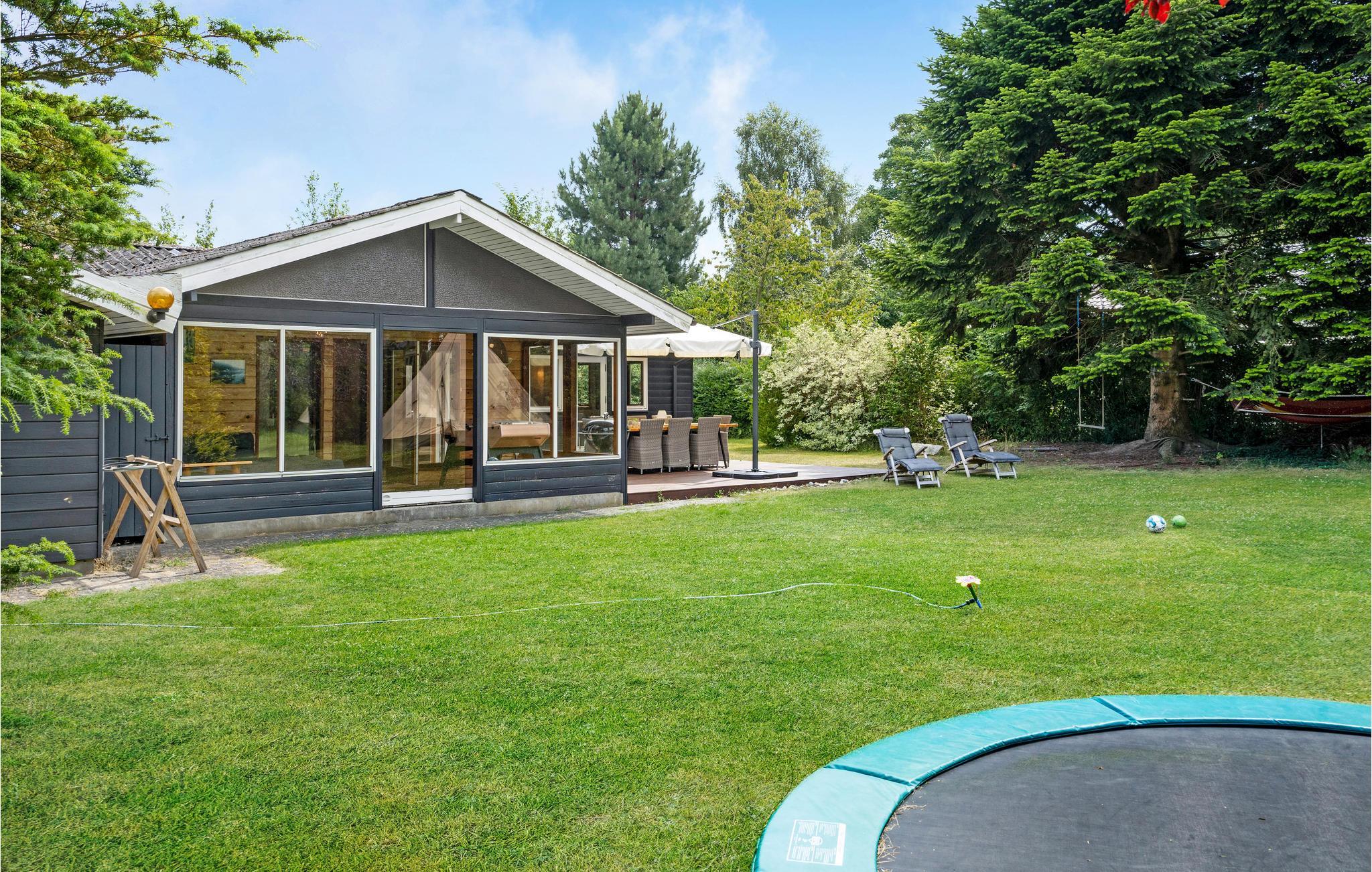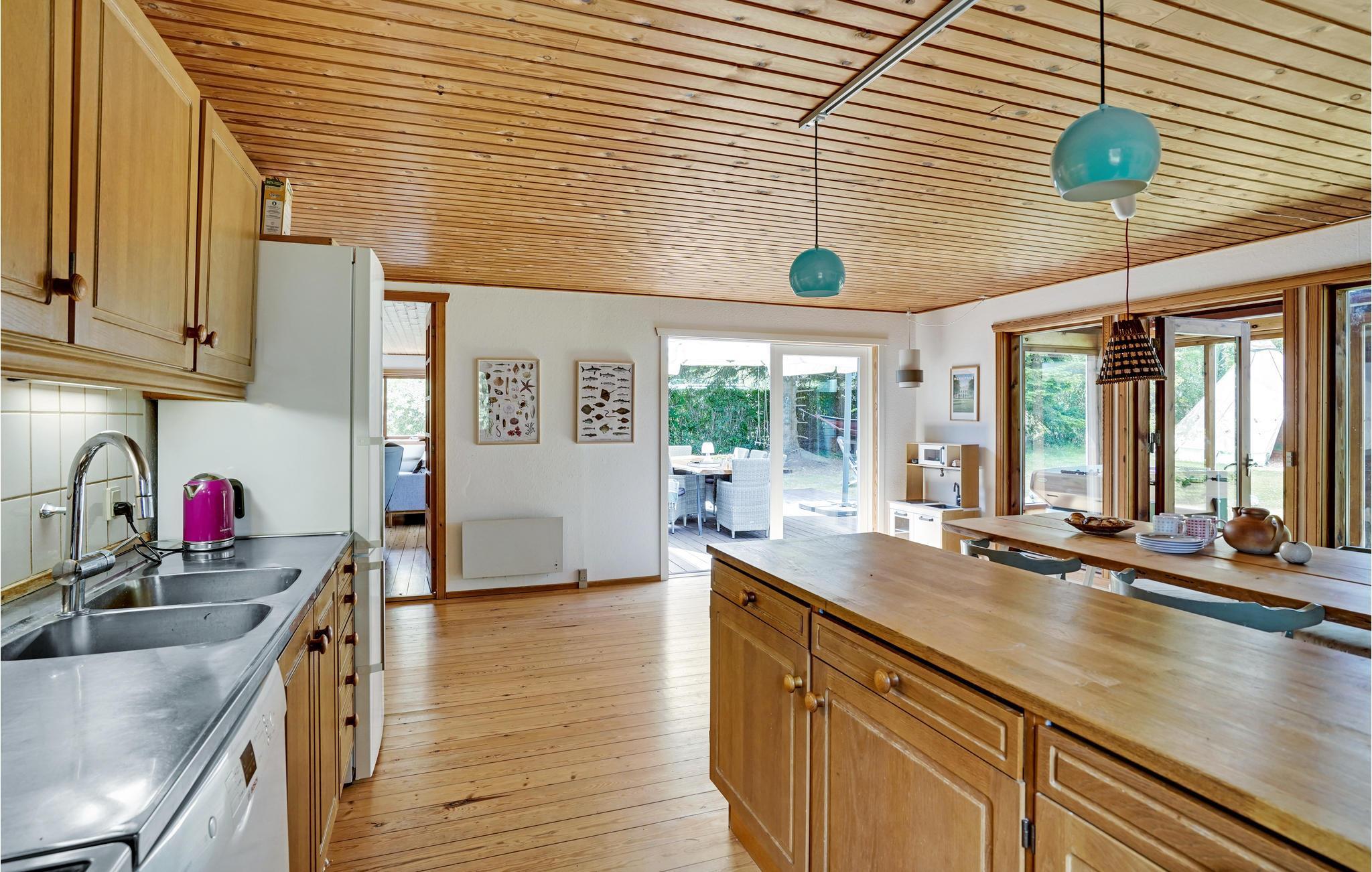 Dette dejlige område er et godt bekendtskab året rundt. Efter en dag fyldt med oplevelser er der skønt at komme hjem til dette rummelige feriehus, der har god plads til 6 personer. I køkkenet er der plads til alle rundt om spisebordet, og efter aftensmaden skal I ikke tænke på opvasken, den klarer opvaskemaskinen. I den hyggelige stue kan I tænde op i brændeovnen og nyde den dejlige varme, mens I ser tv eller læser en god bog. Her er naturligvis trådløst internet. I havestuen (uopvarmet) kan I tage en rask dyst i bordfodbold. I kommer ud på den skønne terrasse fra enten køkkenet eller stuen, og videre ud i den dejlige have, hvor I både kan finde skygge og sol. Nyd det skønne vejr i havemøblerne og tilbered lækre feriemåltider på grillen.