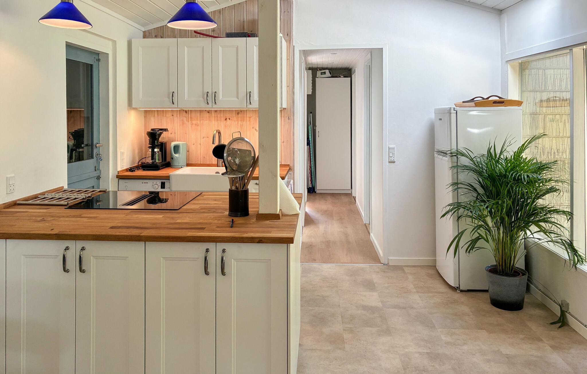 Tilbring en afslappende ferie i dette hyggelige hus, beliggende i en frodig have. Det smukt møblerede hus byder jer velkommen med sin hjemlige atmosfære. Slap af i de komfortable sofaer i stuen, læs en bog eller afslut dagen med et brætspil. Tilbered måltiderne i det åbne køkken, som har adgang til en lille spiseplads.