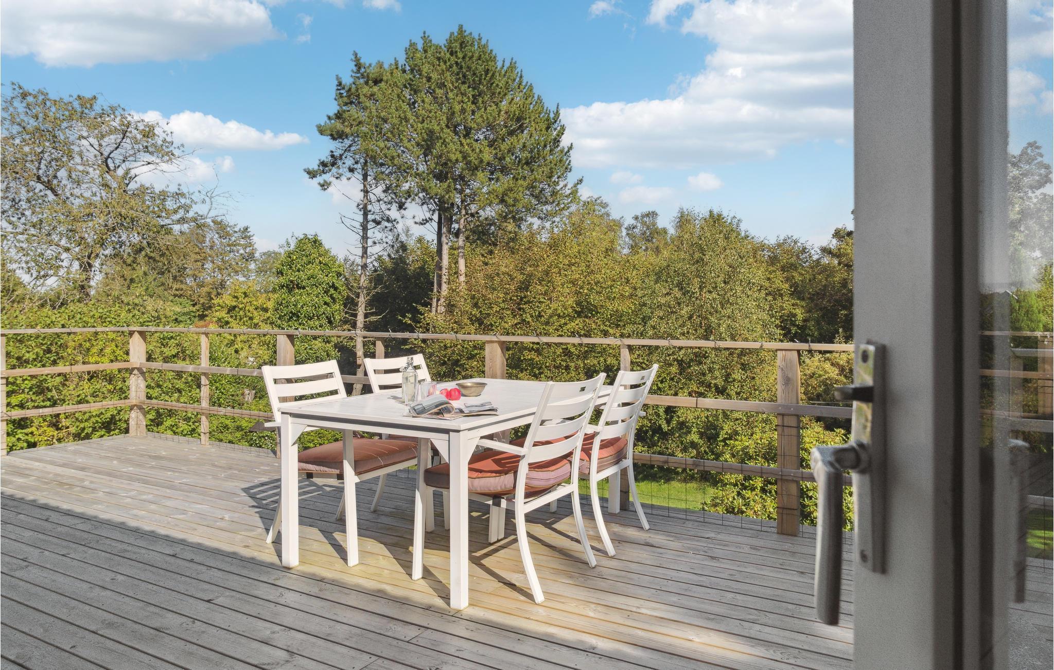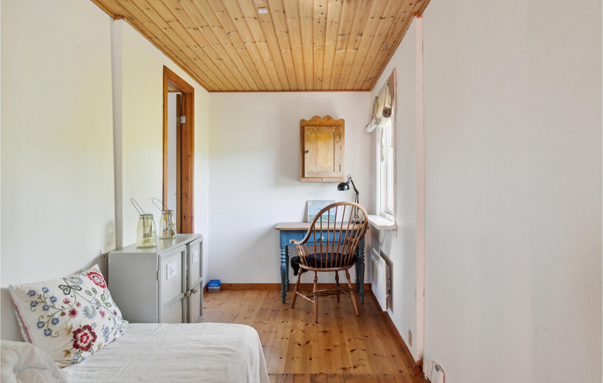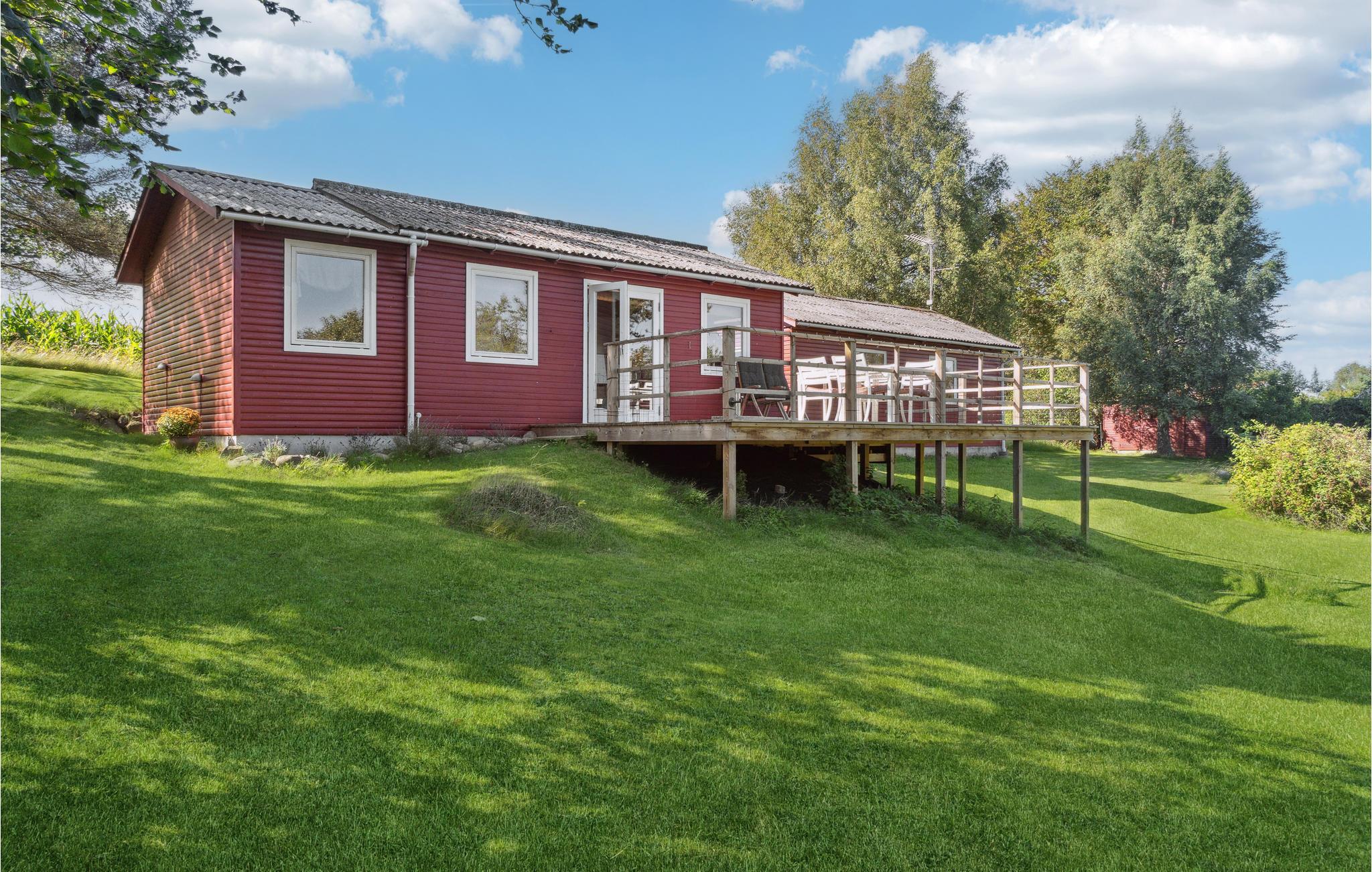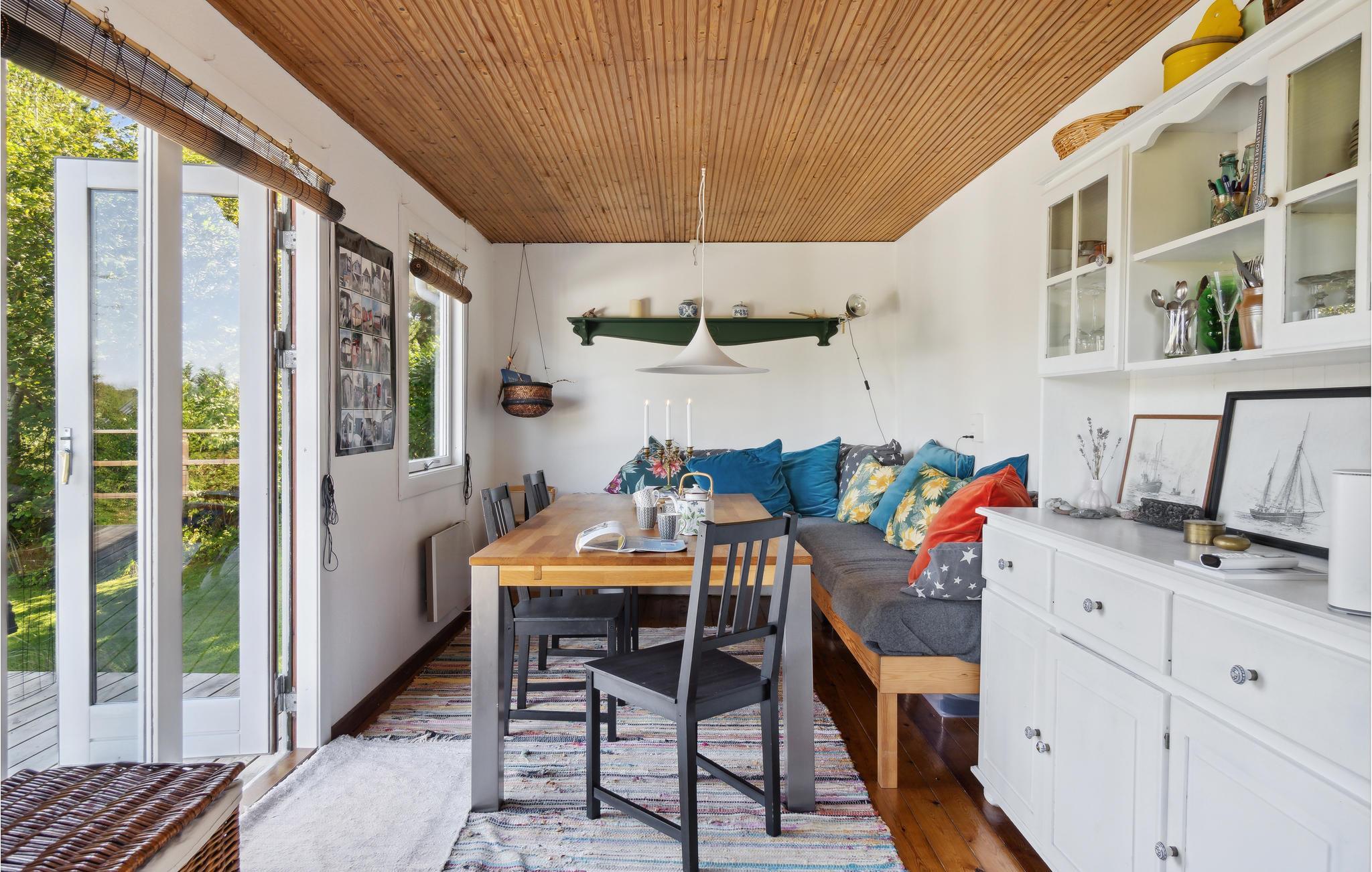 Beliggende helt ugenert i et roligt område, der grænser op til en mark, byder dette hyggelige feriehus jer velkommen. Omgivet af grønne træer og buske lover huset ro og fred. Indenfor er der en varm stemning, og vinduerne giver jer en flot udsigt over det grønne. Hak ingredienserne til jeres måltider sammen i køkkenet og glæd jer til lækre måltider i en hjemlig atmosfære eller underholdende spilleaftener ved spisebordet. Efter en lang dag kan I slappe af i sofahjørnet, se en film eller hyggesludre over en kop aftenkaffe. Her kan I samle ny energi og gøre lige, hvad I har lyst til! Om morgenen kan I nyde jeres morgenmad på træterrassen og udsigten over haven og landskabet.