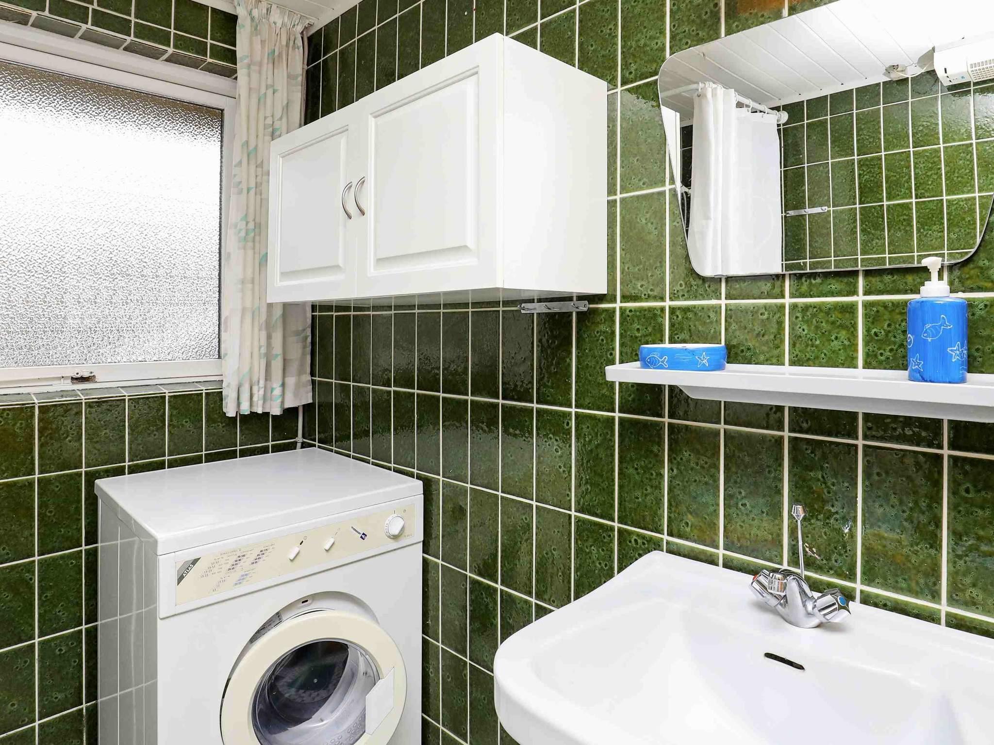 Badeværelse med bruseniche. Funktionelt indrettet køkken der bl.a. indeholder fryser, opvaskemaskine og mikroovn. Køkkenet er kombineret med stor og personligt indrettet stue. Her er der en hyggelig pejs og tv med parabolantenne.