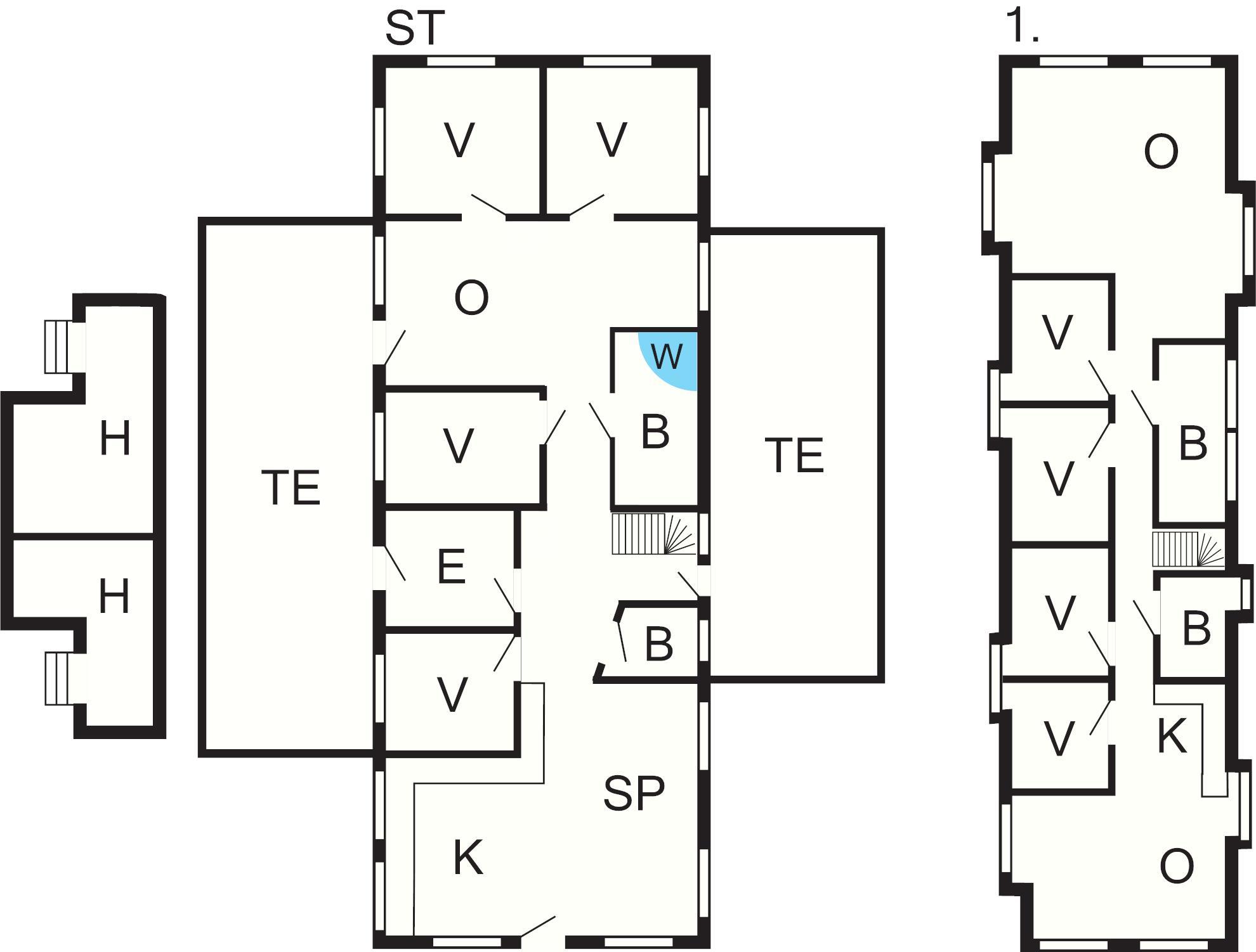 8 Soveværelser: (1DS)+(1DS)+(1DS)+(1DS)+(1DS)+(1DS)+(1DS)+(2S), barneseng
