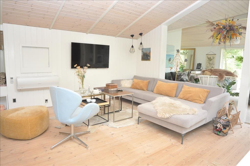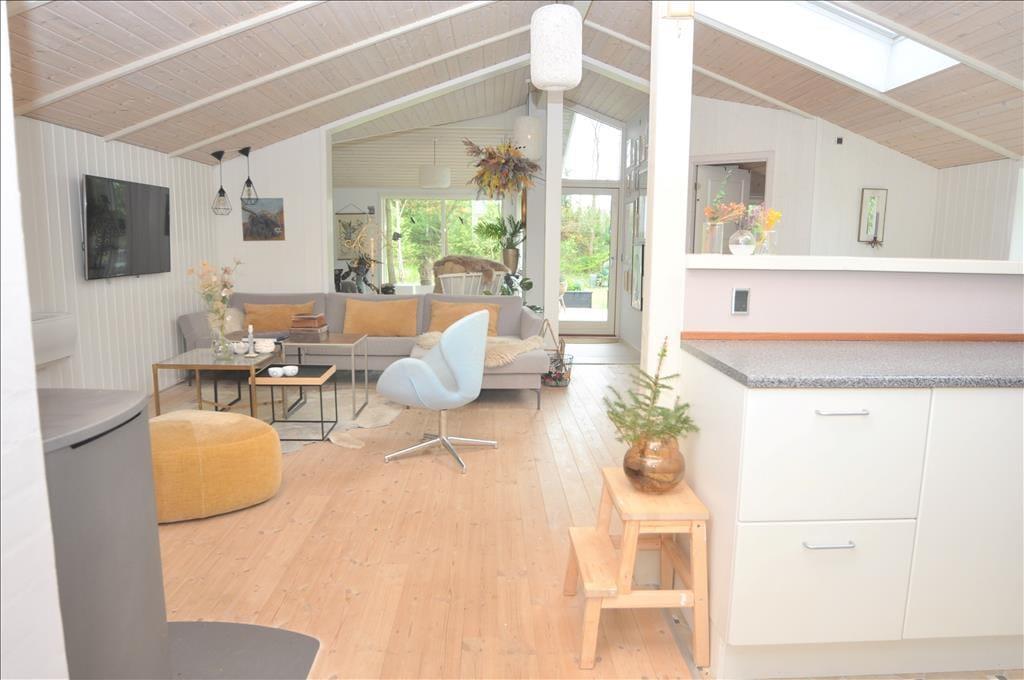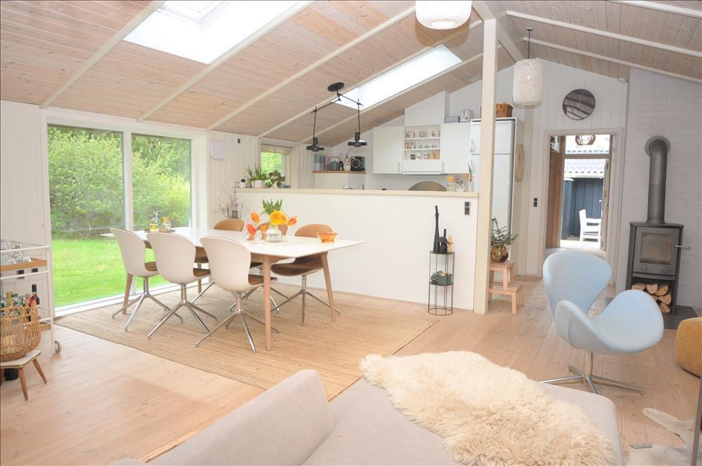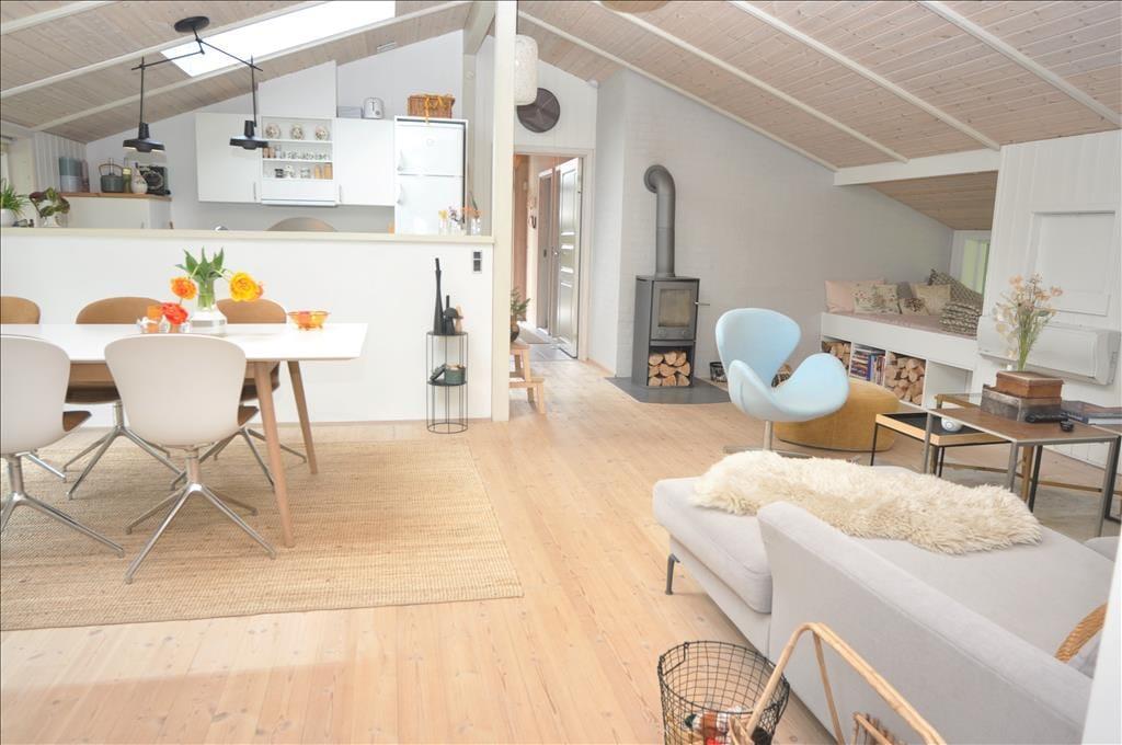 Træd indenfor i dette flotte træferiehus hvor der emmer af hygge og nærvær. De mange rum er prydet med smukke sarte farver der giver huset en afslappende og skøn atmosfære. Den store stue byder på mange skønne hyggekroge der kalder på hyggelige stunder og lange dybe samtaler for hele familien, eller tag en bog i hånden og forsvind ind i en helt anden verden. For ekstra hygge så tænd op for den hyggelige brændeovn og nyd dens dejlige varme og hyggelige knitrende lyd der spreder sig i rummet. Stuen er præget af de store vinduer hvilket giver et fantastisk lysindfald som man ikke kan andet end at nyde.