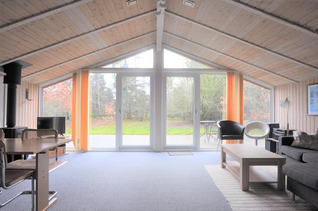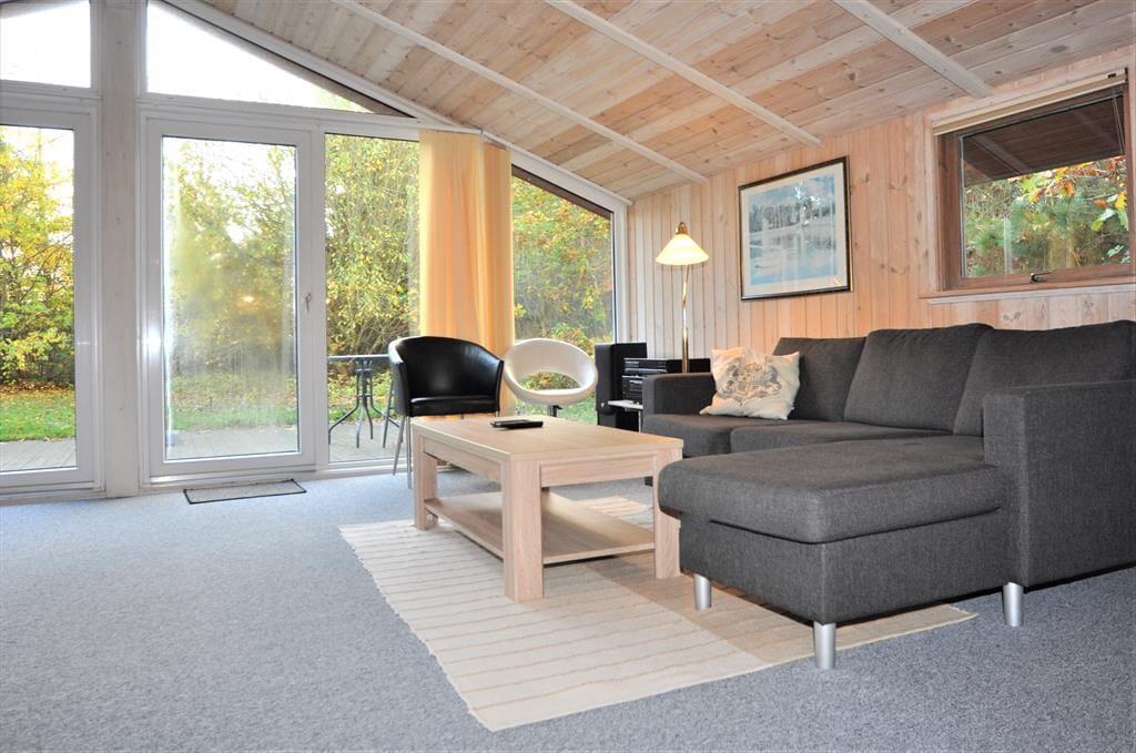 Når I træder ind i dette skønne feriehus, vil jeres øjne straks søge hen til det store vinduesparti ud mod haven, her kommer der et fantastisk smukt lys ind i den store stue med en skøn mindre spiseafdeling, her kan I nyde ferien i ro og mag. I stuen er der loft til kip hvilket giver jer en dejlig rummelighed, så tag et slag kort om det dejlige spisebord, tag strikketøjet frem eller tænd for en god film i fjernsynet imens I nyder den dejlige varme og hyggelige knitrende lyd brændeovnen giver. Skulle I en dag trænge til total afslapning kan I tænde op for den dejlige sauna og nyde varmen.