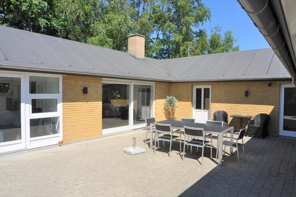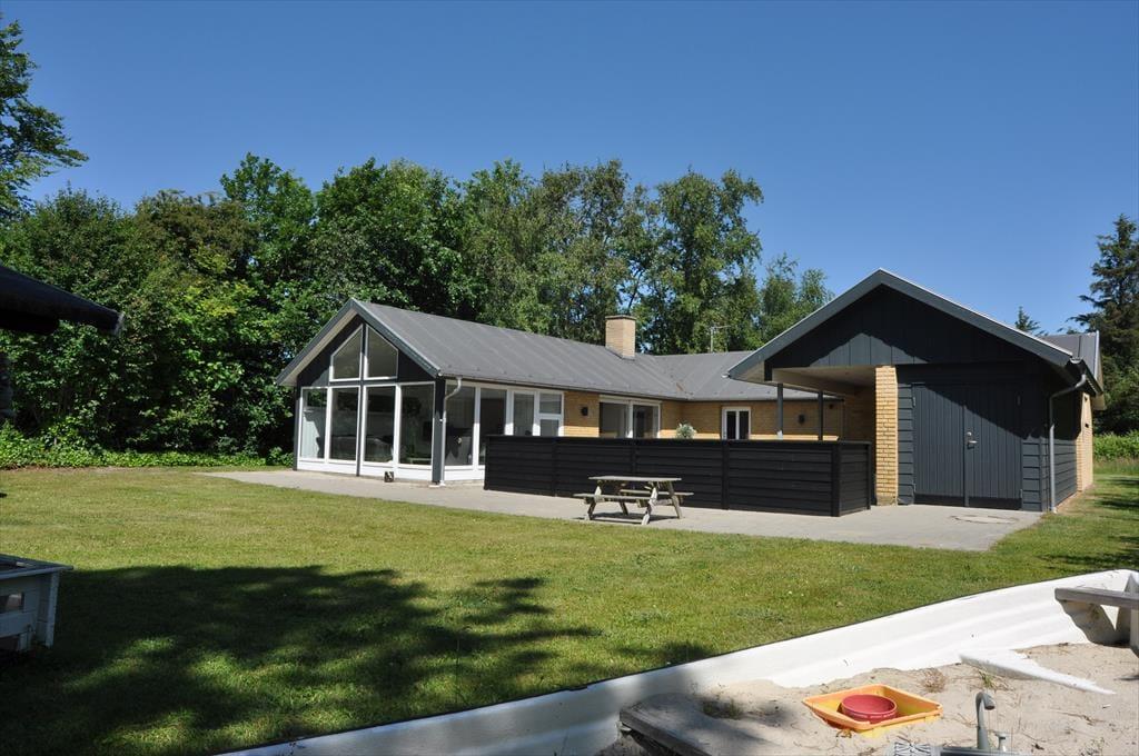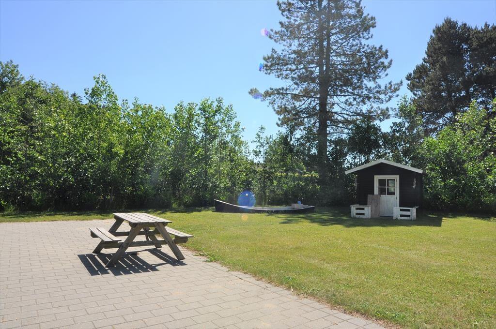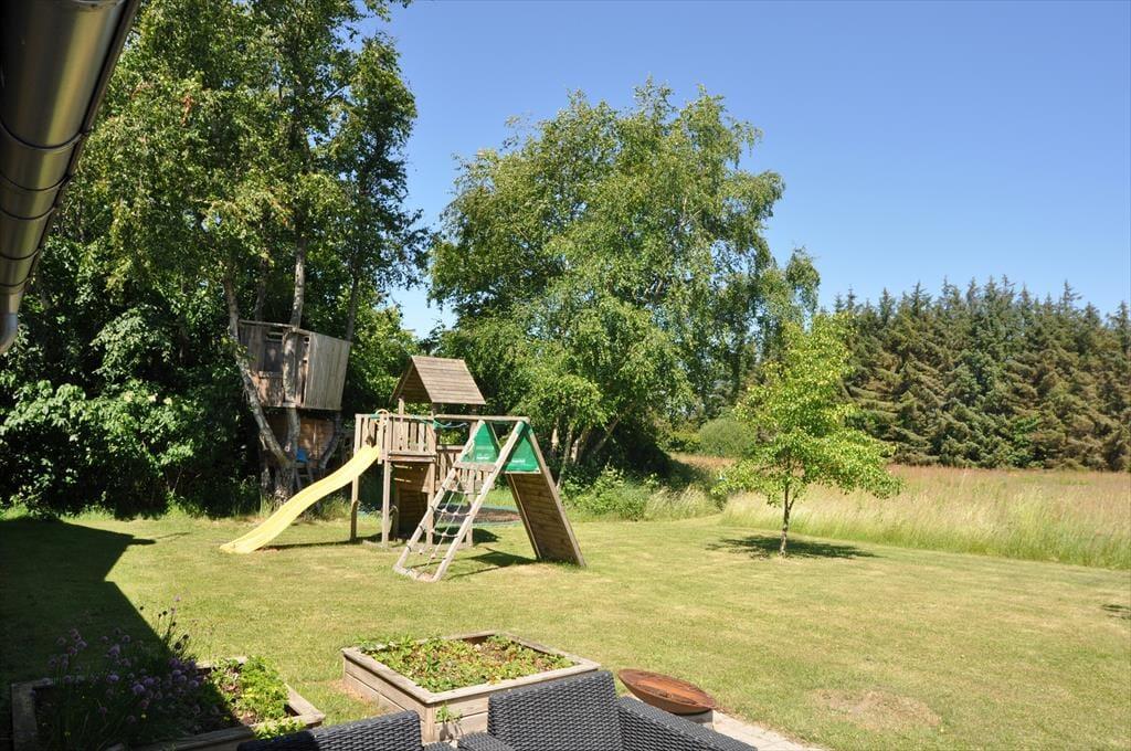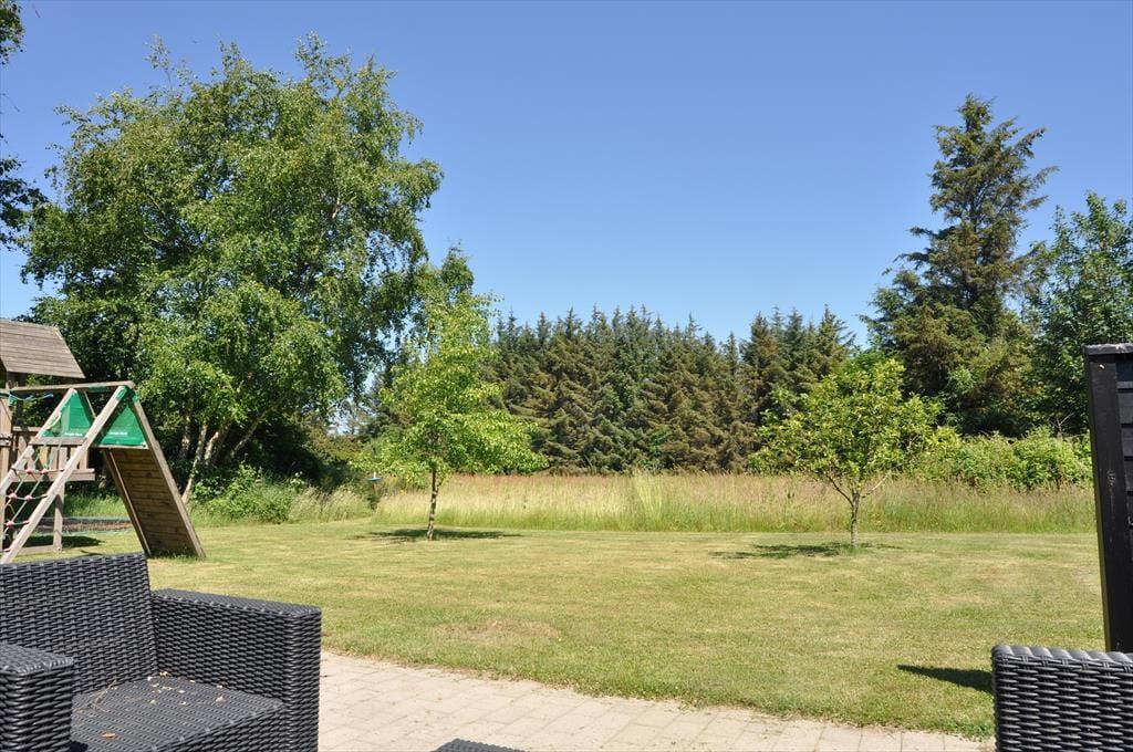 Benyt en af de tre udgange til den skønne sydvendte gårdhave, her kan I sidde i læ og nyde de dejlige solstråler i ro og mag, så nyd solens varme i mange timer, og den friske Vesterhavsluft der hersker over området. På grunden finder I også både legetårn, sandkasse og legehus, så der er masser at lave for ungerne imens I nyder en god kop kaffe, imens hunden ligger under bordet og slapper af. Sæt jer på den skønne nordvendte terrasse, her kan I nyde den skønne natur med udsigt til marker og træer og imellem træerne kan fjorden skimtes.