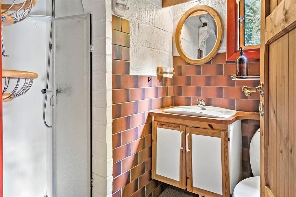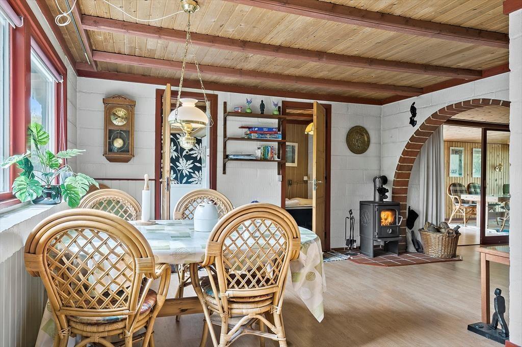 I dette ældre, men utroligt velholdte feriehus, har I rig mulighed for at nyde en hyggelig ferie sammen med familien. Huset er lyst og hyggeligt indrettet med køkken hvor I har plads til at udfolde jeres kulinariske evner, køkkenet ligger i åben forbindelse med en dejlig opholdsstue så her kan I nyde brændeovnens varme stråler og hyggelige knitrende lyd. Fra stuen finder I udgangen til en smuk udestue hvor der kommer en masse dejligt lys ind, fra udestuen er der udgang til den vestvendte terrasse via en stor skydedør, som kan rulles til side så I kan få naturen og det dejlige lys helt ind.