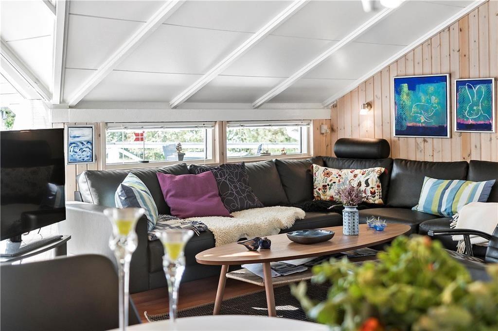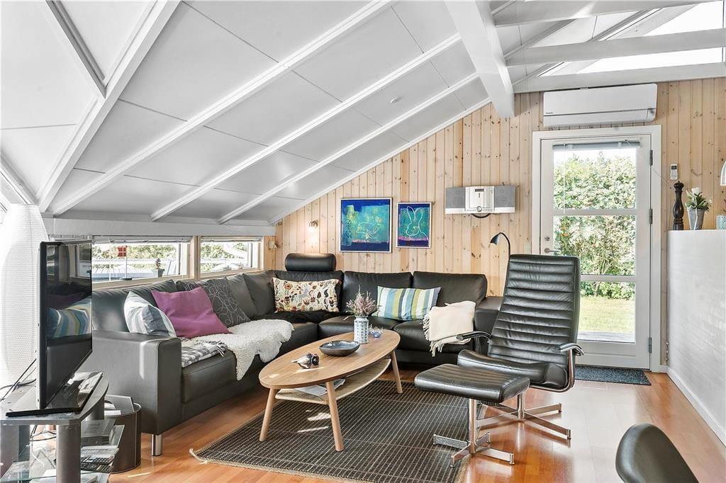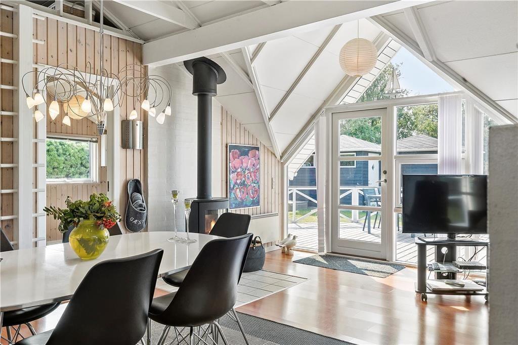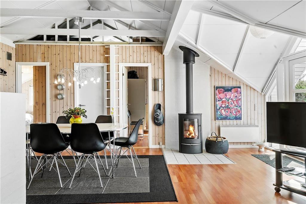 Dette yderst hyggelige træferiehus er ideelt til at nyde en dejlig ferie for hele familien. Når I træder ind i huset, vil I blive ramt af en hyggelig og atmosfærefyldt opholdsstue, med en skøn rummelighed på grund af loftet til kip, frithængende bjælker og store vinduer der lukker en dejlig masse lys ind. I det dejligt store rum finder I et godt udstyret køkkenhjørne, så med både køkken, spise- og opholdsstue i et har I rig mulighed for at lade snakken forsætte over madlavning. På de kølige sommeraftner kan I tænde op for den dejlige brændeovn og nyde dens varme stråler og hyggelige knitrende lyd der spreder sig i hele rummet, eller tag en tur i den dejlige varme sauna.