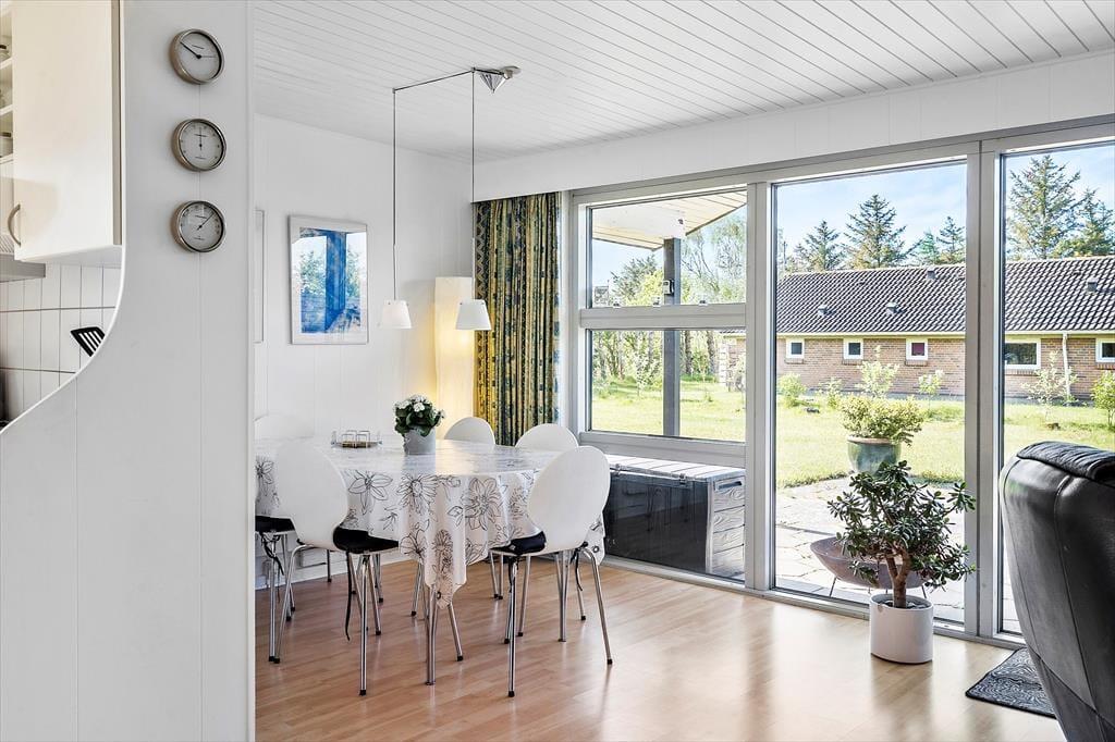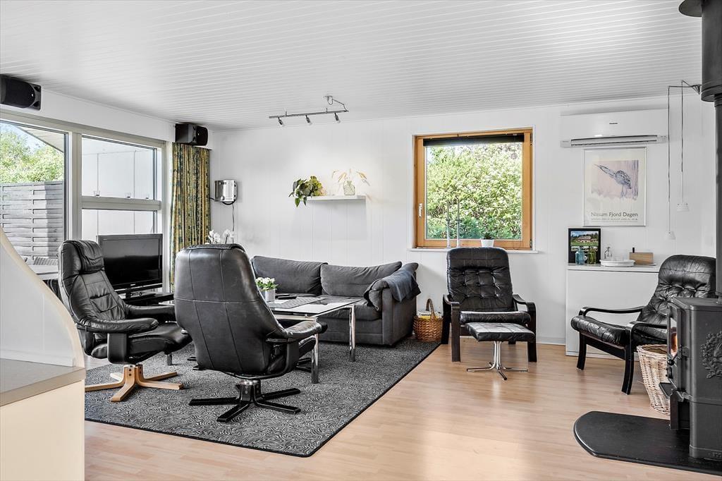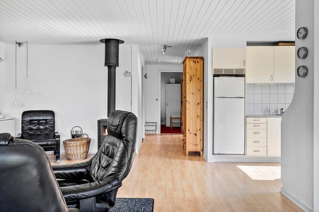 Træd ind i et lyst og stilfuldt sommerhus, hvor køkkenet byder jer velkommen og åbner sig op mod den elegante stue. Her kan I nyde den moderne sort/hvide indretning, slappe af foran den knitrende brændeovn og lade dagens lys strømme ind gennem de store panoramavinduer. Terrassedøren fører jer direkte ud på en delvist overdækket terrasse – det perfekte sted til morgenkaffe eller aftensmad under åben himmel.