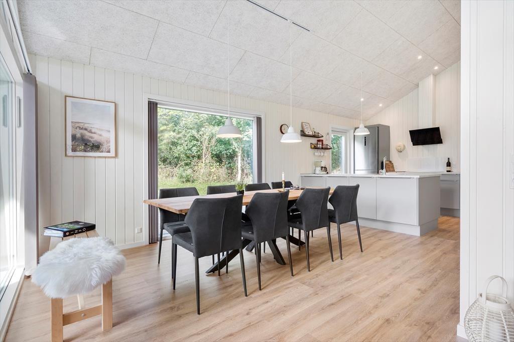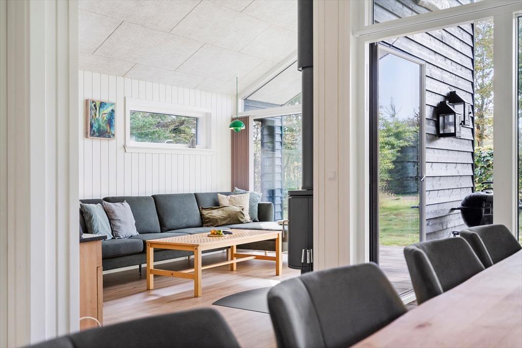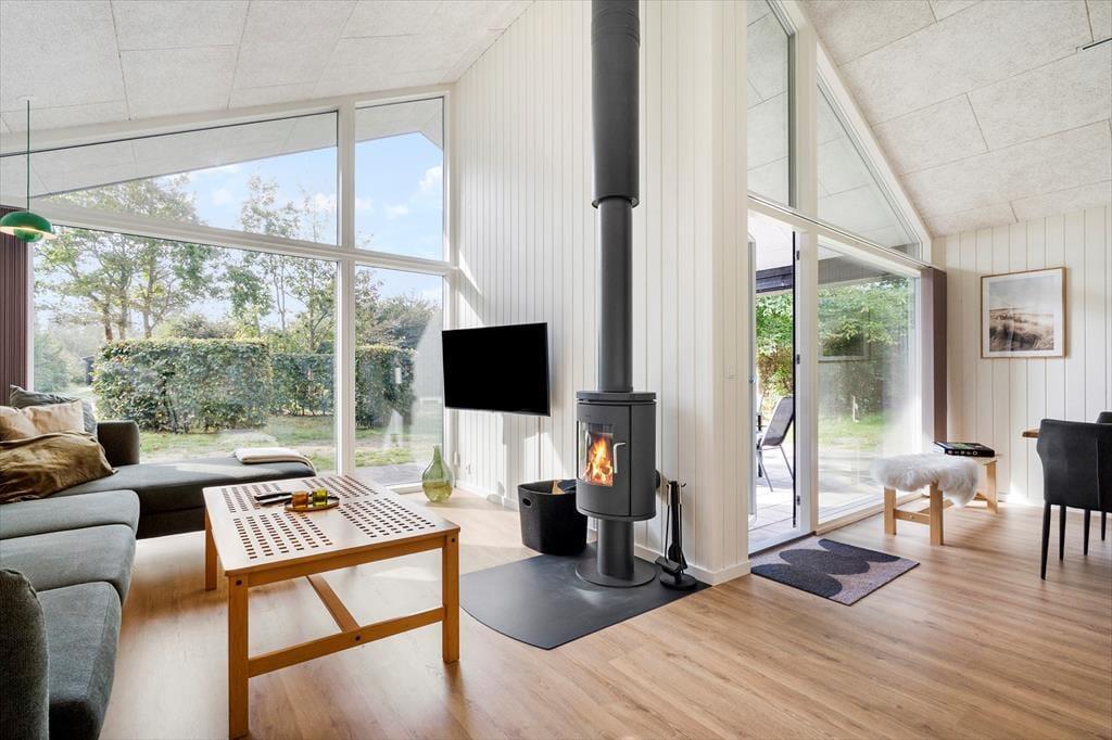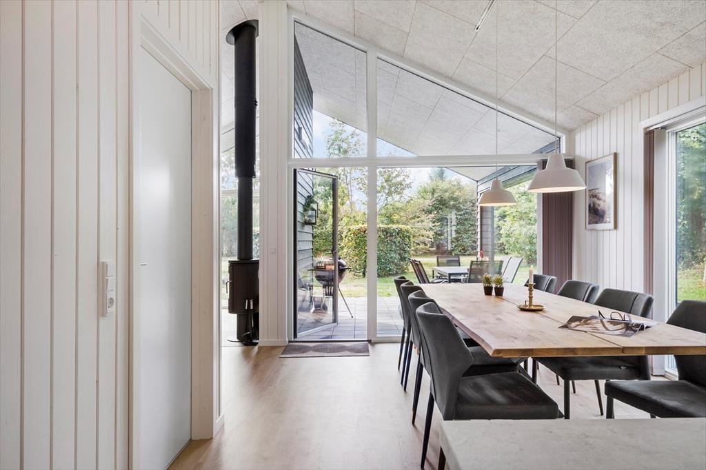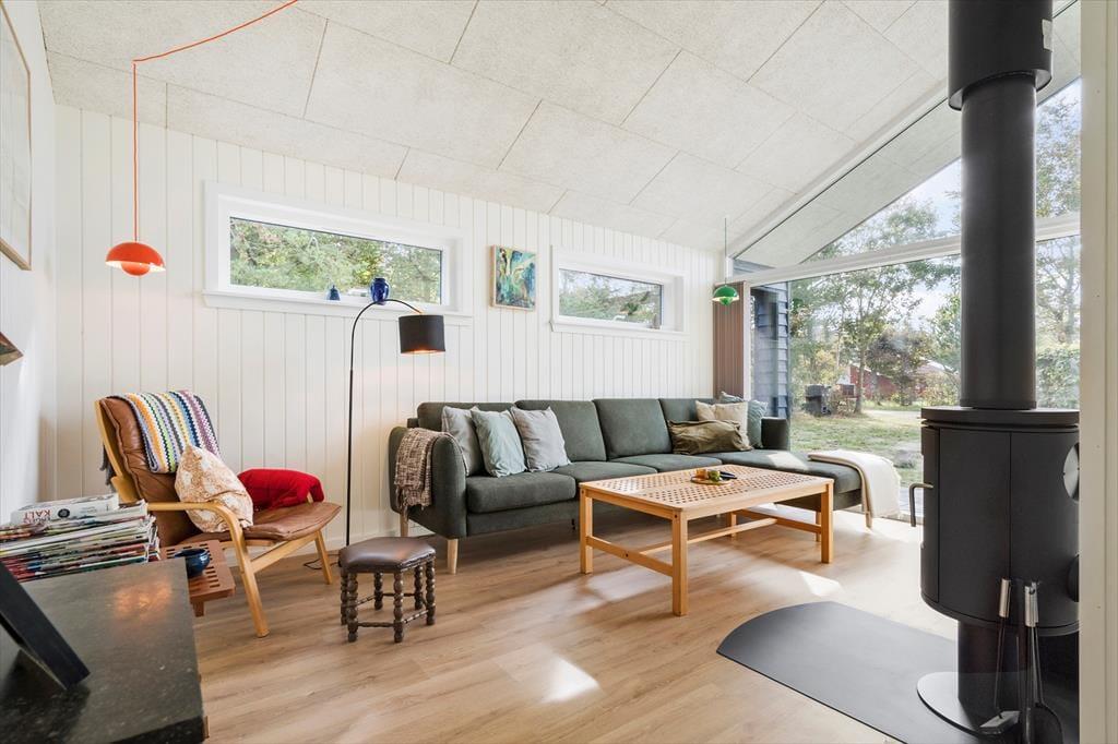 I dette særdeles velholdte og indbydende hus, vil I kunne mærke, at der er kælet for både indretning og hyggen på højeste niveau. Der er en dejlig følelse af højt til loftet, luftig og god plads til hele familien. Når I træder ind fra entreen, vil I komme ind i husets hjerte, det hyggelige køkkenalrum. -Her er der både plads til samlet hygge ved spisebordet med spil, hinandens nærvær, hvor dé i køkkenet også er med i samtalen, imens den liflige duft fra feriemaden stille og roligt rammer næseborene eller I kan foretrække til den hyggelige tv-stue i forbindelse med alrummet., lægge benene op og nyde den knitrende lyd, det blinkende skær og mærke varmen fra brændeovnen. Selv indefra kan den dejlige store naturgrund føles tæt ind på kroppen når man sidder med sin morgenkaffe og kigger ud af de store vinduespartier.
