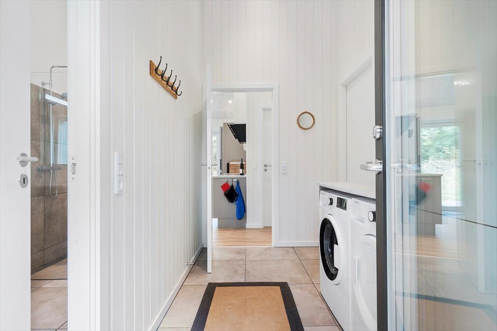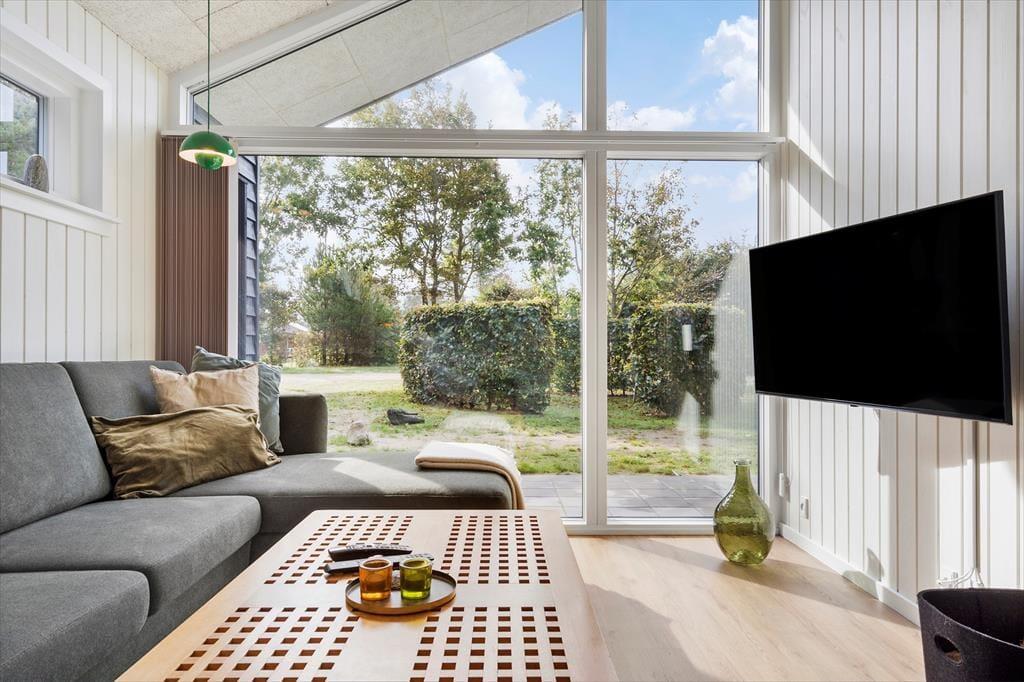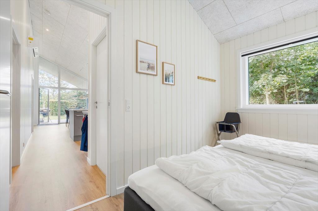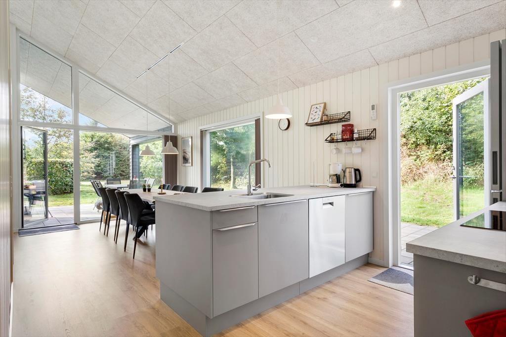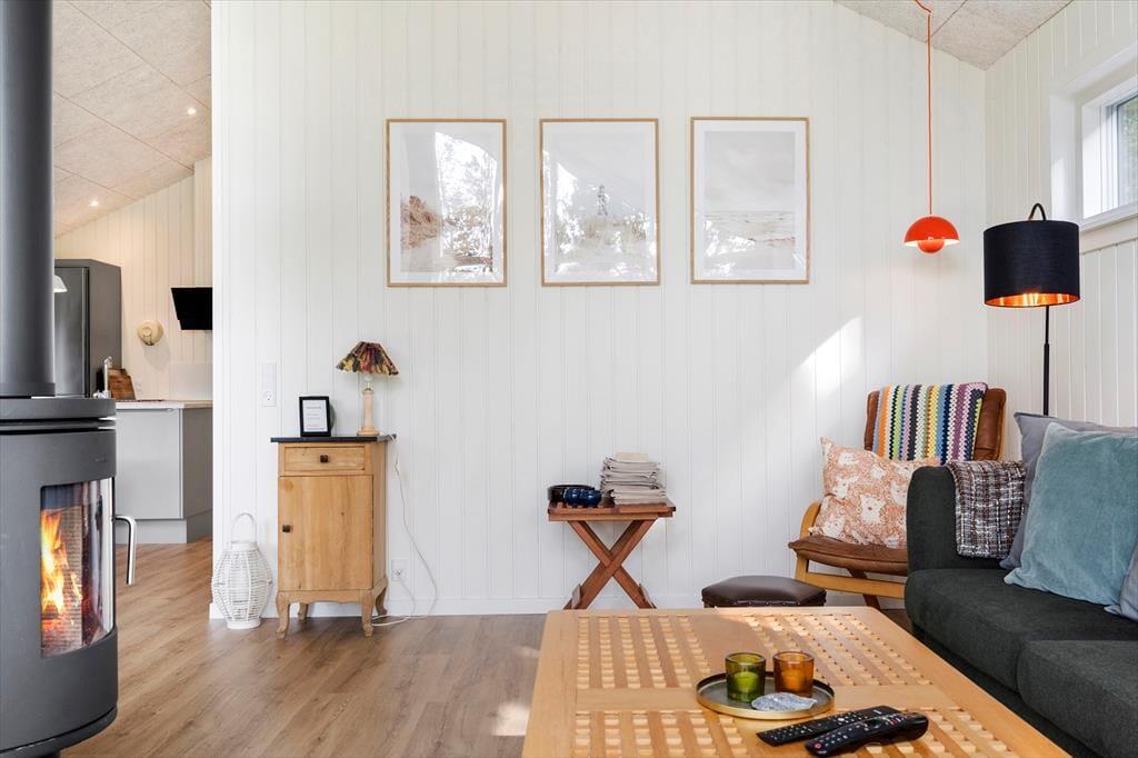 I dette særdeles velholdte og indbydende hus, vil I kunne mærke, at der er kælet for både indretning og hyggen på højeste niveau. Der er en dejlig følelse af højt til loftet, luftig og god plads til hele familien. Når I træder ind fra entreen, vil I komme ind i husets hjerte, det hyggelige køkkenalrum. -Her er der både plads til samlet hygge ved spisebordet med spil, hinandens nærvær, hvor dé i køkkenet også er med i samtalen, imens den liflige duft fra feriemaden stille og roligt rammer næseborene eller I kan foretrække til den hyggelige tv-stue i forbindelse med alrummet., lægge benene op og nyde den knitrende lyd, det blinkende skær og mærke varmen fra brændeovnen. Selv indefra kan den dejlige store naturgrund føles tæt ind på kroppen når man sidder med sin morgenkaffe og kigger ud af de store vinduespartier.
