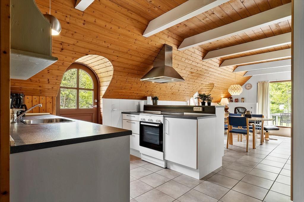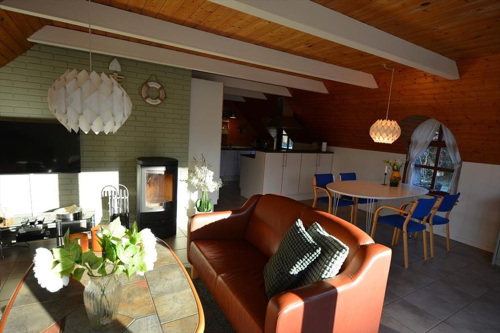 Indenfor finder I en hyggelig stue med komfortable møbler, brændeovn og masser af plads til samvær. Her kan I nyde en stille stund med en god bog, en kop kaffe eller bare lade blikket hvile ud over haven gennem de store vinduer. Brændeovnen spreder en behagelig varme, som giver ekstra hygge på kølige dage og aftener – og bidrager til den særlige stemning, der gør huset til noget helt særligt.