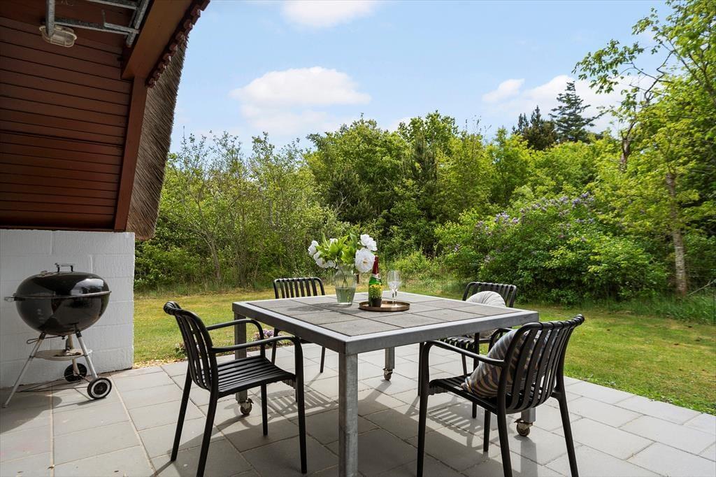 Udenfor venter en stor og dejlig have, delvist omkranset af træer, som giver både læ og privatliv. Den sydvendte terrasse er det perfekte sted at starte dagen med morgenmad i solen eller nyde eftermiddagens solen på terrassen. Her kan I læne jer tilbage i havemøblerne med en bog, et glas vin eller bare lytte til fuglene og mærke naturens nærvær.