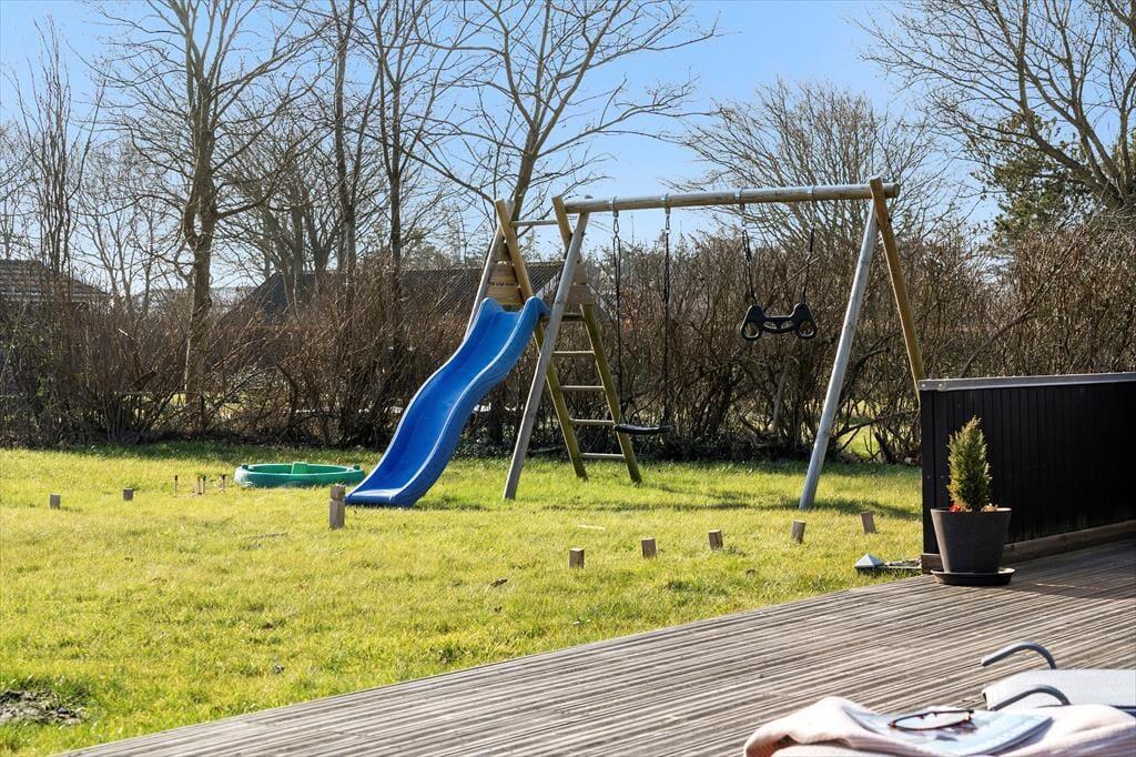 Tag familien med ud på den dejlige sydvendte terrasse med hyggelig overdækning, her kan I sidde læ, hvis vejret skulle finde på at drille lidt. Her er god plads til lange hyggelige grill aftener, hvor I kan hygge jer med god mad og dejligt samvær. Terrassen fortætter rundt om husets østside, så der er rig mulighed for at finde en god solrig plet. Her kan I slå jer ned med en kold forfriskning og med lidt lækkert til ganen. Perfekt til at nyde de stille øjeblikke, og komme helt ned i tempo. Luk hunden ud i den lille indhegning i haven, hvor den kan more sig mens I slapper af.