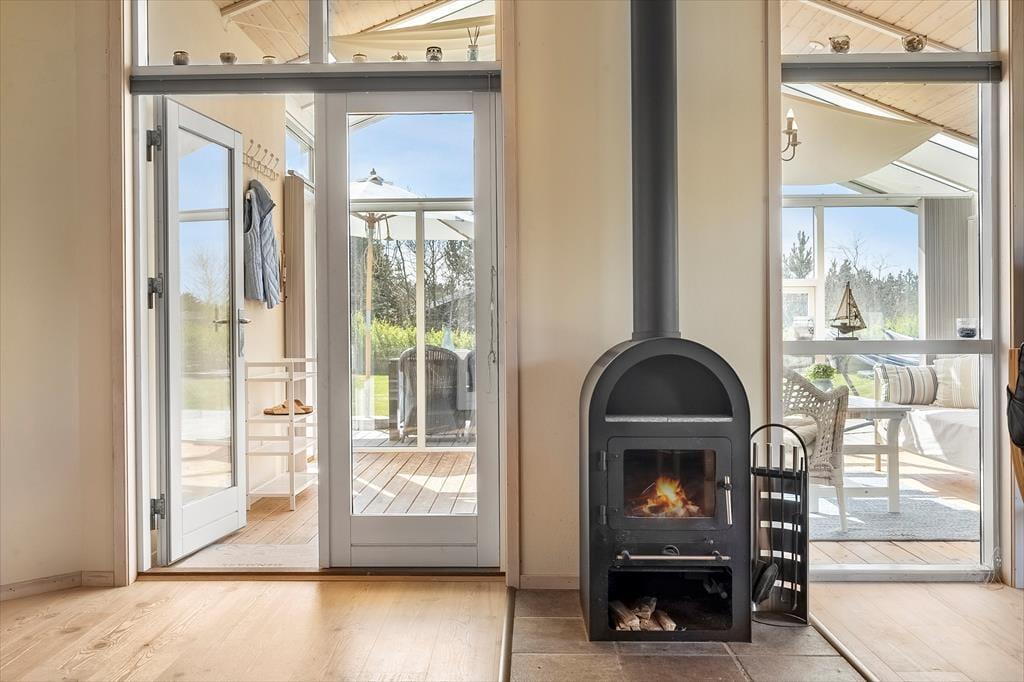 Udenfor venter en stor træterrasse, hvor I kan nyde solen dagen lang og spise måltider under åben himmel. Her er også et hyggeligt bålsted – oplagt til snobrød, stjernekig og gode snakke i skæret fra flammerne. Den omkringliggende natur er rolig og grøn, og fjorden ligger tæt på, så I nemt kan tage på en stille aftengåtur med udsigt over vandet. Her er der god plads til at trække vejret og bare være til.