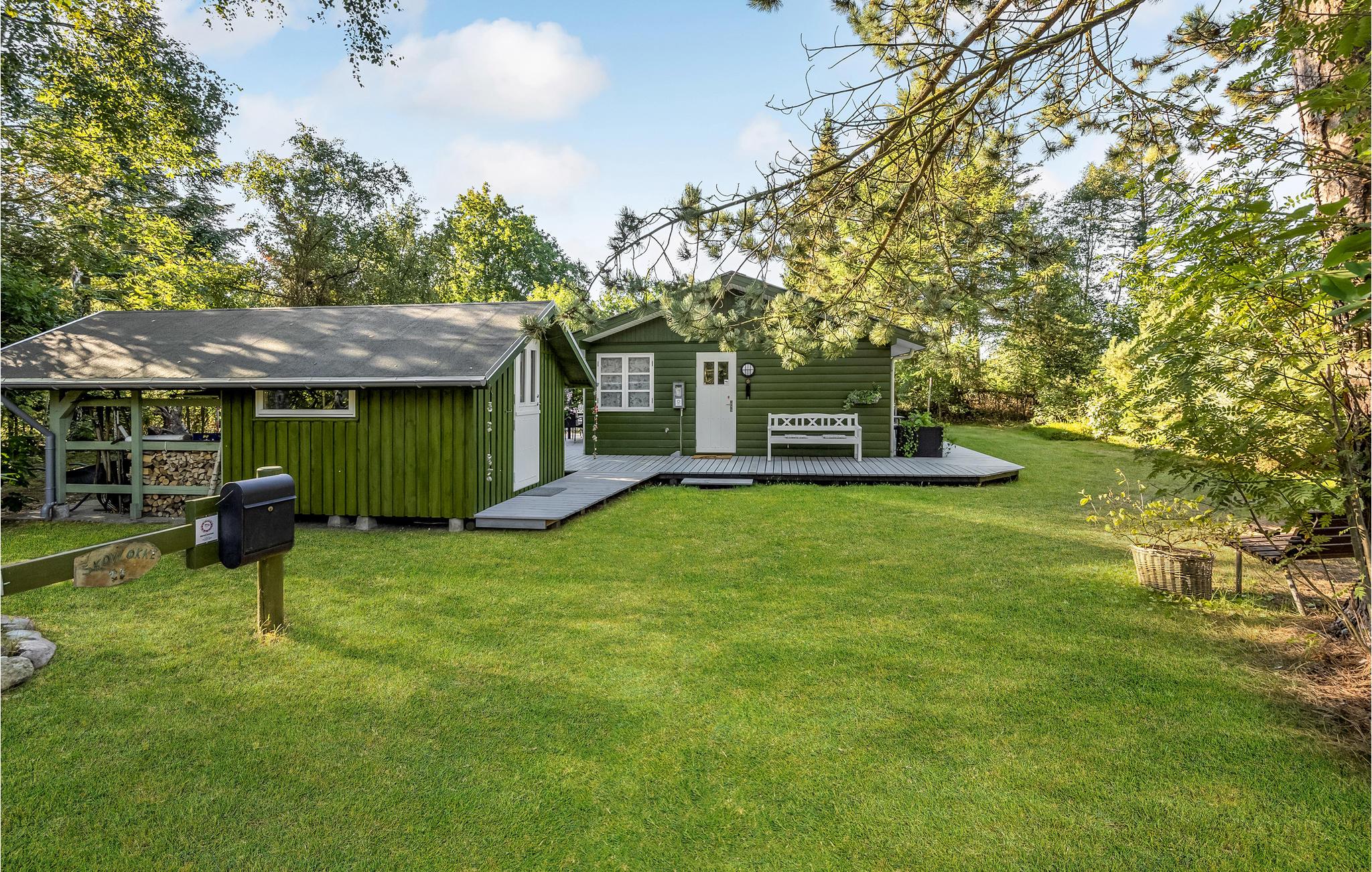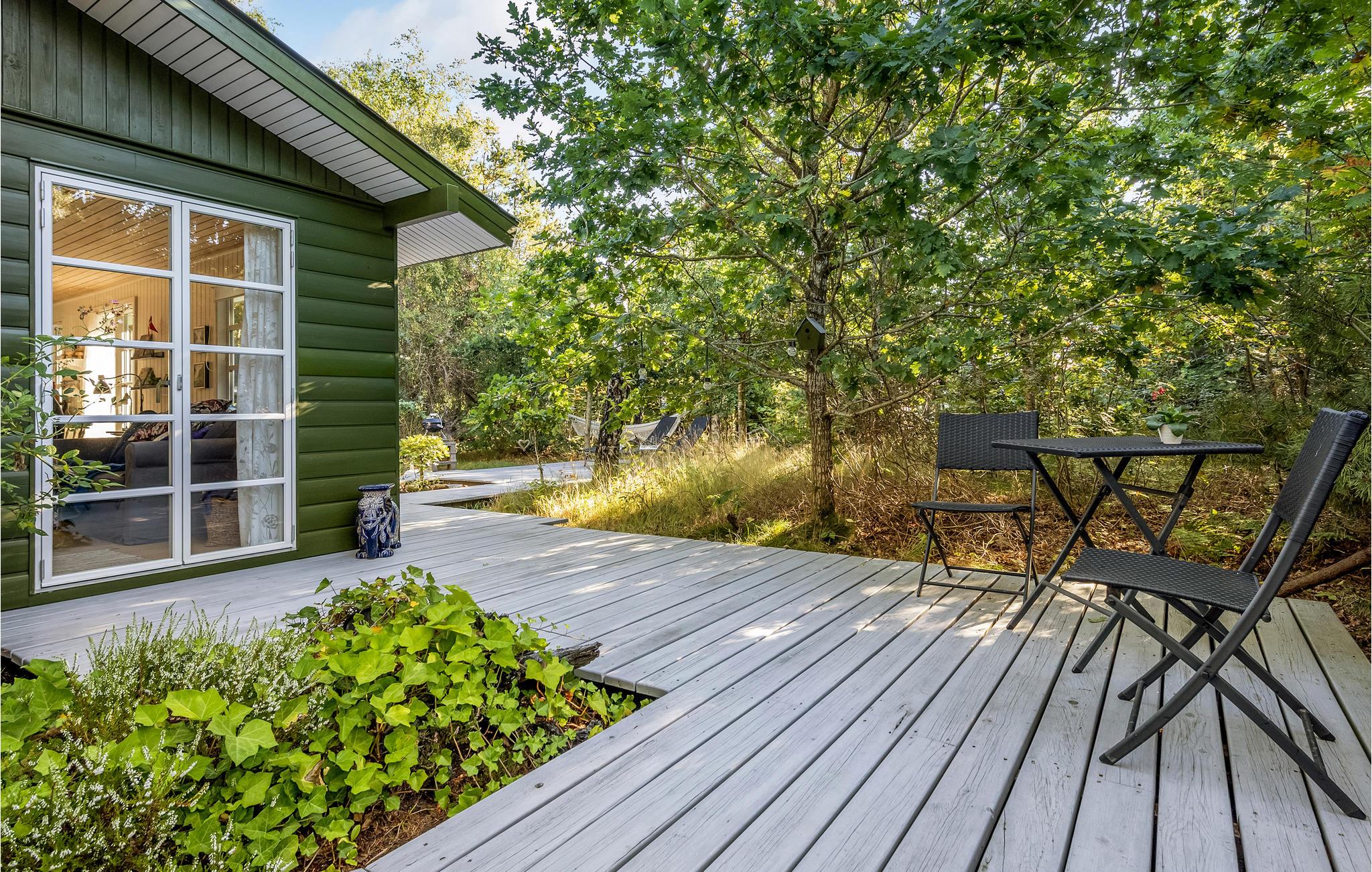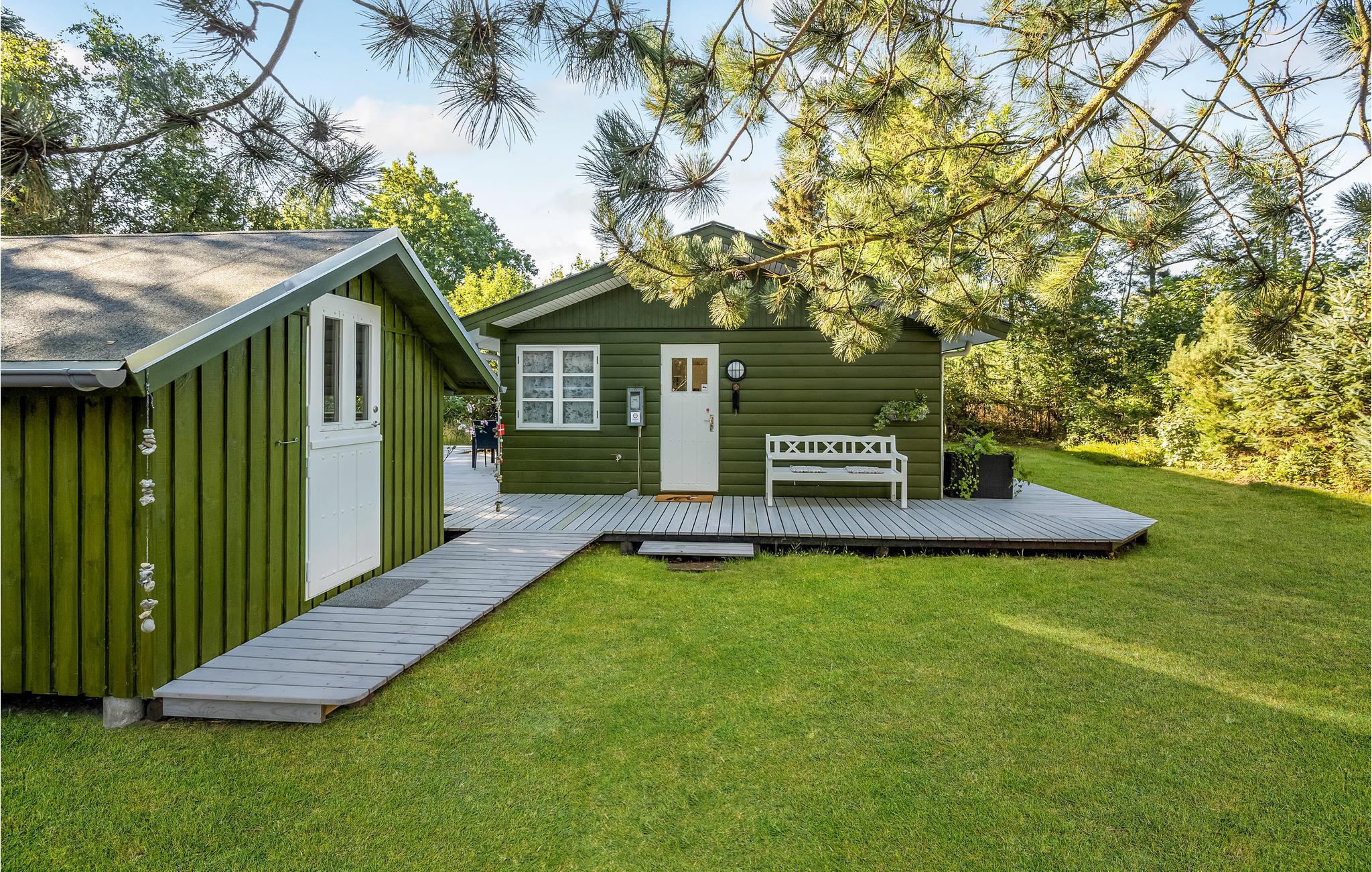 Dette charmerende, lille sommerhus ligger kun 100 m fra fjorden, og er omgivet af træer. Huset er velindrettet til 2 voksne og 1 barn med henholdsvis et soveværelse med 2 enkeltsenge og et ekstra værelse med en enkeltseng. Det lyse køkken ligger i åben forbindelse til stuen, og fra stuen er der 3 forskellige udgange til terrassen, der går hele vejen rundt om huset, og byder på flere forskellige lækroge. Som supplerende varmekilde har huset både en energibesparende varmepumpe samt en brændeovn, der giver hurtig opvarmning og skaber ekstra hygge efter en lang gåtur i det naturskønne område ved Nørhede-Øst. Det smukke betagende Vesterhav ligger også kun få minutters kørsel fra huset.