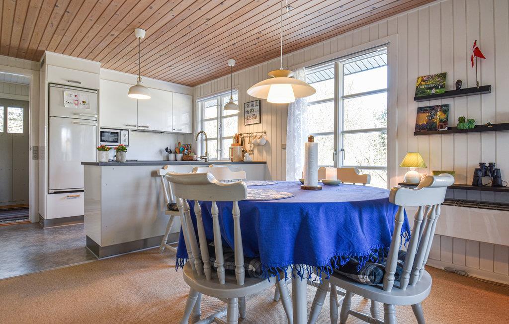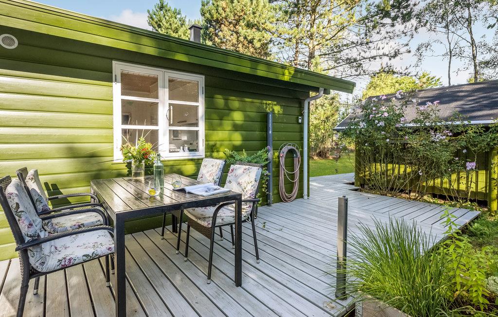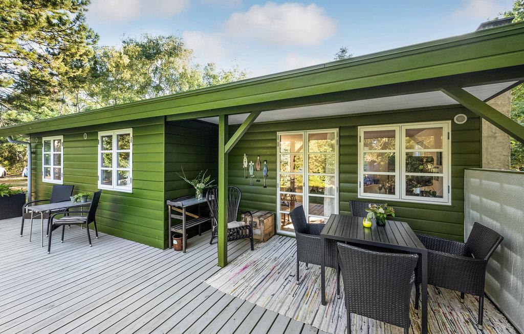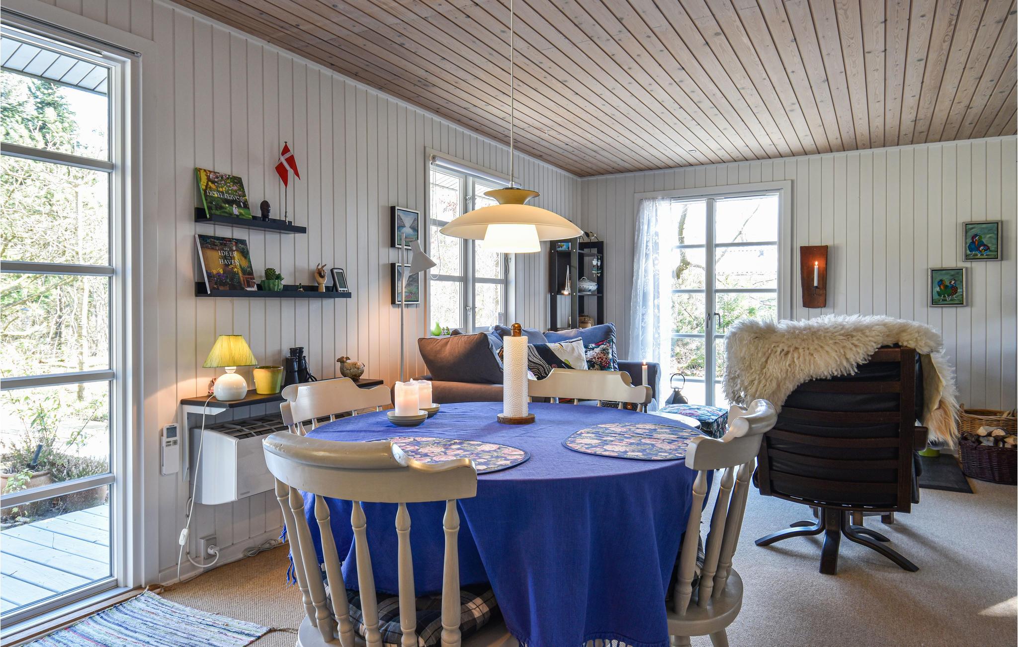 Dette charmerende, lille sommerhus ligger kun 100 m fra fjorden, og er omgivet af træer. Huset er velindrettet til 2 voksne og 1 barn med henholdsvis et soveværelse med 2 enkeltsenge og et ekstra værelse med en enkeltseng. Det lyse køkken ligger i åben forbindelse til stuen, og fra stuen er der 3 forskellige udgange til terrassen, der går hele vejen rundt om huset, og byder på flere forskellige lækroge. Som supplerende varmekilde har huset både en energibesparende varmepumpe samt en brændeovn, der giver hurtig opvarmning og skaber ekstra hygge efter en lang gåtur i det naturskønne område ved Nørhede-Øst. Det smukke betagende Vesterhav ligger også kun få minutters kørsel fra huset.