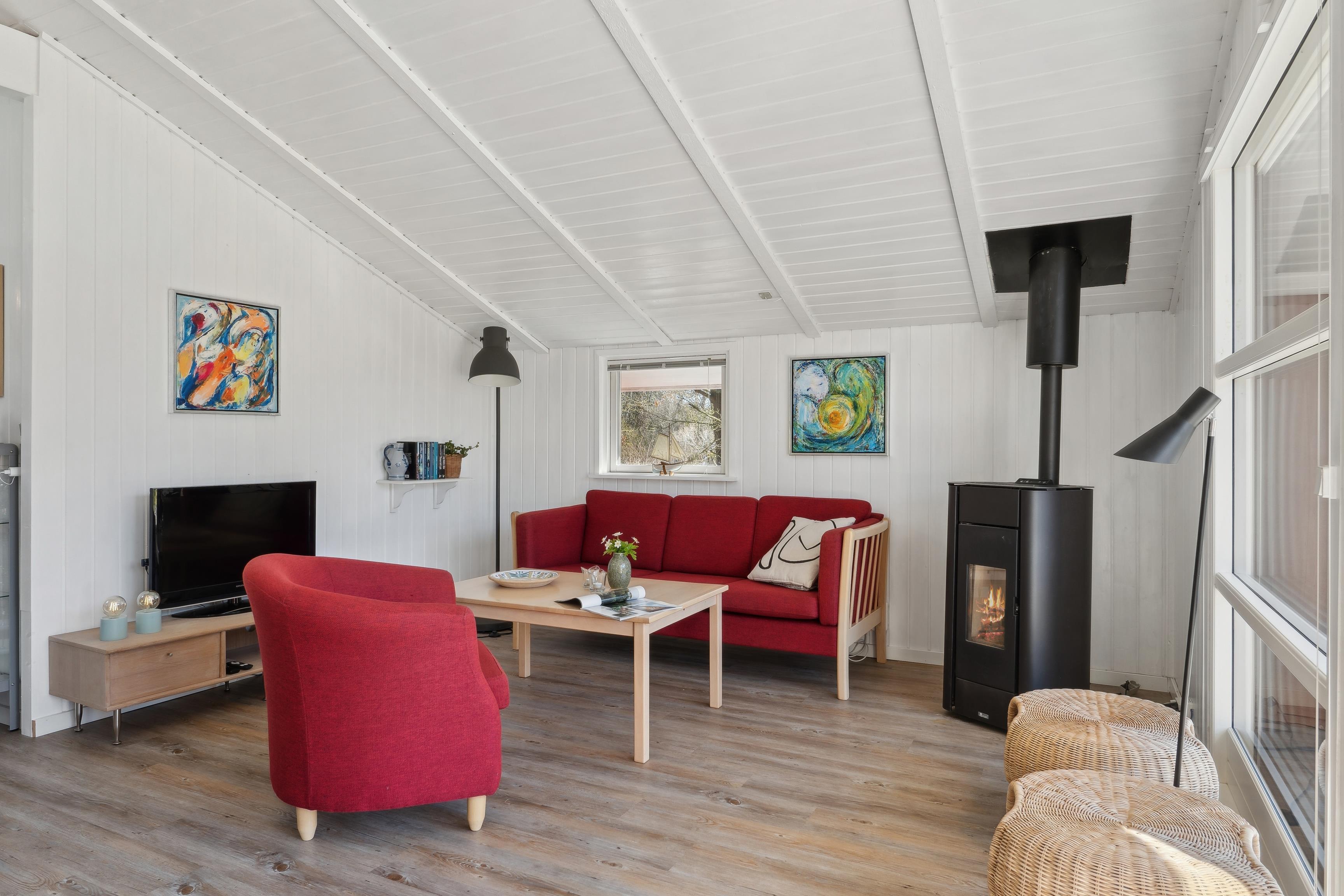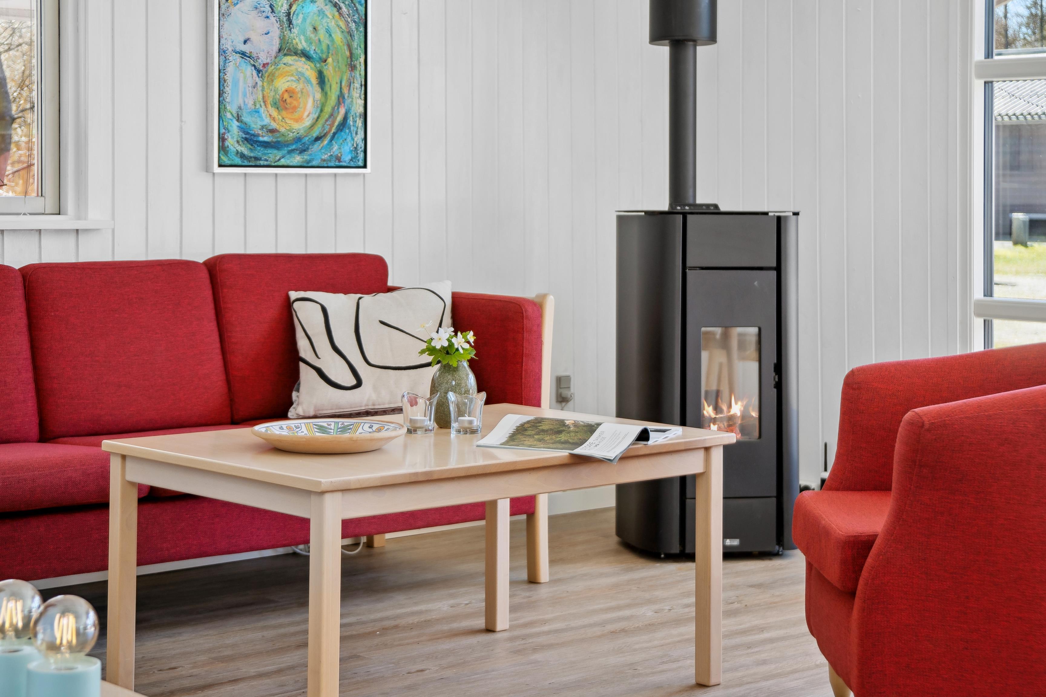 Hyggeligt rødt træsommerhus nær fjord og skov med moderne køkken og pilleovn i stuen.