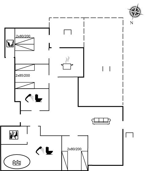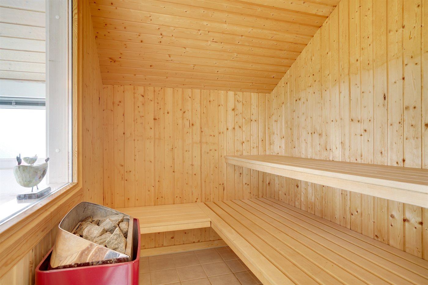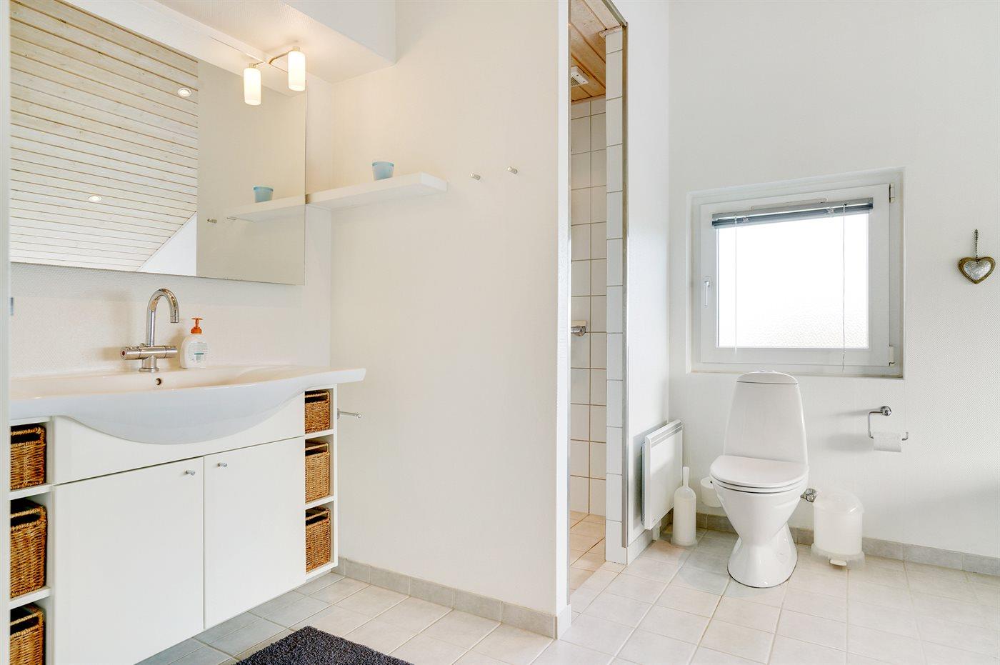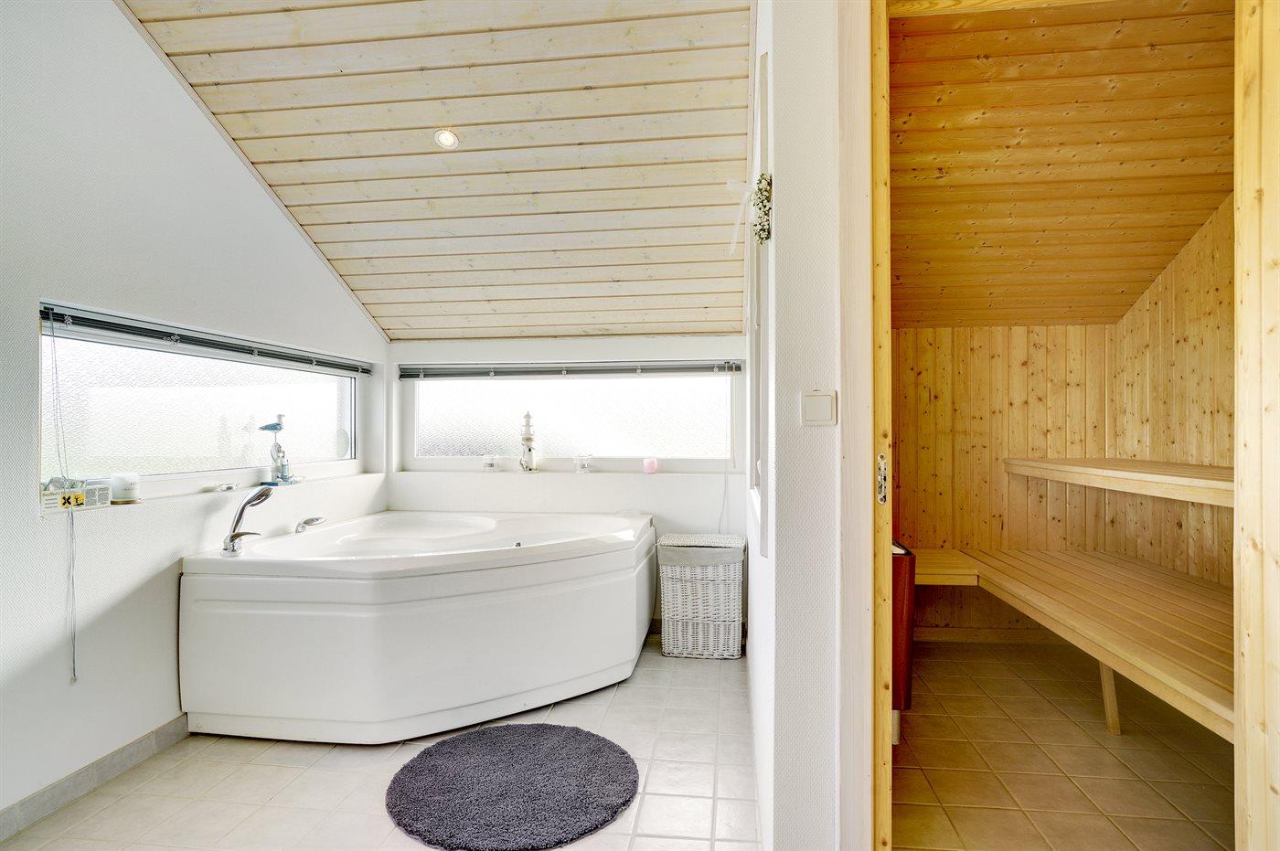 Der er 2 badeværelser med bruseniche og 2 toiletter. Der er gulvvarme på 2 badeværelser. I saunaen er der mulighed for afslapning.