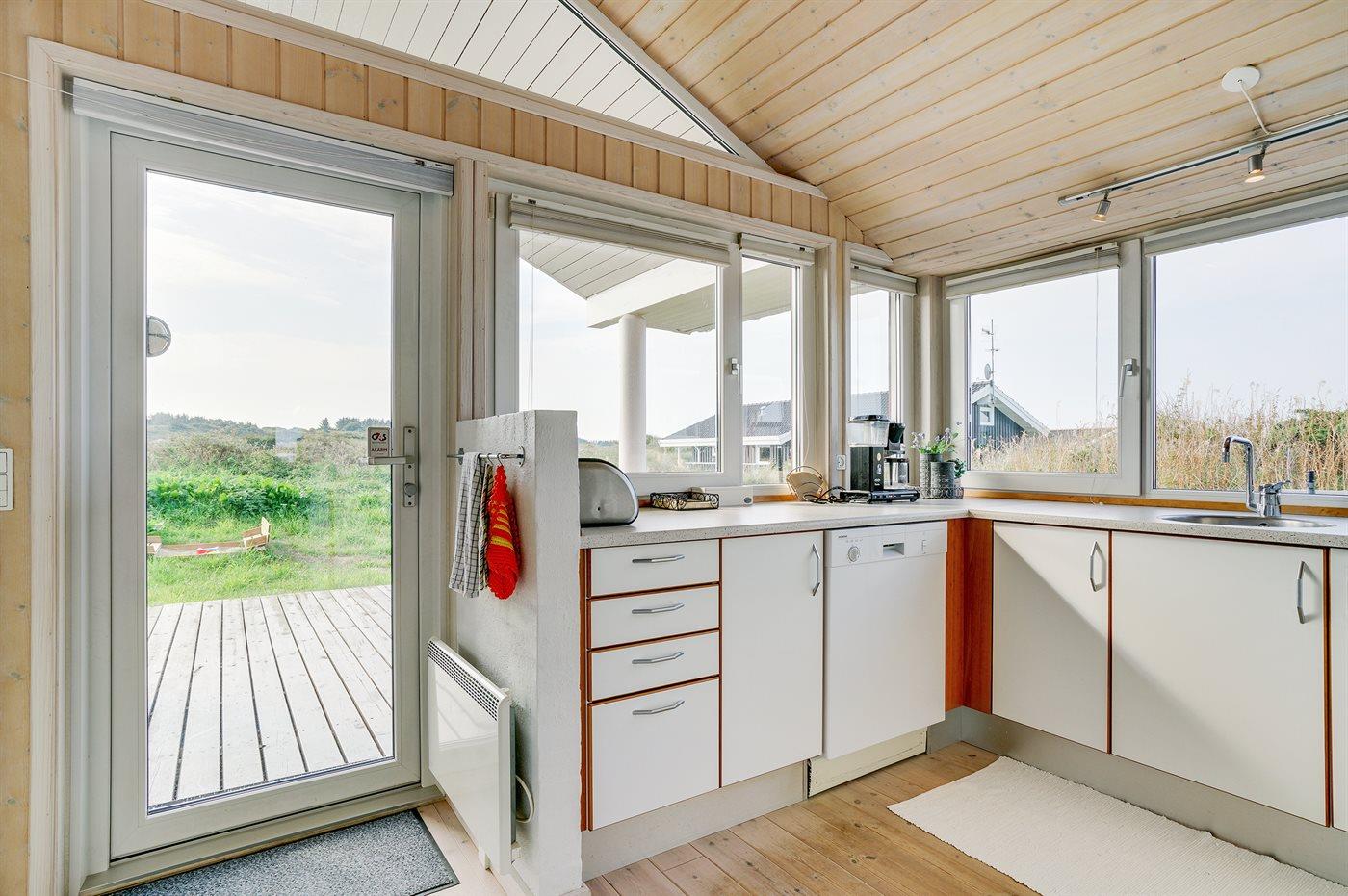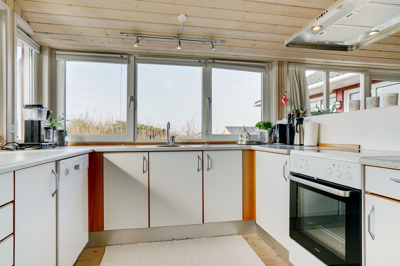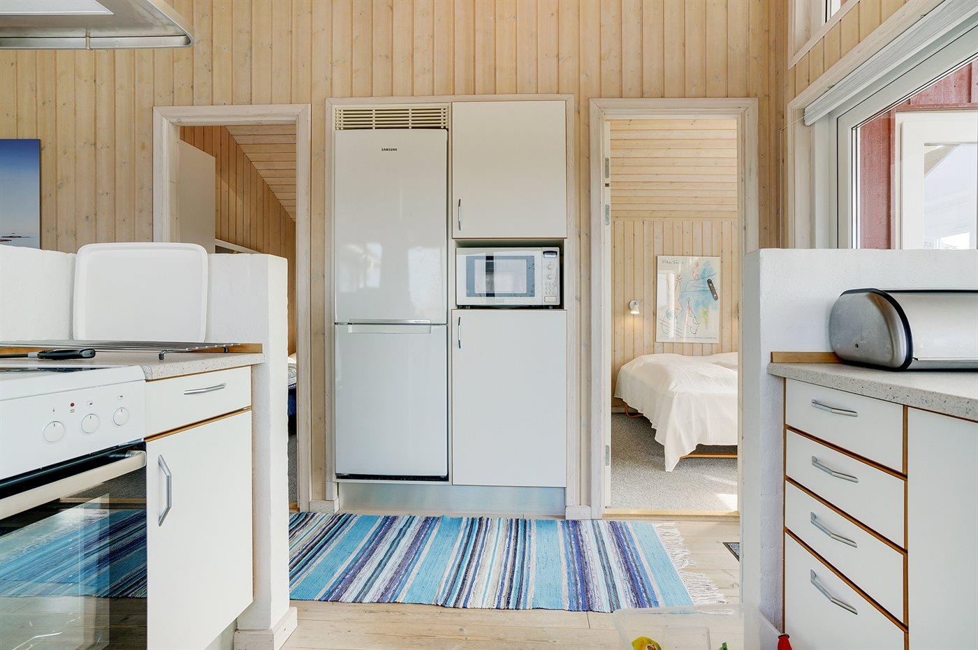 Køkkenet er udstyret med 1 køleskab. Der er 4 keramiske kogeplader, varmluftovn, mikrobølgeovn samt opvaskemaskine.