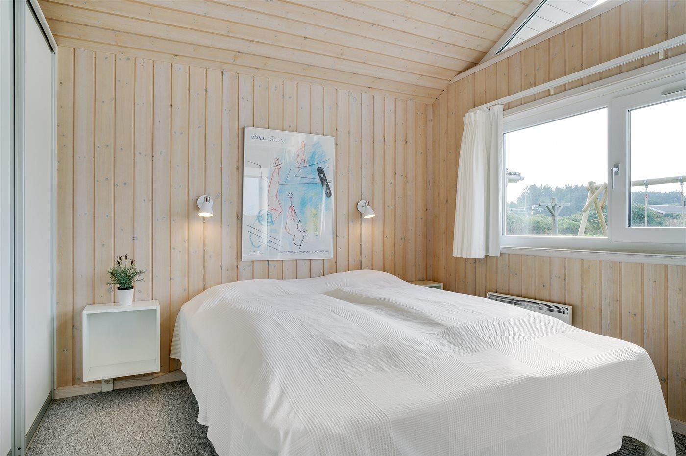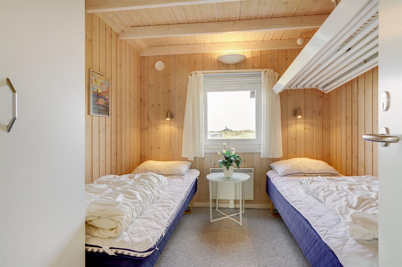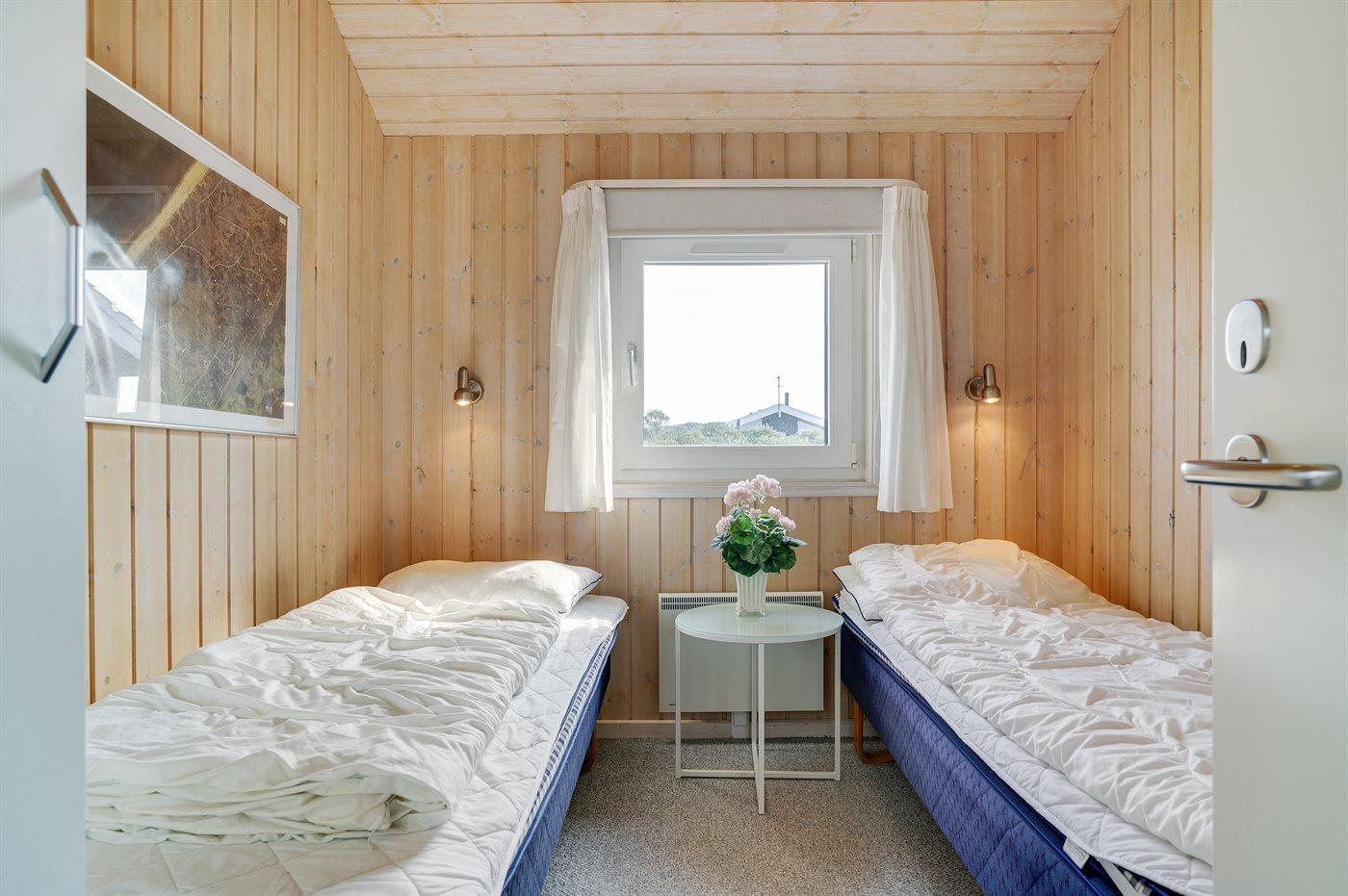 Der er i alt 3 soveværelser. Sovepladserne fordeler sig på: 2 sovepladser i dobbeltseng. 6 sovepladser i enkeltsenge. 2 af disse sovepladser befinder sig på husets hems. Derudover er der 1 stk. barneseng.