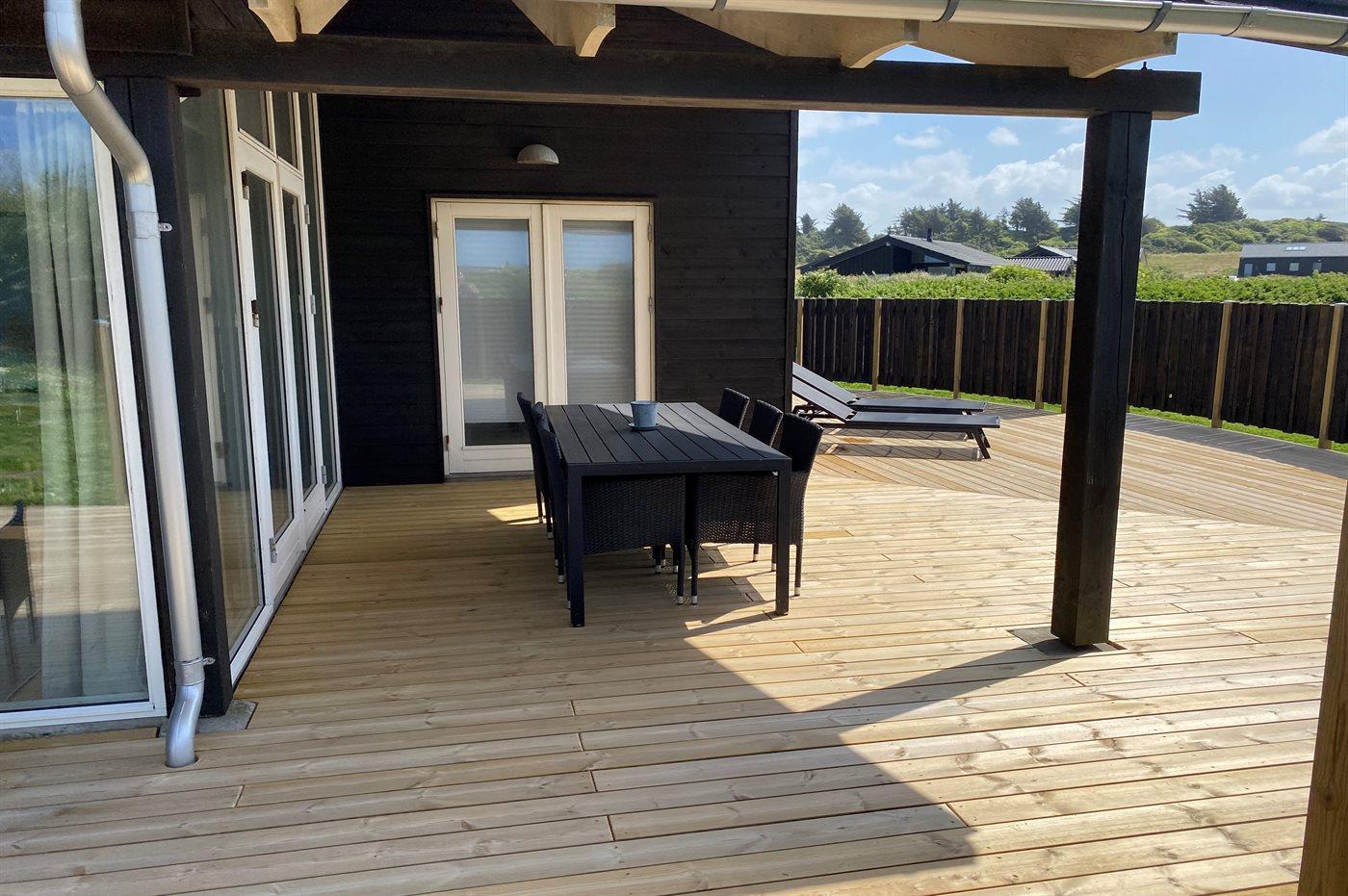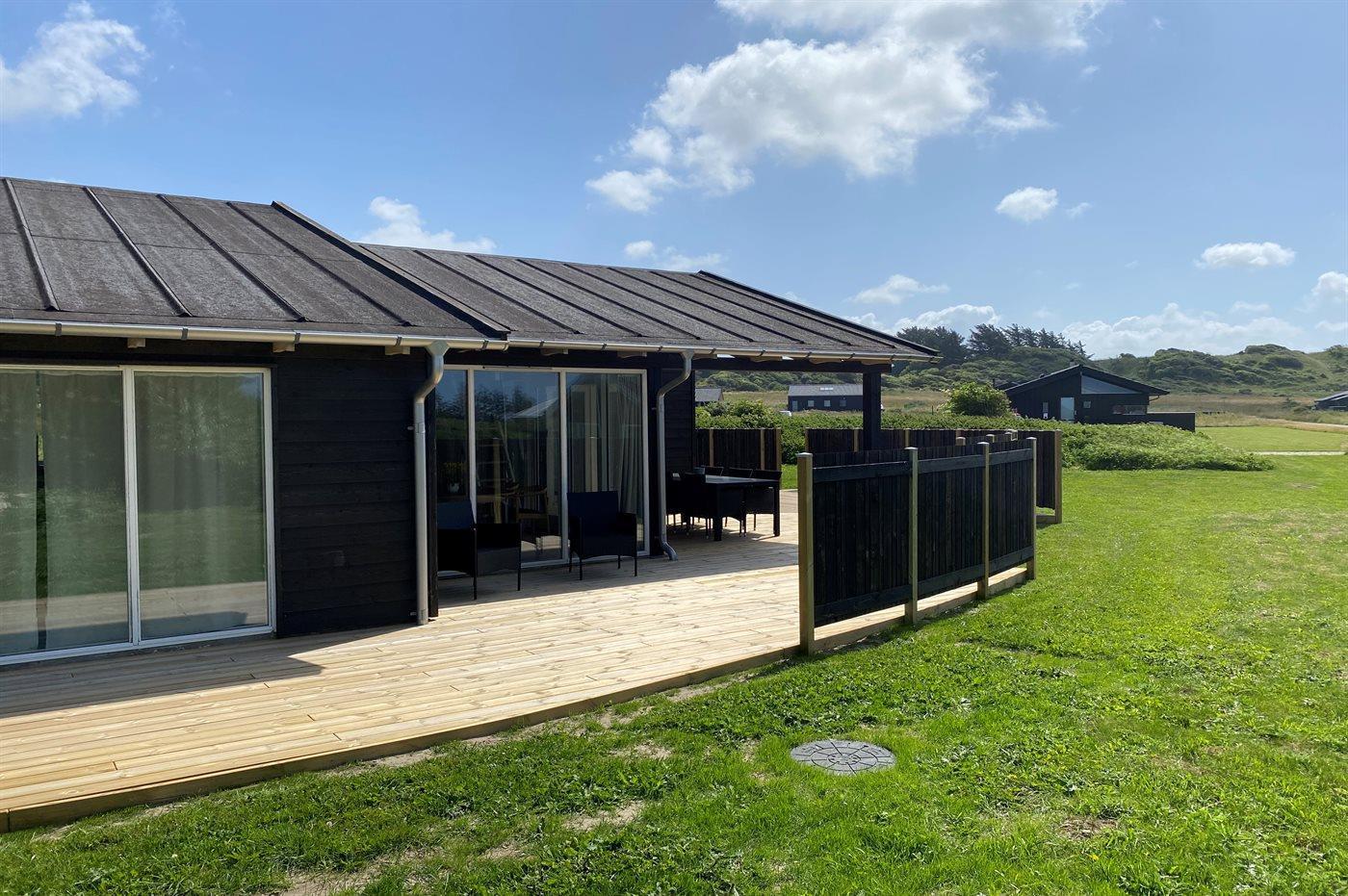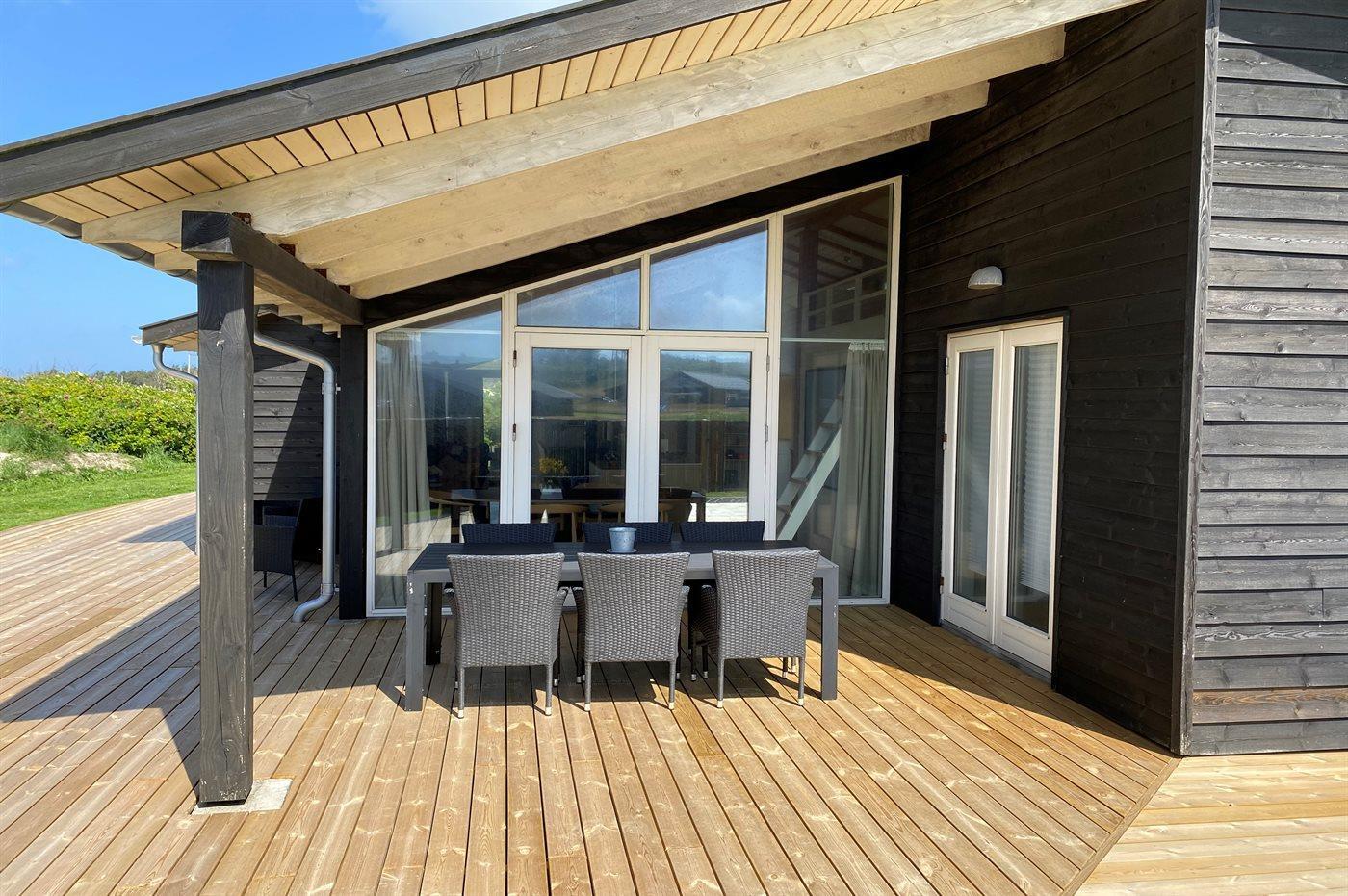Lyst og venligt luksussommerhus i træ, bygget i 2008, beliggende på en stor naturgrund 400 m fra en dejlig badestrand. Omkring huset er der 3 terrasser med havemøbler (såvel åbent som overdækket terrasseareal).