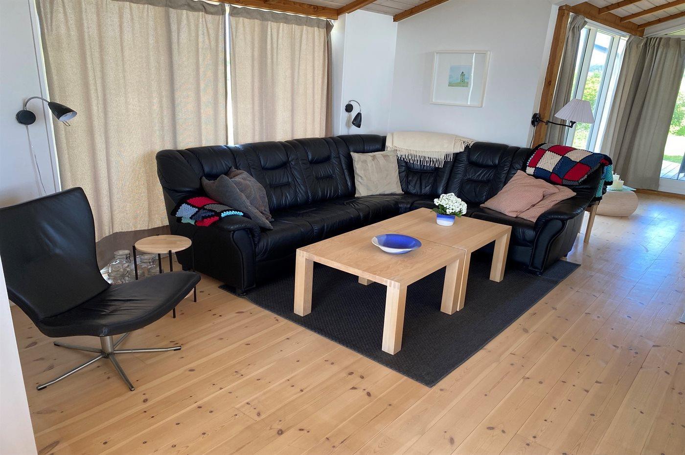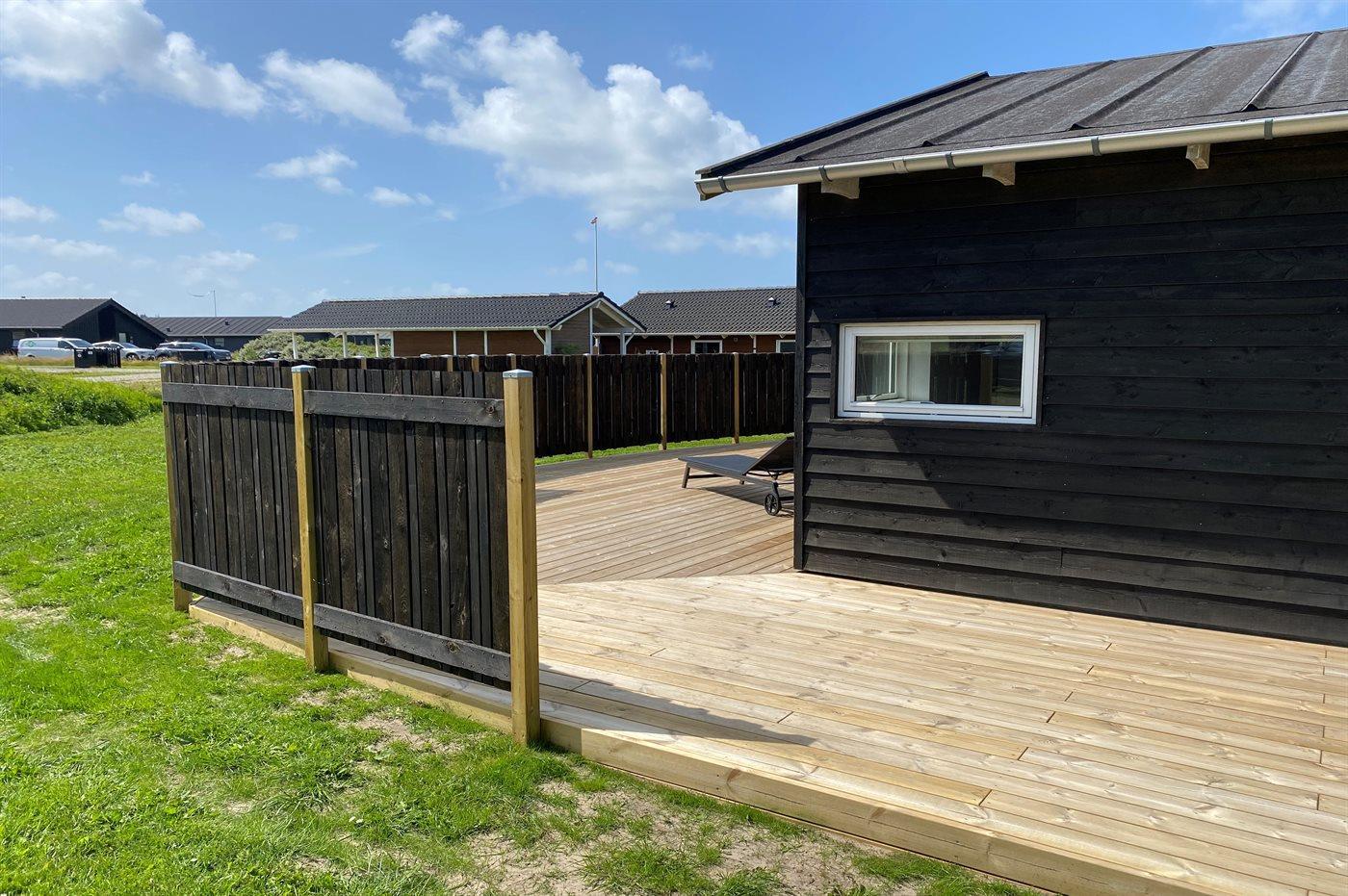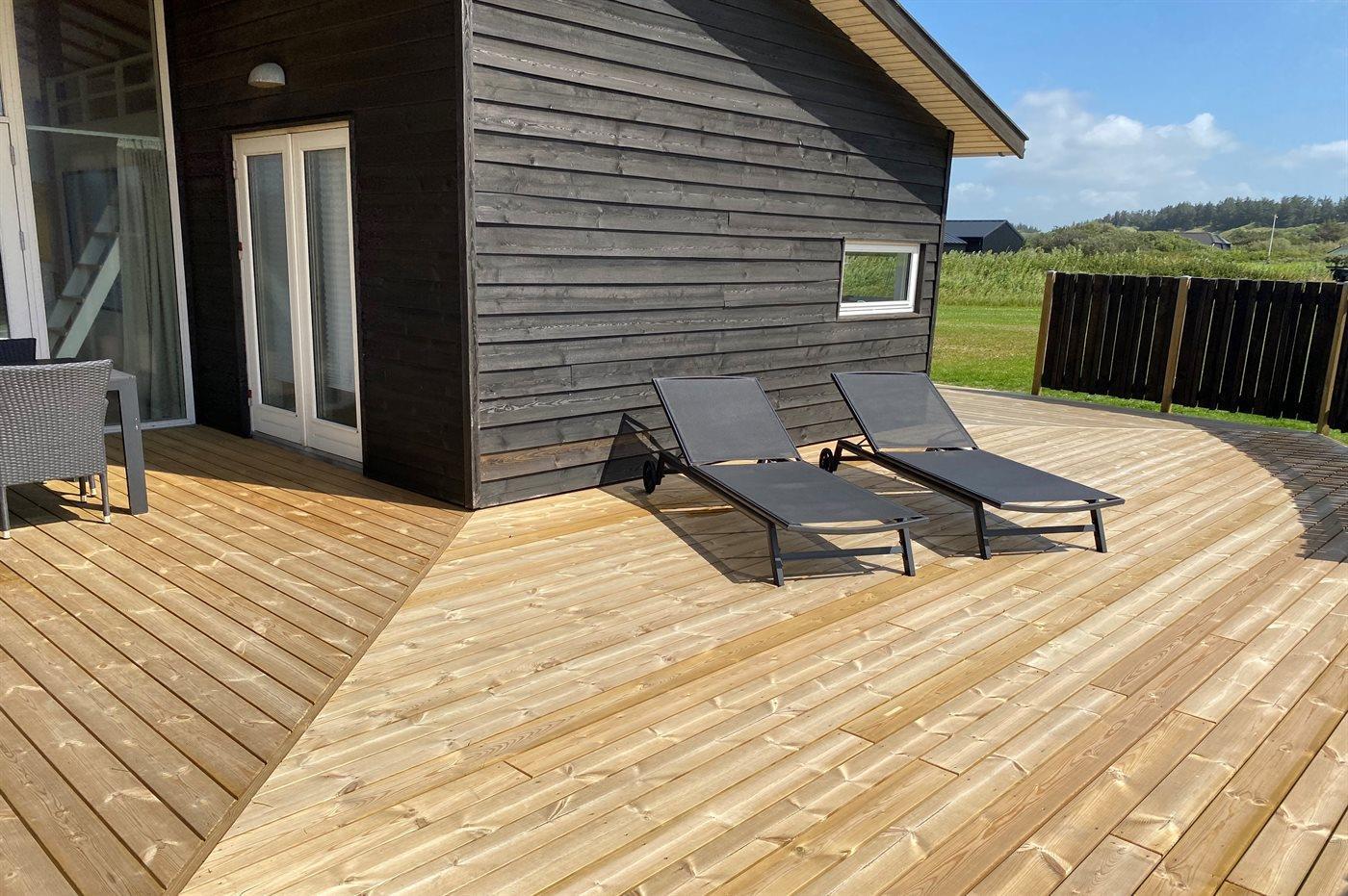 Lyst og venligt luksussommerhus i træ, bygget i 2008, beliggende på en stor naturgrund 400 m fra en dejlig badestrand. Omkring huset er der 3 terrasser med havemøbler (såvel åbent som overdækket terrasseareal).