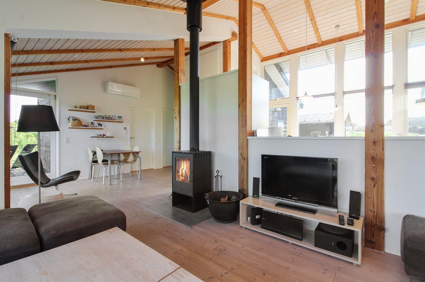 Lyst luksussommerhus i træ tæt på badestrand med spa, brændeovn og stor naturgrund i Nørlev.