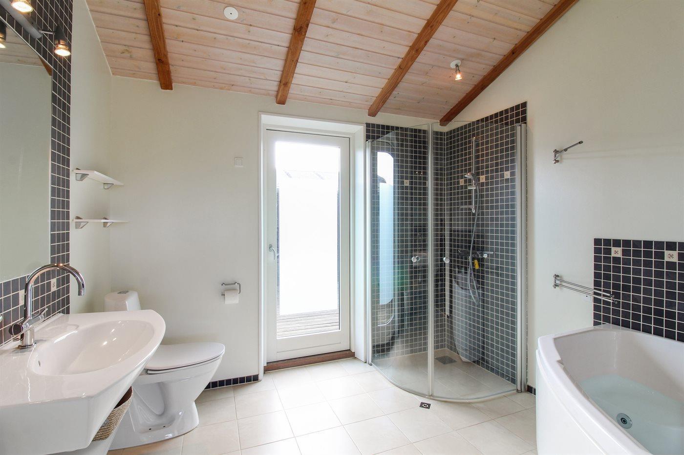 Der findes 2 dejlige badeværelser; 1 stort med gulvvarme, bruseniche og 2-pers. spa og 1 mindre med gulvvarme og bruseniche. Dejligt køkken med bl.a. varmluftovn, komfur med keramiske kogeplader, mikrobølgeovn, fryser og opvaskemaskine.