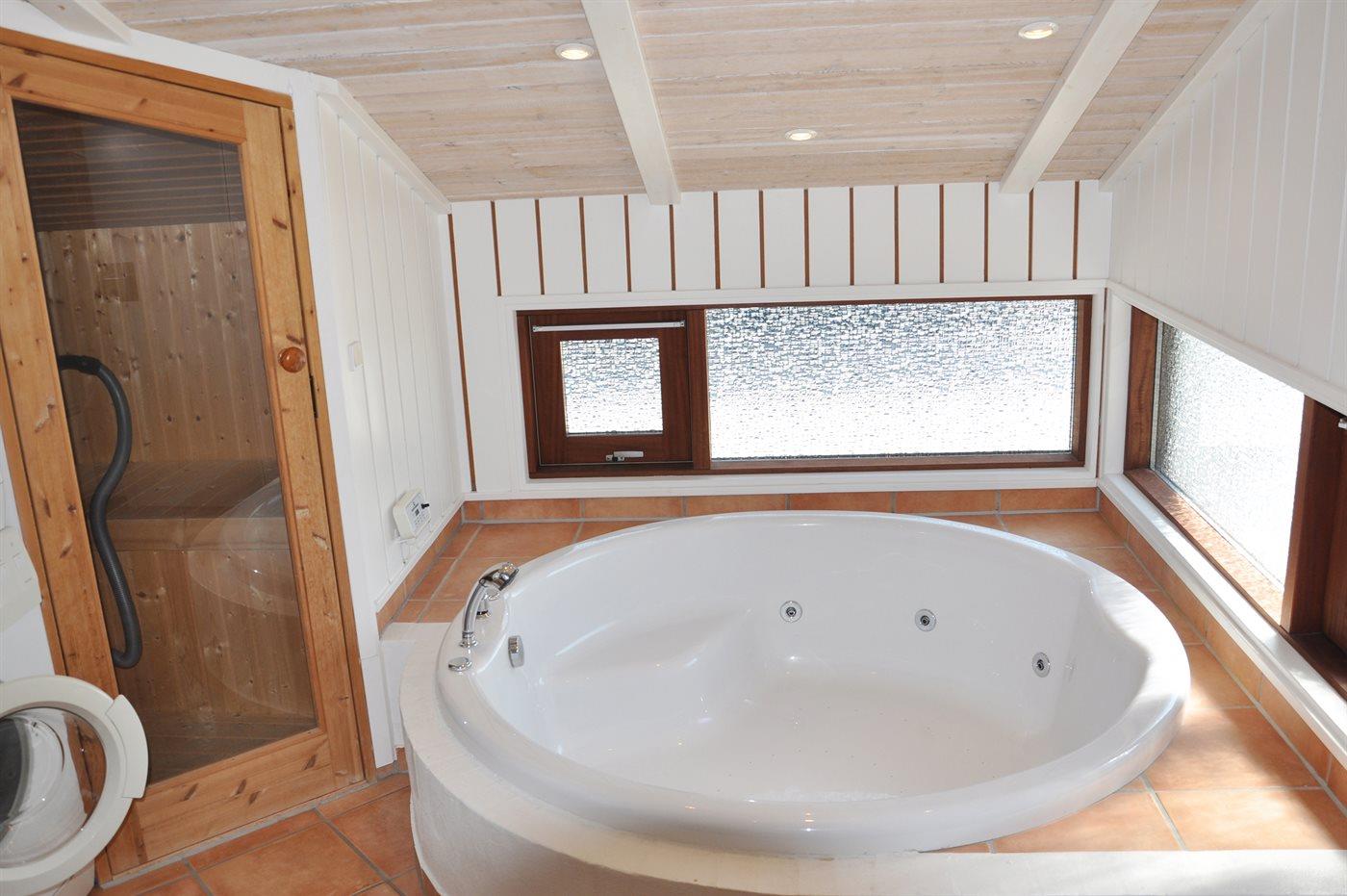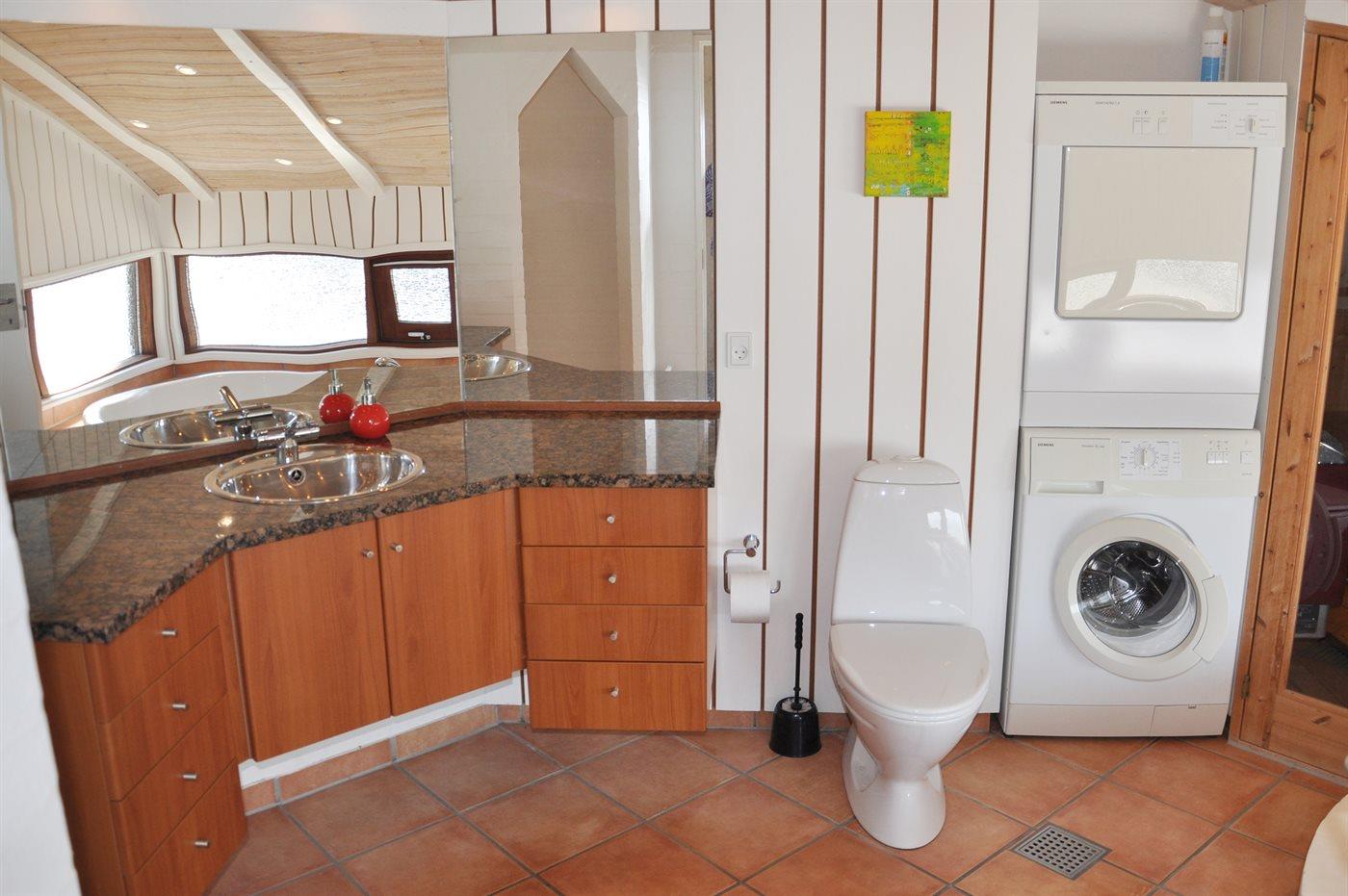 Der er 2 badeværelser med bruseniche og 2 toiletter. Der er gulvvarme på 2 badeværelser. I saunaen er der mulighed for afslapning.