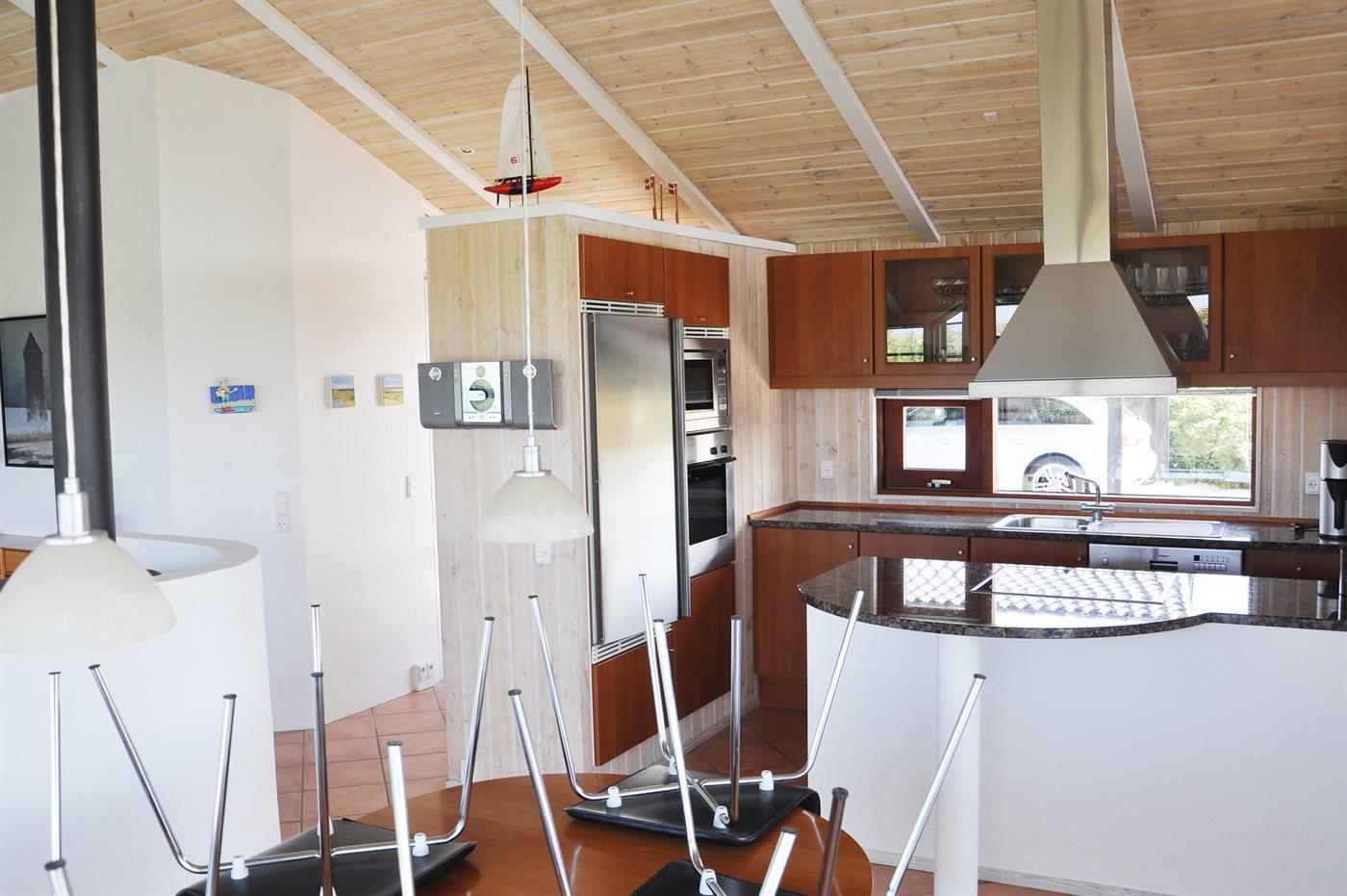 Køkkenet er udstyret med 1 køleskab. Der er 4 keramiske kogeplader, varmluftovn, mikrobølgeovn samt opvaskemaskine Der er gulvvarme i køkkenet.