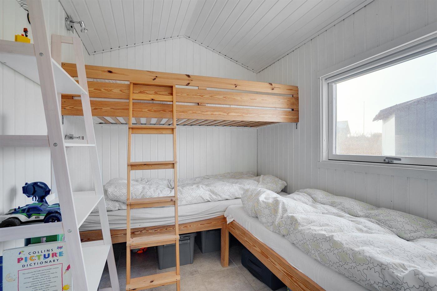 Der er i alt 2 soveværelser. Sovepladserne fordeler sig på: 2 sovepladser i dobbeltseng. 2 sovepladser i køjeseng. Derudover er der 1 stk. barneseng.
