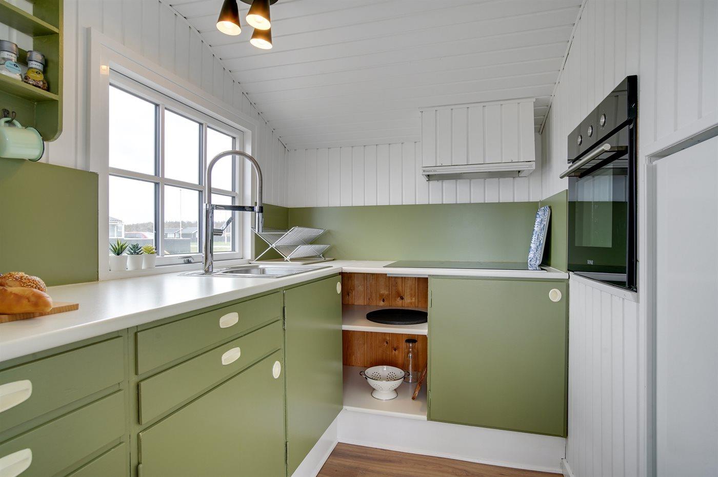 Køkkenet er udstyret med 1 køleskab. Der er 4 keramiske kogeplader, varmluftovn.