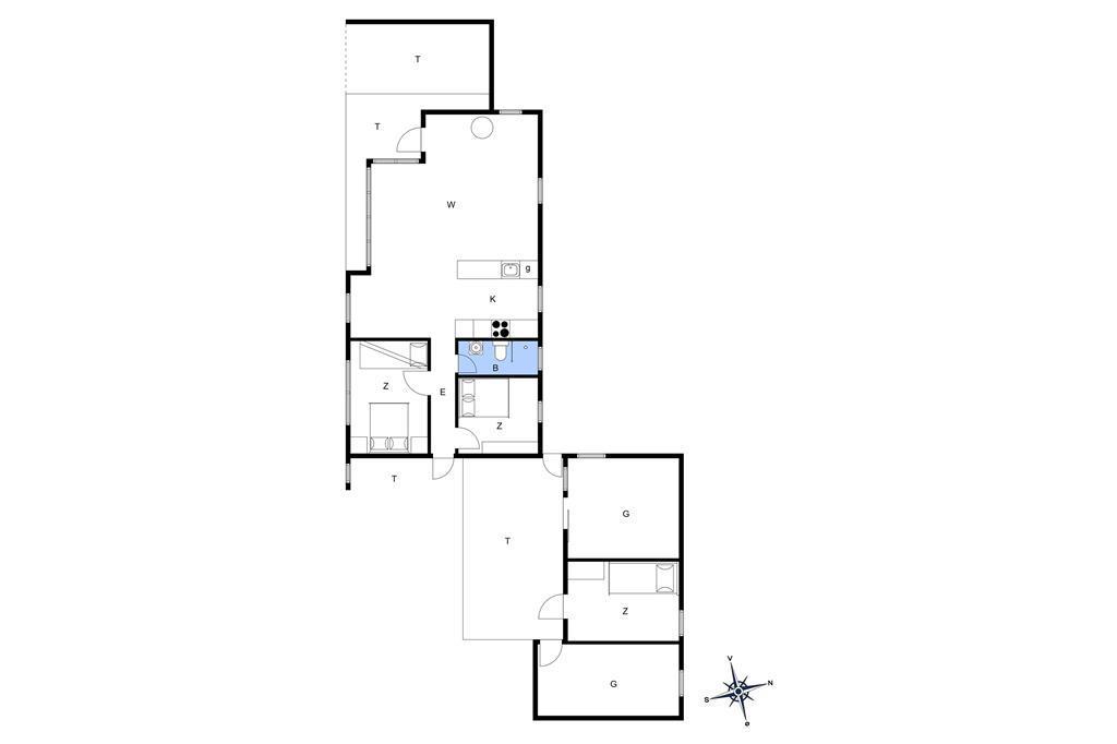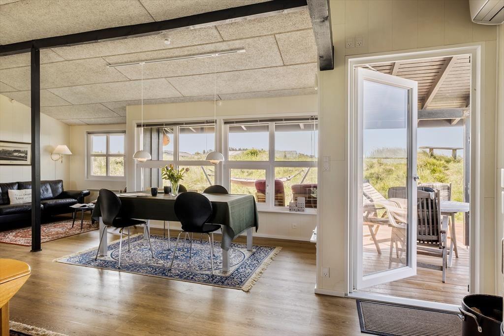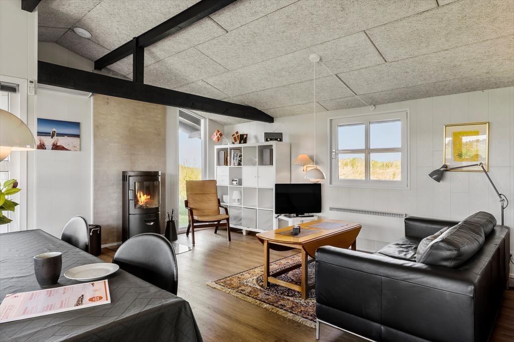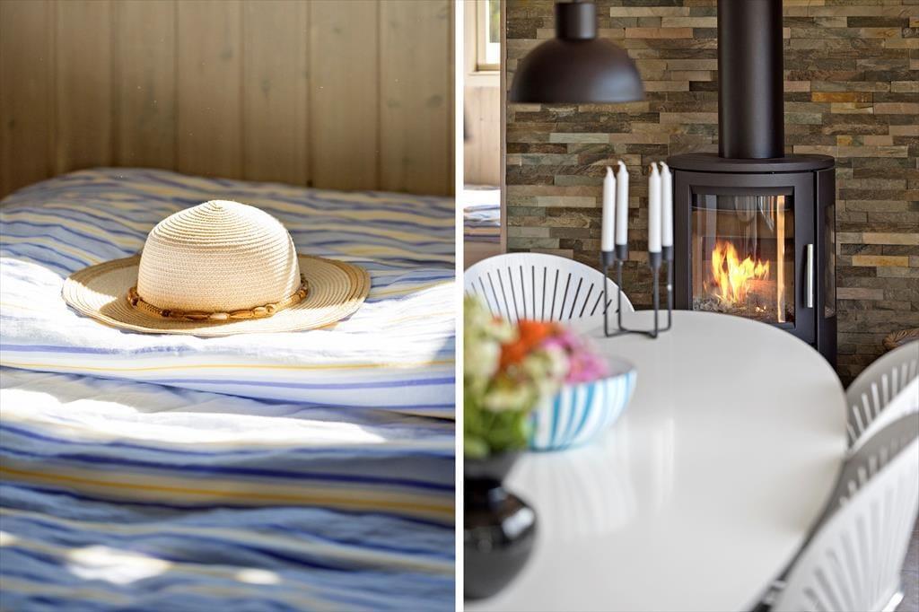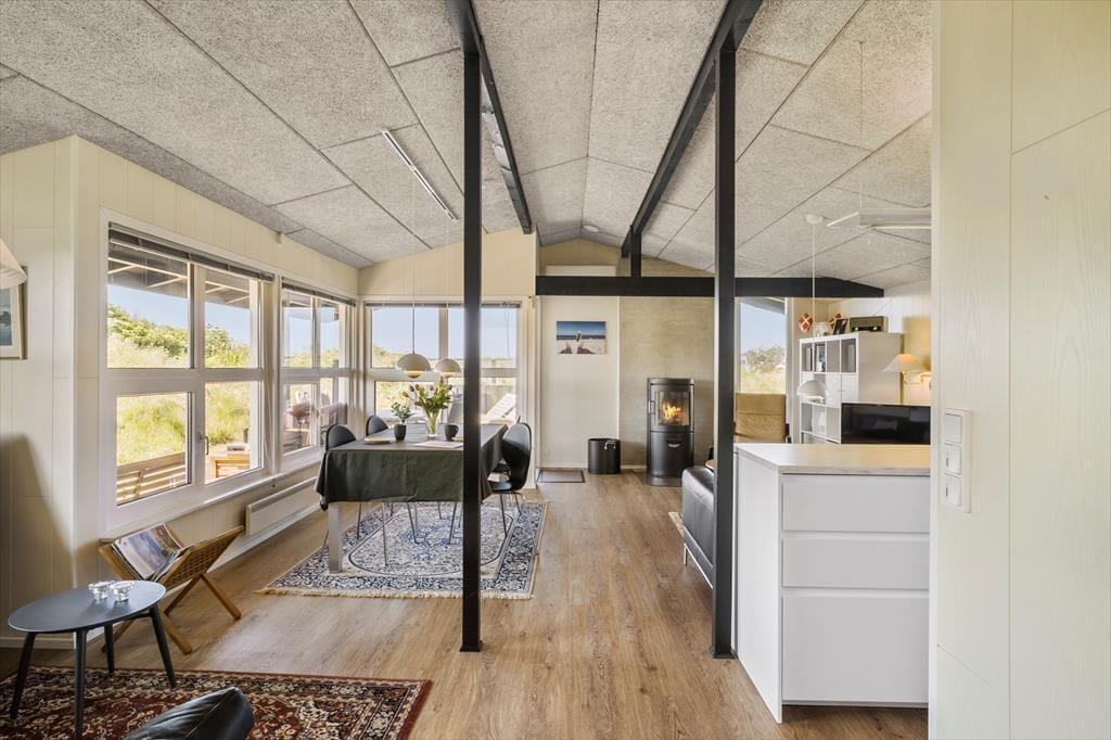 Sommerhuset, som blev renoveret i 2017, er lyst og smagfuldt indrettet. Det centrale rum i huset er det åbne køkken-alrum, der med sin gode størrelse indbyder til, at hele familien samles her – hvad enten man er i gang med madlavningen i køkkenet, læser en god bog foran brændeovnen eller ser fjernsyn fra sofaen. Inde i huset er der to gode, store soveværelser, det ene med en dobbeltseng og det andet med både en dobbeltseng og en køjeseng. Huset har et mindre, men pænt badeværelse med bruseniche. Der er desuden et anneks med en ekstra soveplads.