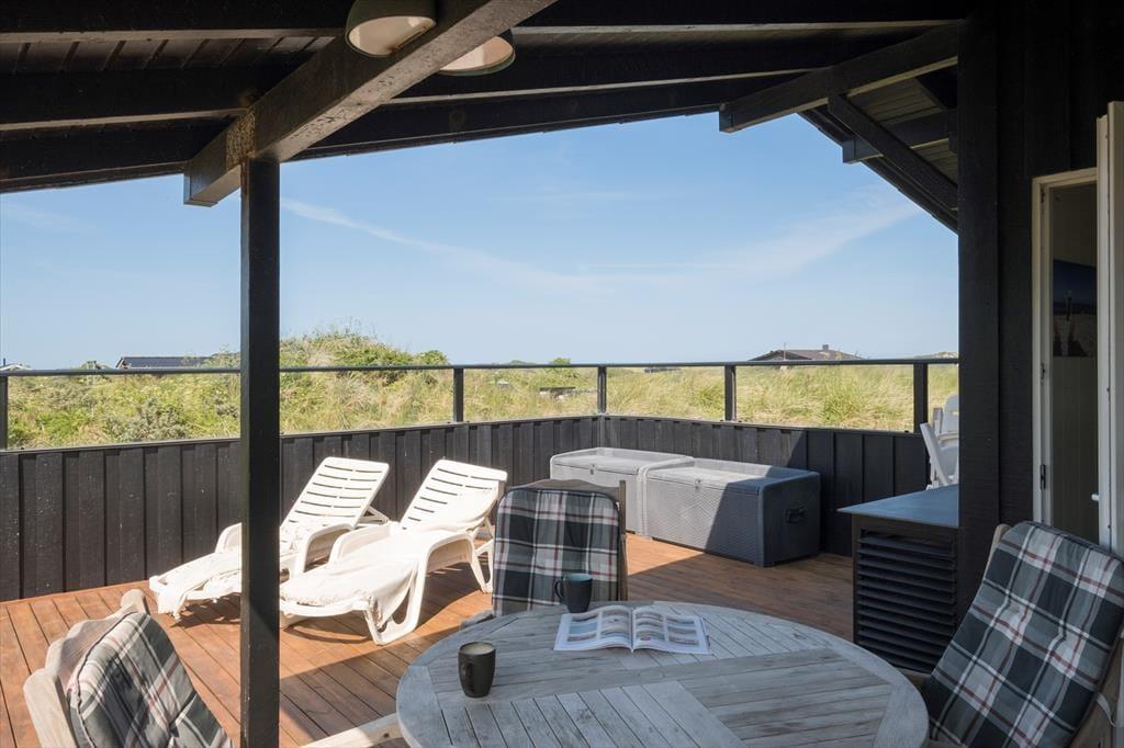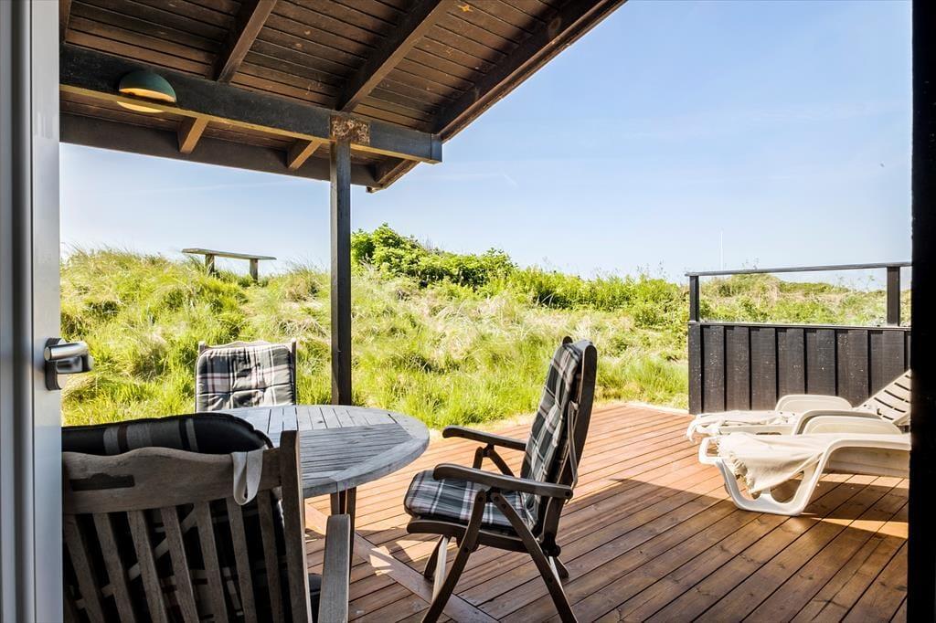 Der er fine terrasser på flere af husets sider, så der er god mulighed for at finde både sol og læ. Der er direkte udgang fra køkken-alrummet til terrassen, og der hører også en grill til huset, så det er nemt at forestille sig, at man kunne nyde flere af feriens måltider udendørs.