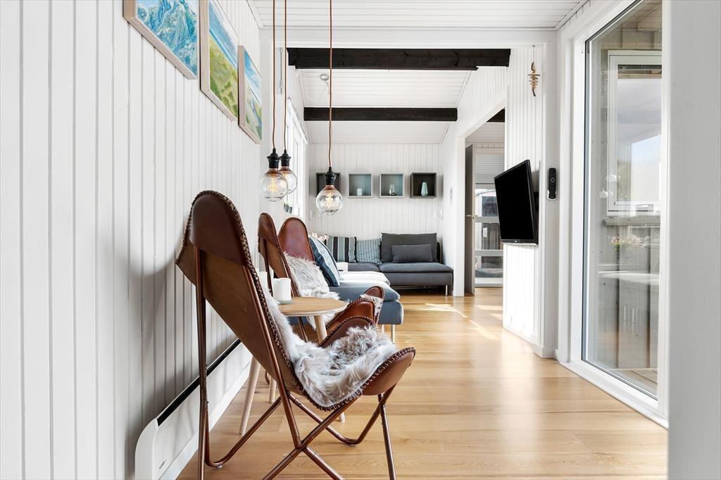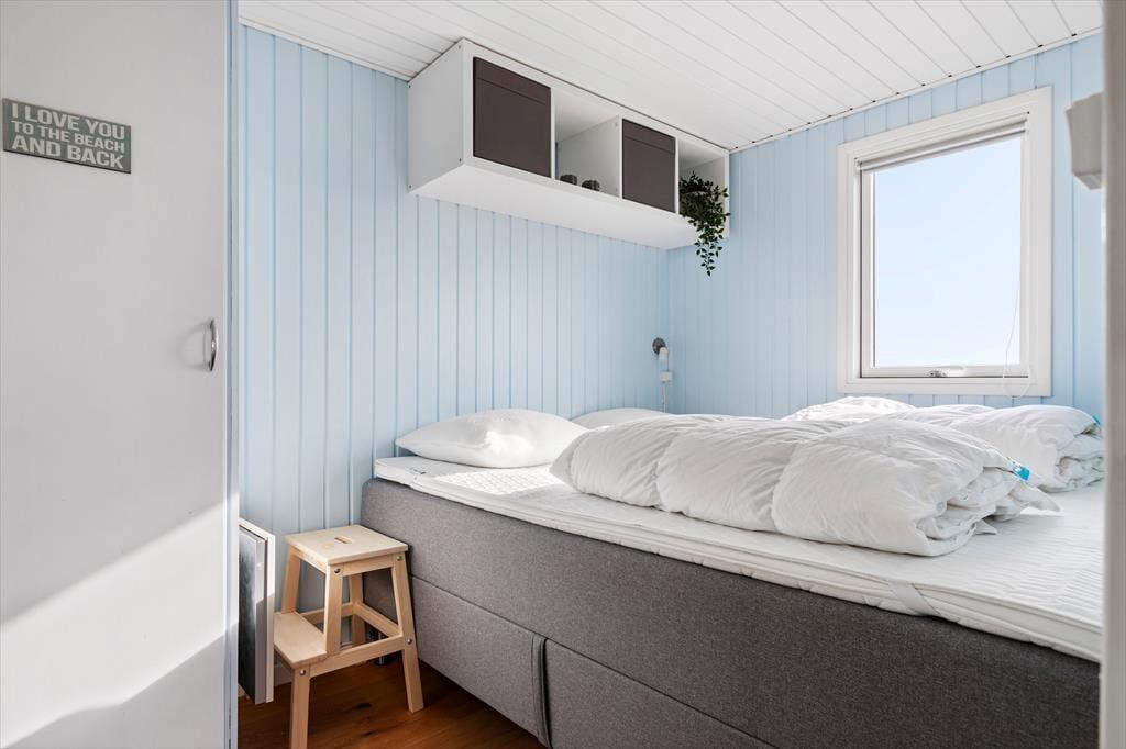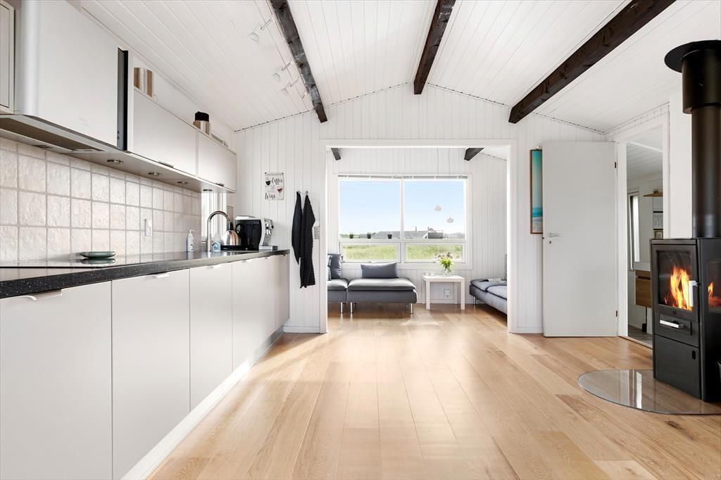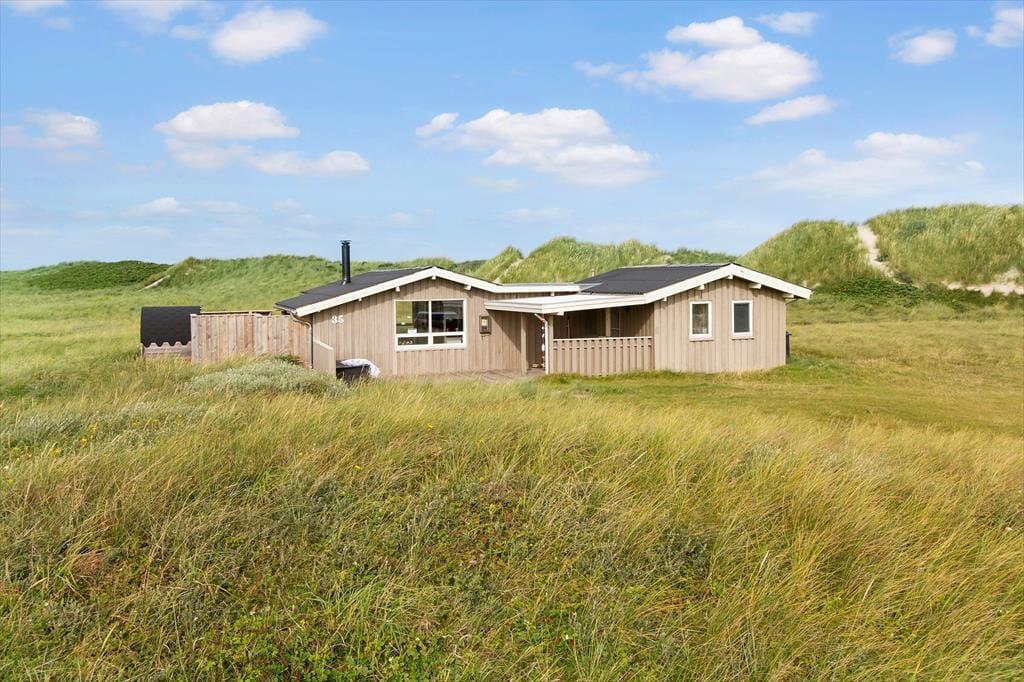 Farvetonerne er lyse, og solen kigger ind gennem husets store vinduer, mens det smukke klitlandskab byder sig til lige udenfor. Omgivelserne er med andre ord med til at skabe en rar og fredfyldt ferieatmosfære, og rummenes pæne og komfortable møblement bidrager ligeledes hertil. Køkkenet har en hyggelig spiseplads og er endda udstyret med en brændeovn til eventuelle kølige aftener, og i stueafdelingen er der rare sofaer og et fladskærms-tv, så underholdningen er sikret. Fra det pæne brusebadeværelse har du direkte adgang til en ugeneret terrasse med sauna, hvis du virkelig skal slappe af, og når det er sengetid, kan du se frem til at sove godt og længe på et af de to værelser. Bemærk, at køjesengene på det ene soveværelse passer bedst til børn, så sommerhuset egner sig godt til en familieferie – eller til nogle dejlige dage med din eneste ene