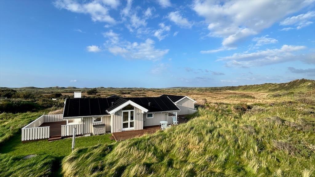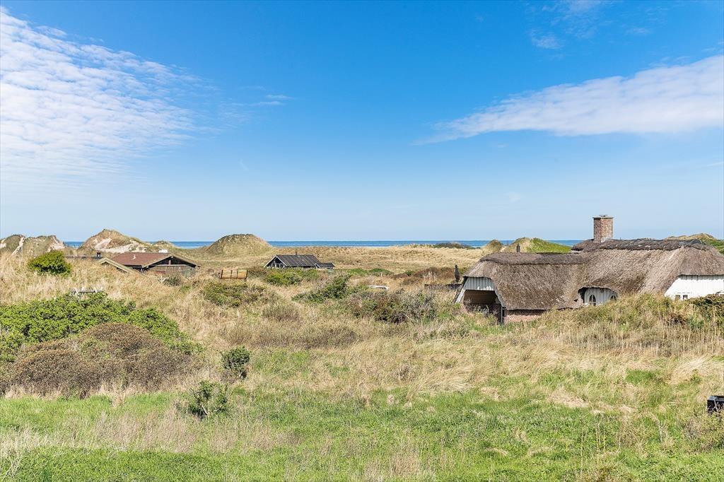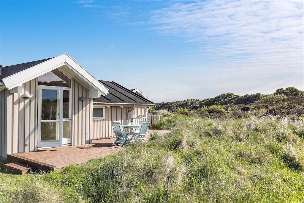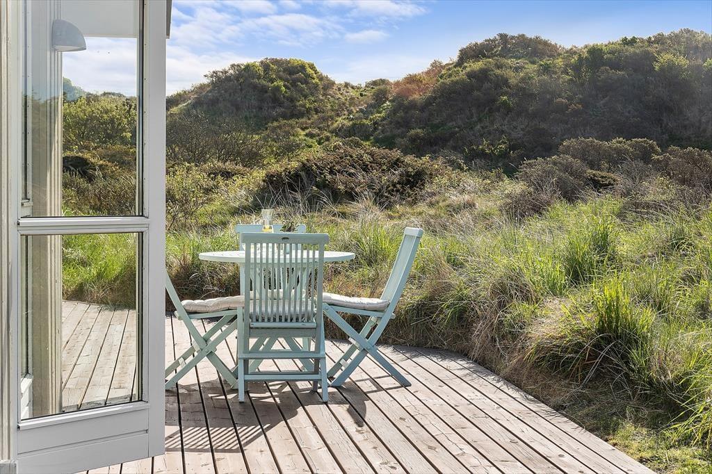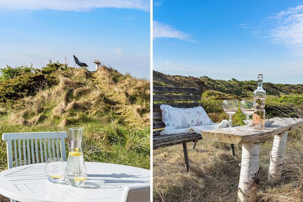 Udenfor venter en skøn naturgrund, der indbyder til ro og fordybelse. Herfra er der en smuk udsigt ud over det fredede areal, som omkranser sommerhuset og giver en sjælden følelse af privatliv og nærvær med naturen. På en lille bakke på grunden finder du en hyggelig bænk – det perfekte sted at nyde en kop kaffe eller et glas vin, mens du ser ud over klitterne og havkigget i horisonten. Solnedgangene her er noget helt særligt og forvandler aftenen til et smukt og fredfyldt øjeblik. Og som prikken over i’et kan du næsten dagligt opleve rådyr, der roligt krydser grunden – en lille, magisk påmindelse om, hvor tæt du er på naturen.