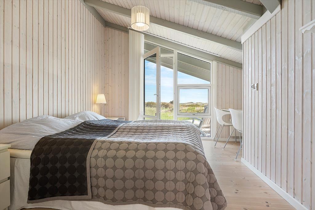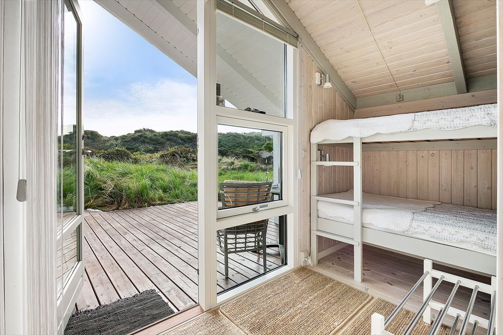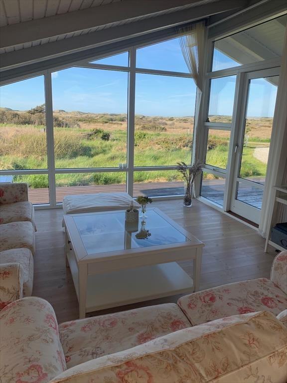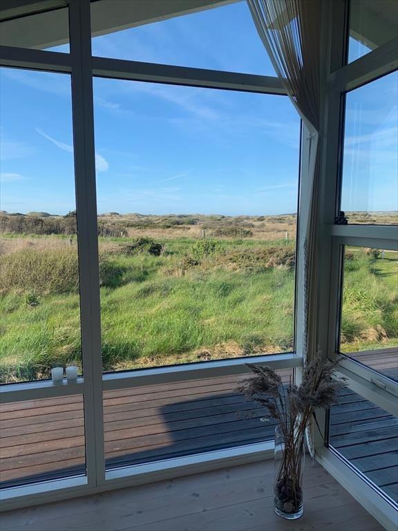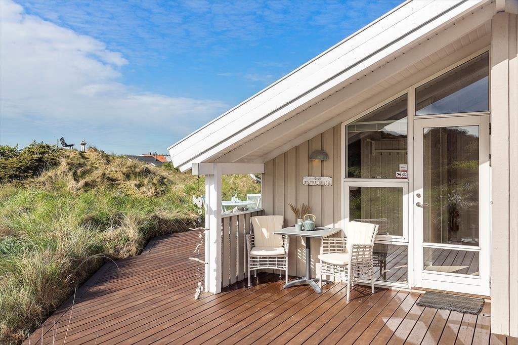 Udenfor venter en skøn naturgrund, der indbyder til ro og fordybelse. Herfra er der en smuk udsigt ud over det fredede areal, som omkranser sommerhuset og giver en sjælden følelse af privatliv og nærvær med naturen. På en lille bakke på grunden finder du en hyggelig bænk – det perfekte sted at nyde en kop kaffe eller et glas vin, mens du ser ud over klitterne og havkigget i horisonten. Solnedgangene her er noget helt særligt og forvandler aftenen til et smukt og fredfyldt øjeblik. Og som prikken over i’et kan du næsten dagligt opleve rådyr, der roligt krydser grunden – en lille, magisk påmindelse om, hvor tæt du er på naturen.