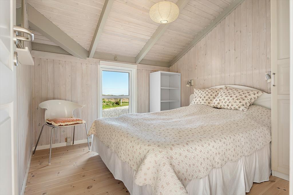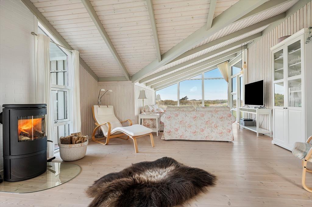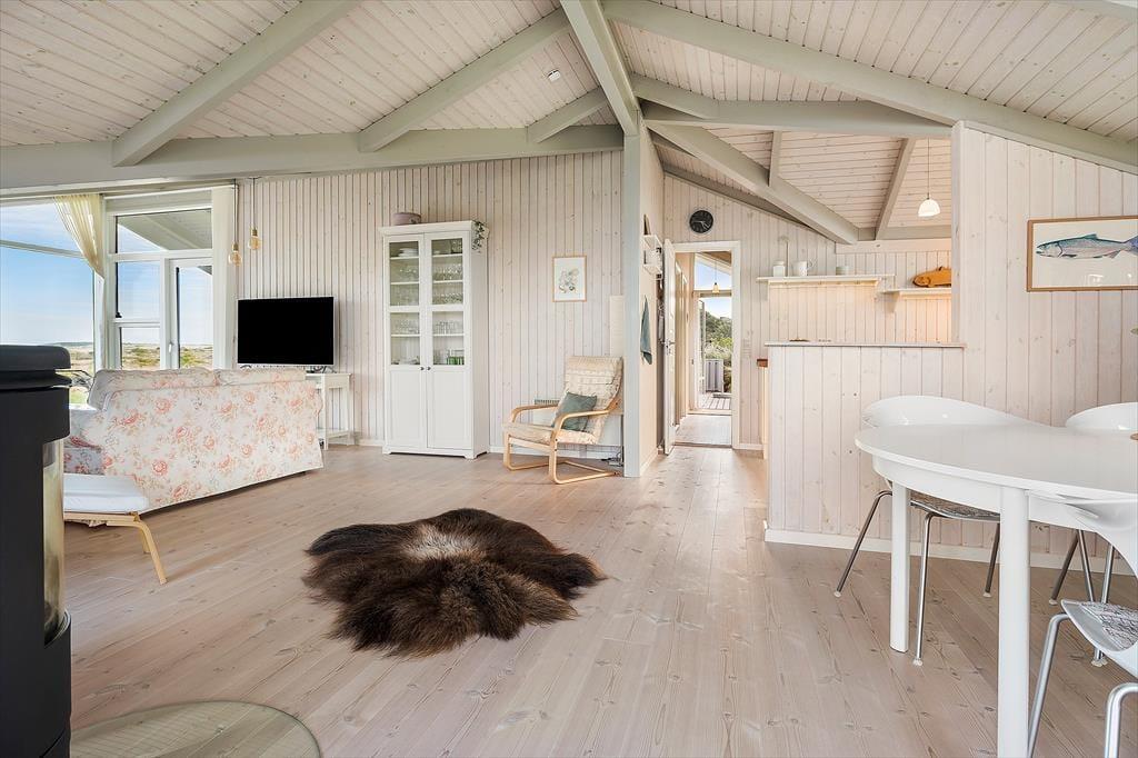 Når du træder ind i sommerhuset, bliver du mødt af en lys og indbydende atmosfære. Indretningen emmer af hygge og varme, og huset er omhyggeligt vedligeholdt med øje for både funktion og charme. Stuen er udstyret med en brændeovn, der spreder varme og stemning – perfekt til en rolig aften med en god bog eller et spil. De store vinduer lukker masser af dagslys ind og giver en dejlig fornemmelse af naturen helt tæt på.