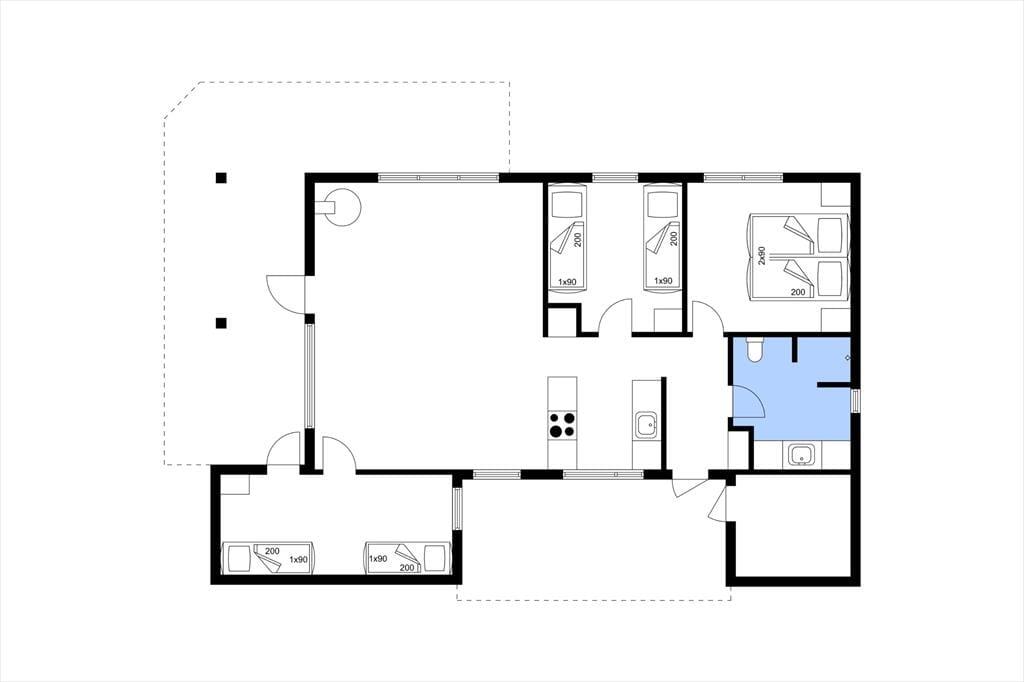 Når du træder ind i sommerhuset, mødes du af en lys og luftig indretning med loft til kip, som giver rummet en dejlig rummelighed. De store vinduer lukker naturen og lyset ind og giver en fantastisk udsigt til de omkringliggende indlandsklitter. Det åbne opholdsområde er perfekt til både afslapning og samvær, hvor du kan slappe af foran den hyggelige brændeovn eller nyde et måltid, mens du kigger ud på den smukke natur. Den enkle, lyse indretning giver en rolig og afslappet atmosfære, der indbyder til både hygge og fordybelse.