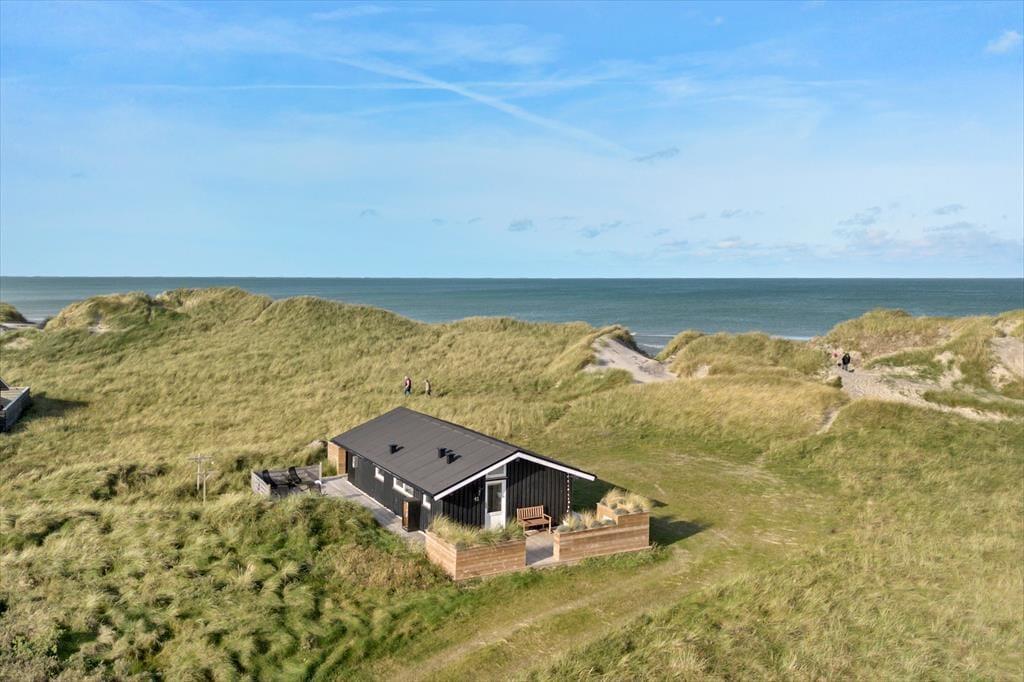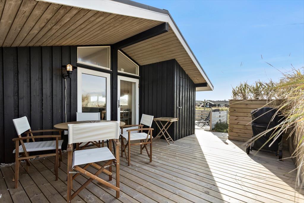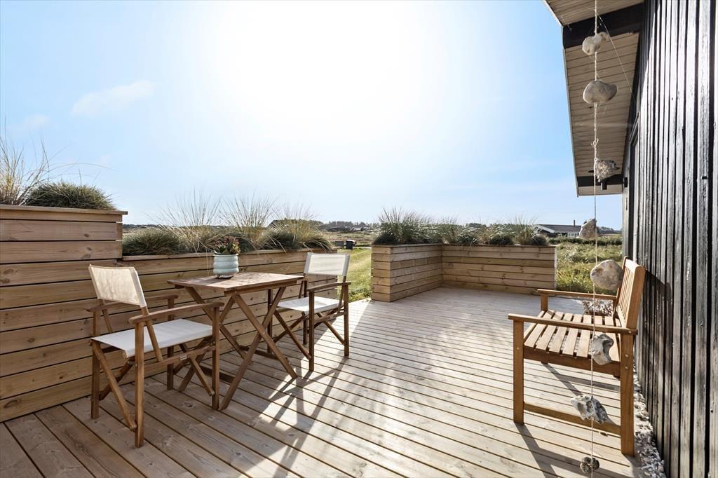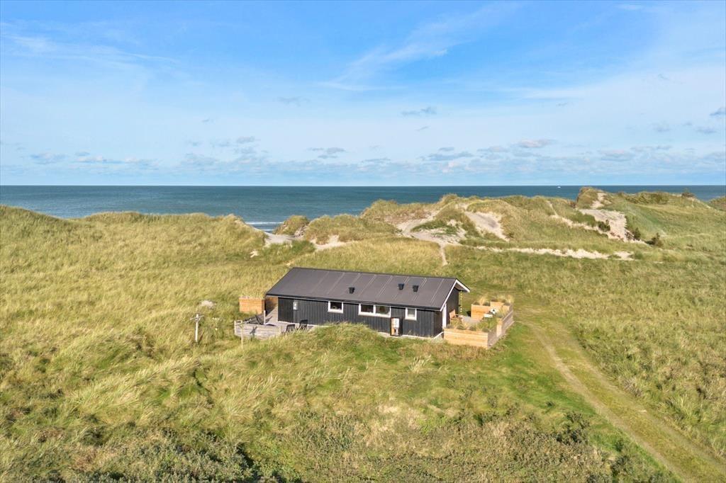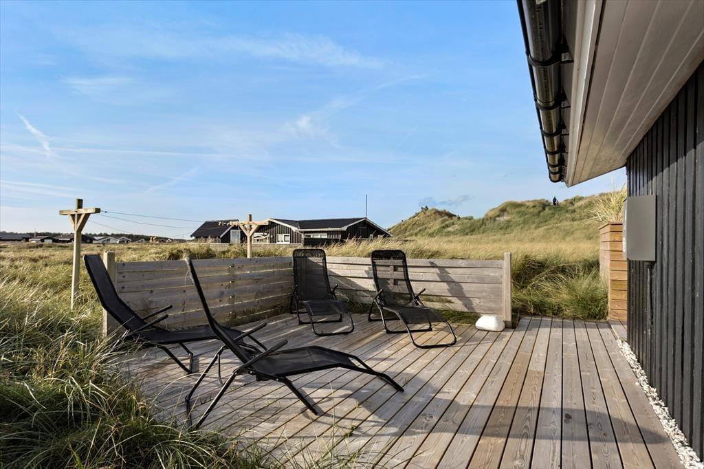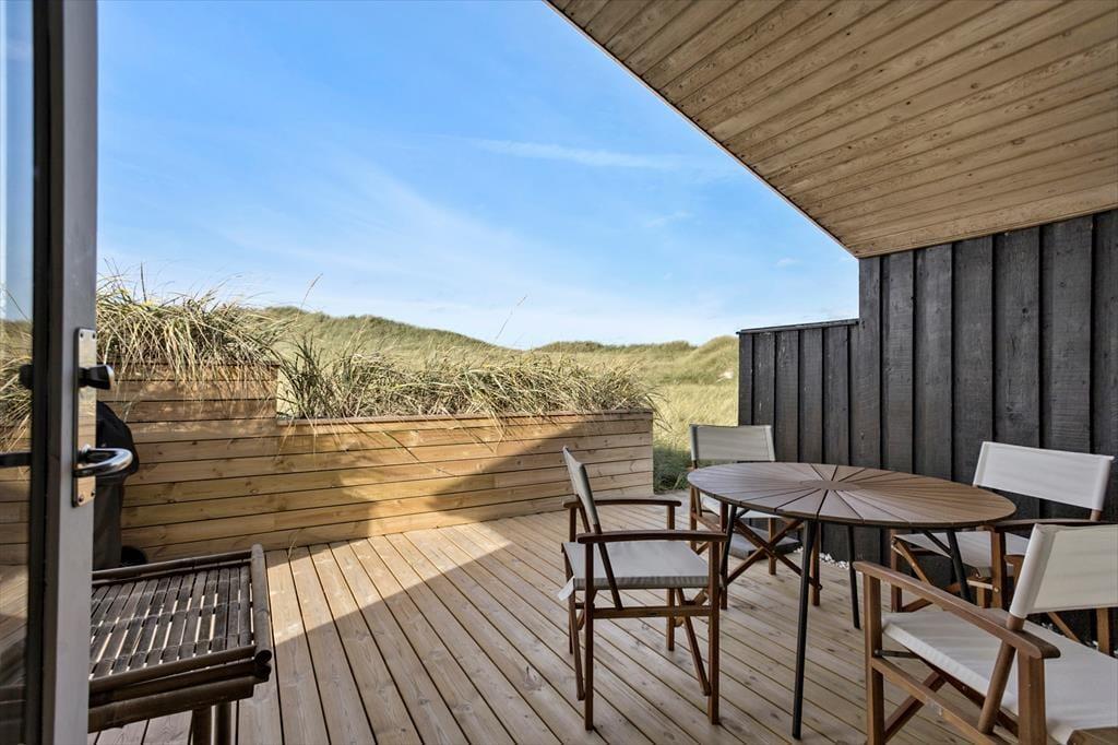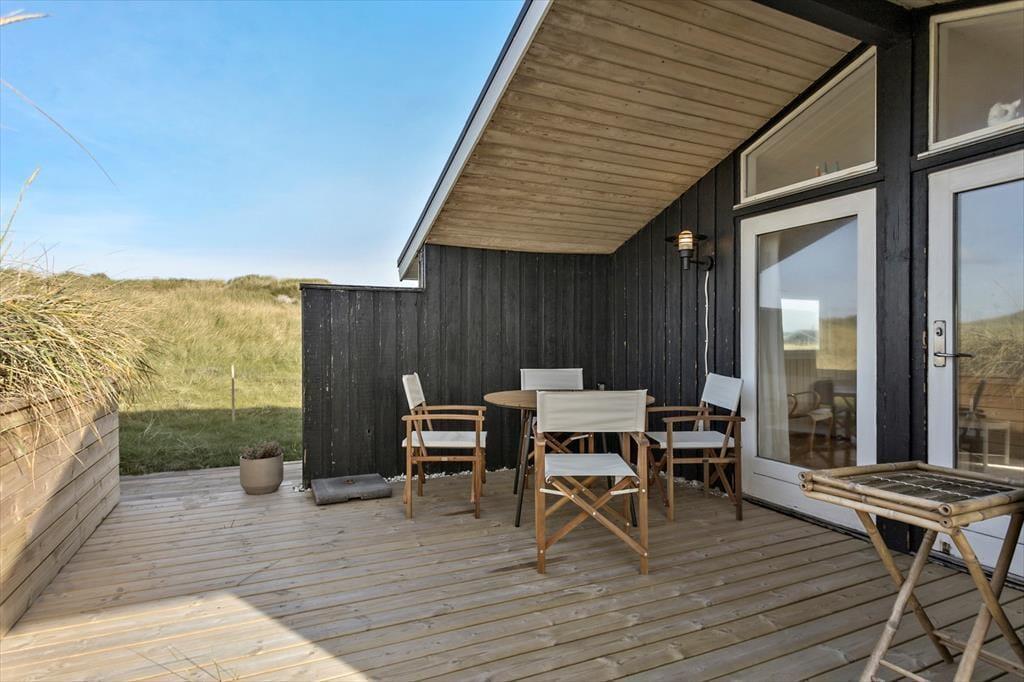 Udendørs er huset mindst lige så indbydende. Den store terrasse strækker sig langs huset og byder både på åbne solpletter og en dejlig overdækket del, hvor du kan sidde i læ med en kop kaffe, selv når vestenvinden rusker i klittoppene. De gode havemøbler inviterer til lange frokoster under åben himmel og afslappende timer med en bog eller et glas vin i hånden. Mågerne kredser over klitterne, vinden hvisker i marehalmen, og der er noget helt særligt ved at mærke solen varme, mens du lytter til Vesterhavets evige brusen tæt på. Den korte gåtur til stranden gør det nemt at tage en hurtig dukkert eller nyde en lang gåtur i vandkanten, når solen er ved at gå ned. Her er det nemt at finde sin yndlingsplads og bare være – i nuet og naturen.