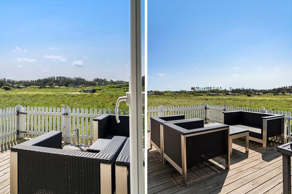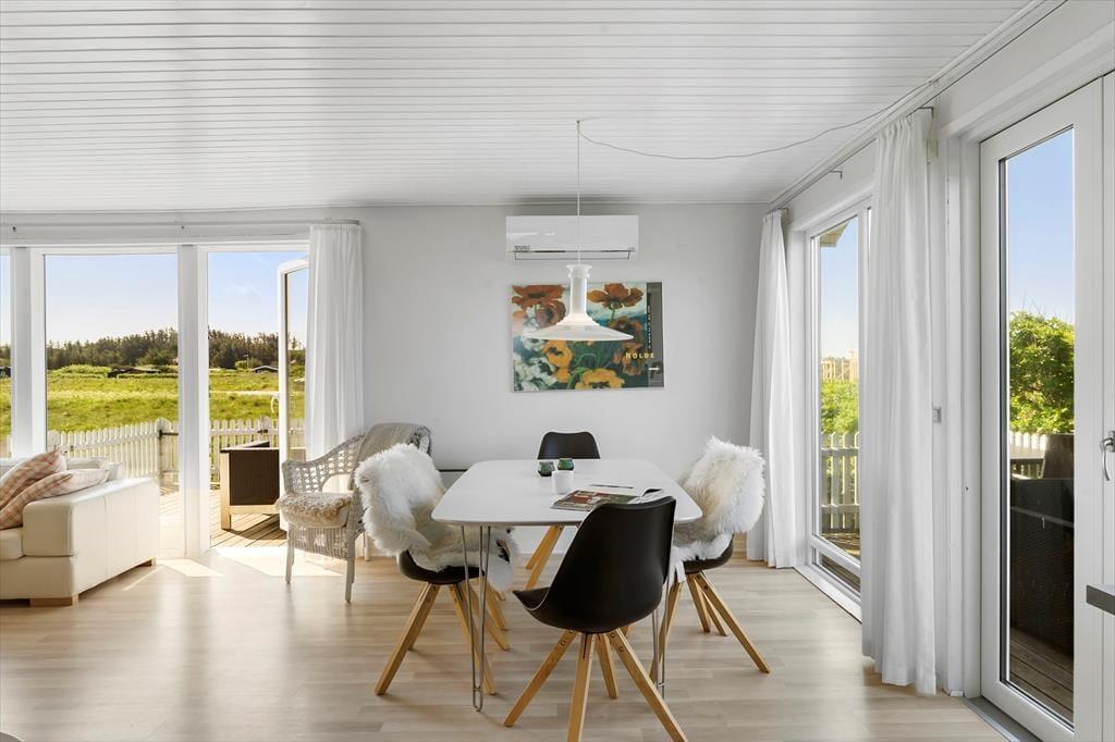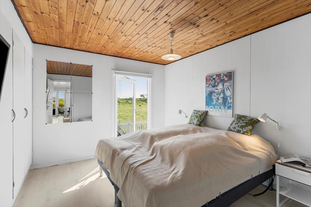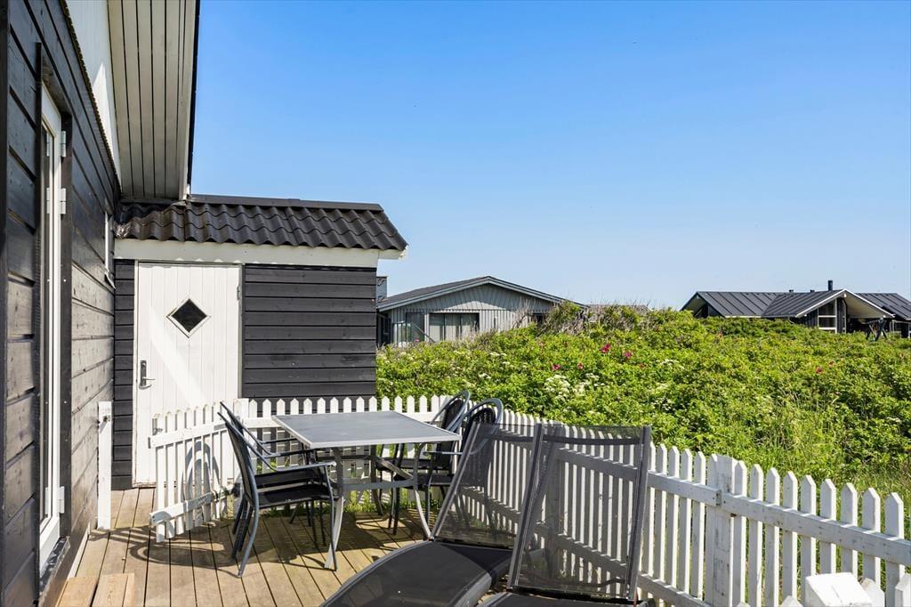 Udenfor venter en skøn stor træterrasse, som bliver et naturligt samlingspunkt i sommerhalvåret. Her kan du tage morgenkaffen med ud i solen og lade dagen begynde med udsigt til de bløde indlandsklitter, der bølger sig som et naturligt bagtæppe bag haven. Terrassen er udstyret med komfortable havemøbler, så du kan læne dig tilbage og lade roen sænke sig – hvad enten du nyder en god bog, en frokost i det fri eller en stille stund med lukkede øjne og lyden af naturen omkring dig. Når solen går ned, og duggen falder, kan du tænde op i grillen og forlænge dagen i det lune aftenlys. Uanset årstid er det let at forestille sig, hvordan det føles at finde ro her – i læ, med udsigt, i nær kontakt med naturen. Og det bedste af det hele? Du har kun få minutters gang til Vesterhavet, så du kan hurtigt smutte en tur ned til stranden, når trangen til vind i håret og sand under fødderne melder sig.