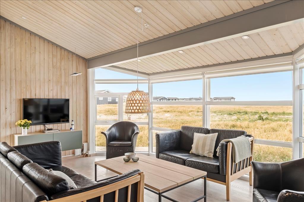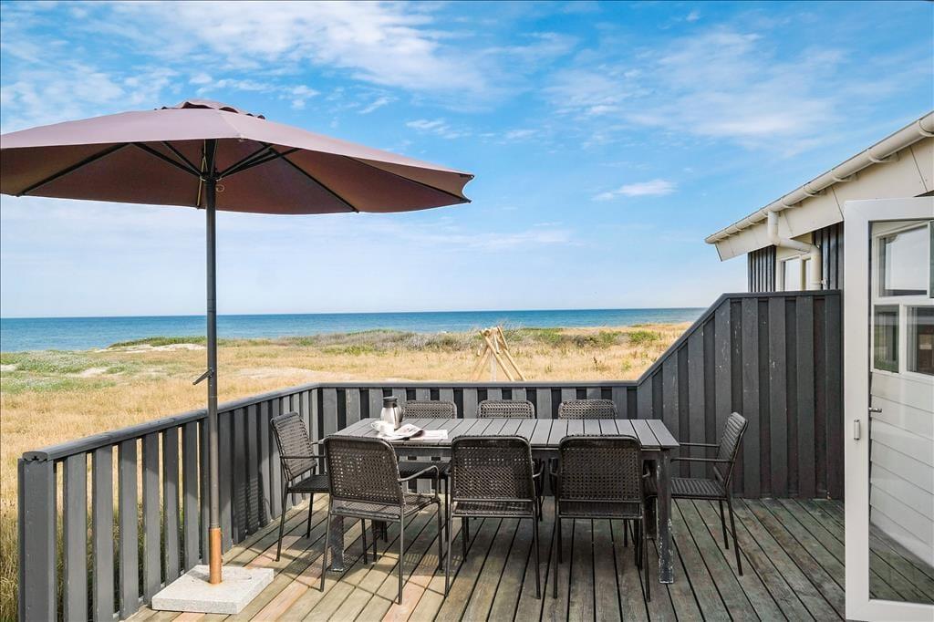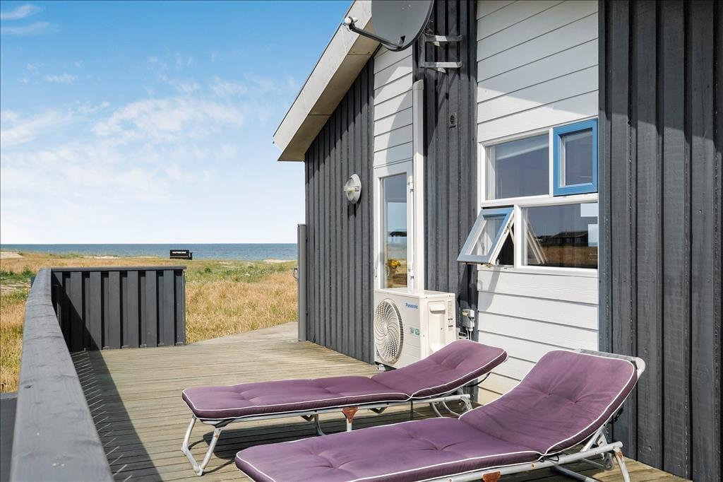 Sommerhuset er omgivet af en stor træterrasse, så I kan følge solen rundt hele dagen. Med den skønne udsigt til Vesterhavet kan I virkelig få ladet krop og sjæl op, og I skal selvfølgelig se solen stå op og gå ned hver dag, bedre chance fås ganske simpelt ikke!