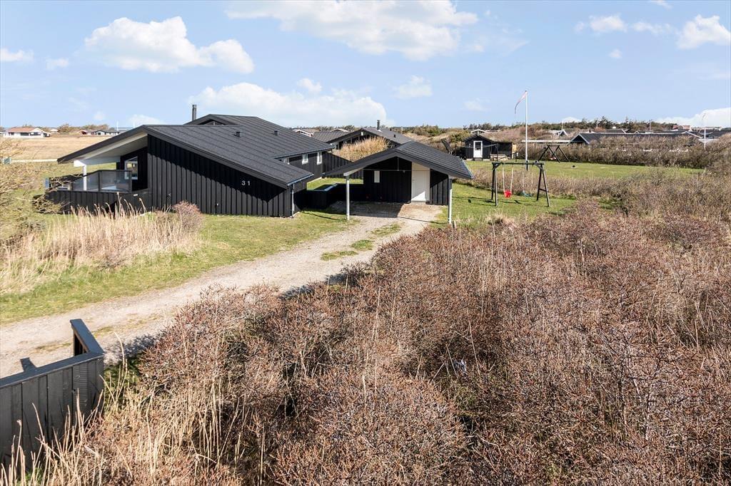 Rundt om sommerhuset er der anlagt store terrasser med gode havemøbler. Man kan finde grillen frem og nyde et lækker tilberedt måltid udendørs, eller man kan ligge og nyde solen på en af husets gode liggestole. Fra sommerhuset og terrasserne er der en flot udsigt til de fantastiske indlandsklitter med spændende fauna og et rigt dyreliv, og børnene kan lege flere timer i sandkassen og gyngerne på grunden.