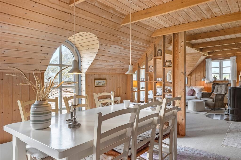 Huset er indrettet med fokus på hygge og behagelighed, og så er der et væld af finurligheder i arkitekturen Der er f.eks. et skønt lysindfald gennem de buede vinduer i spisestue, bad og køkken. Veludstyret, lyst køkken med opvaskemaskine. Det rustikke look er gennemført med rå mursten og valg af træ og klinker, så et spændende hus med mange sjove vinkler og kreativ indretning. Stuen er udstyret med brændeovn lige op ad den store, behagelige sofa, hvor man sagtens kan forestille sig at flade ud efter en god travetur.