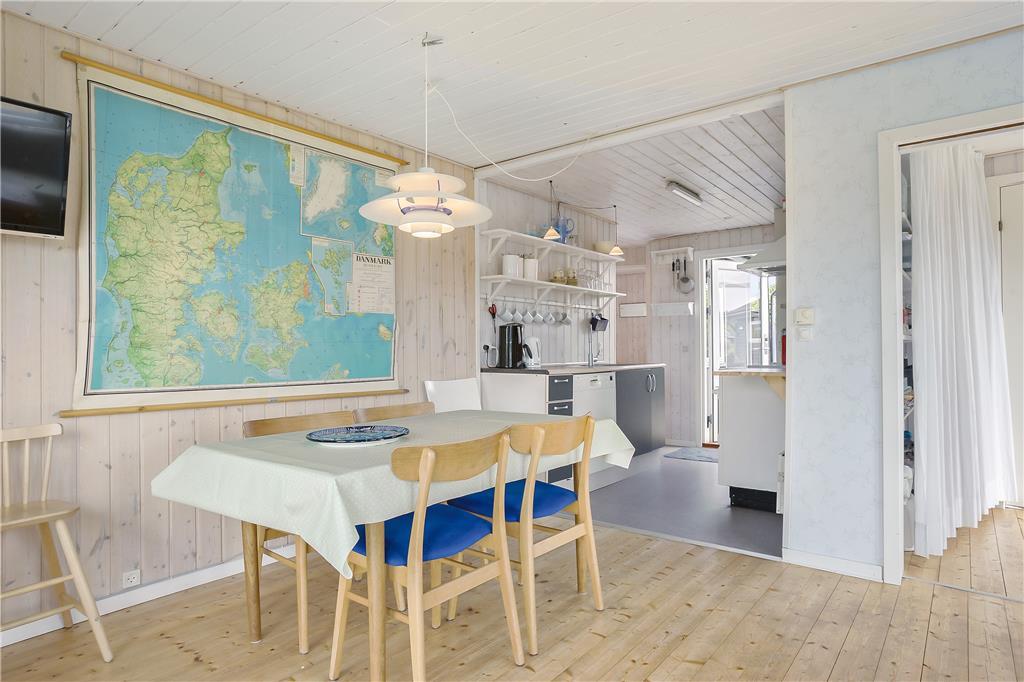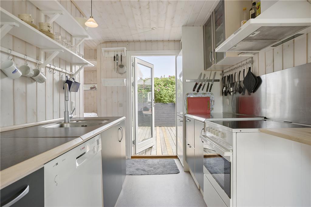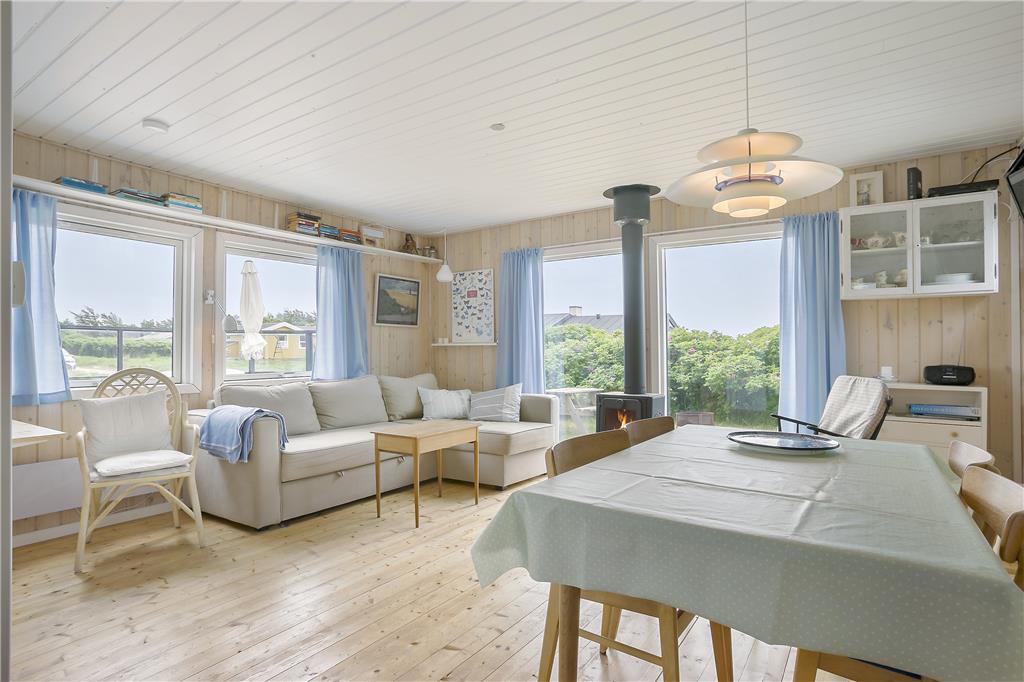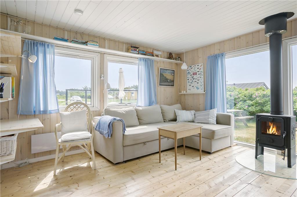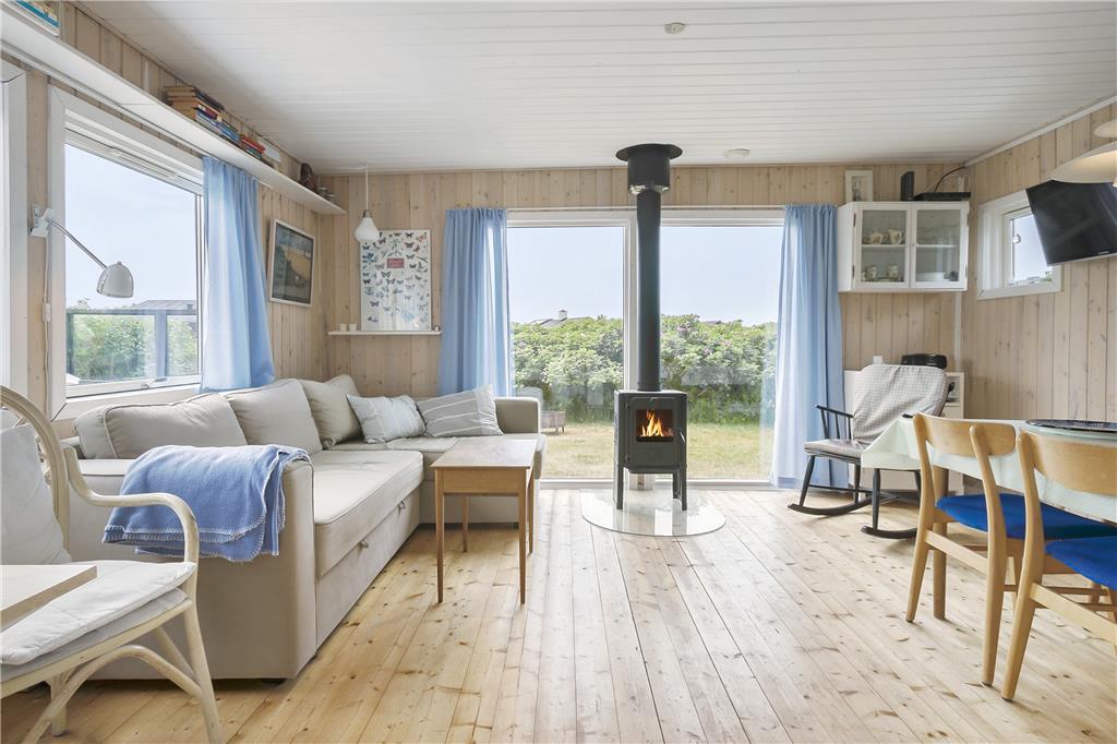 Huset er indrettet med lyse møbler, som indbyder til hygge og afslapning. Brændeovnen lige ved sofakrogen skal nok sikre varmen selv på kølige aftener. Det moderne og funktionelle køkken er forbundet med spisestue og opholdsstue, og så er der direkte udgang fra køkkenet til en østvendt terrasse, hvor man kan nyde morgenmaden og den opadgående sol. Der er to gode soveværelser – et med dobbeltseng og et med køjeseng og en enkeltseng. Badeværelset er lyst og godt indrettet.