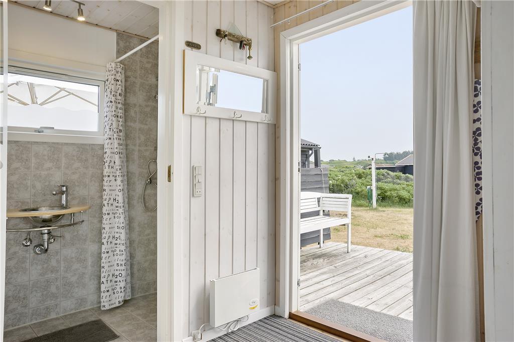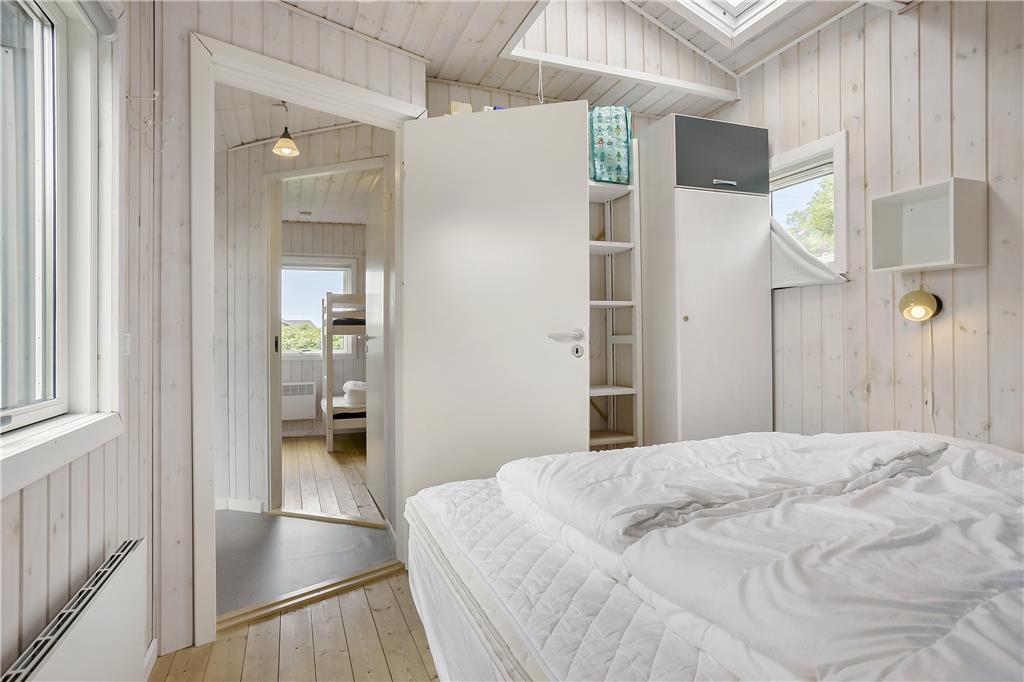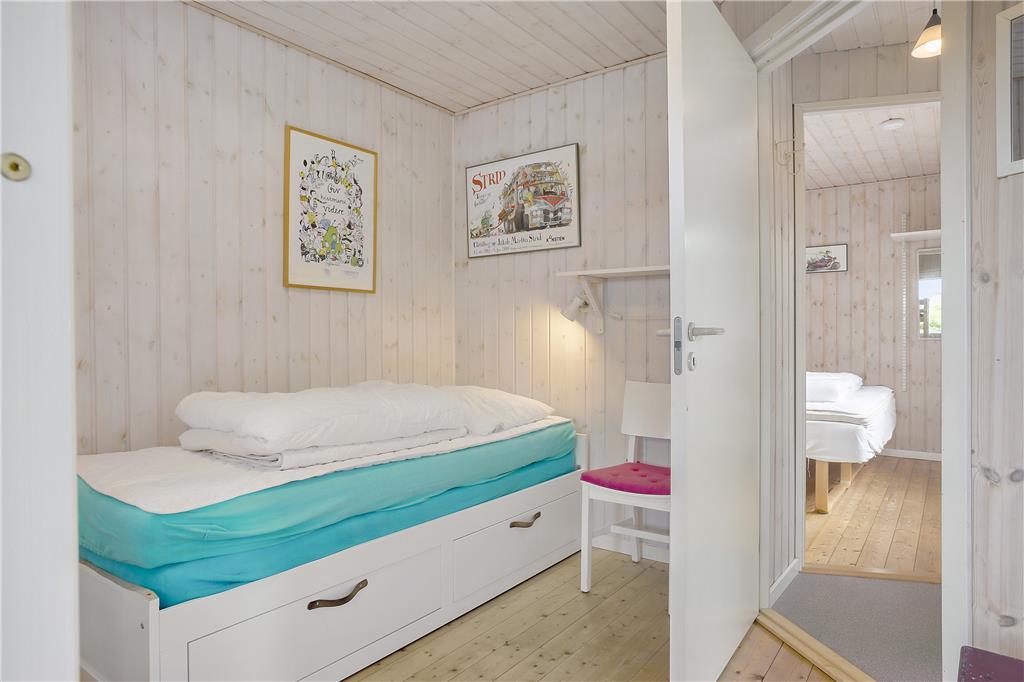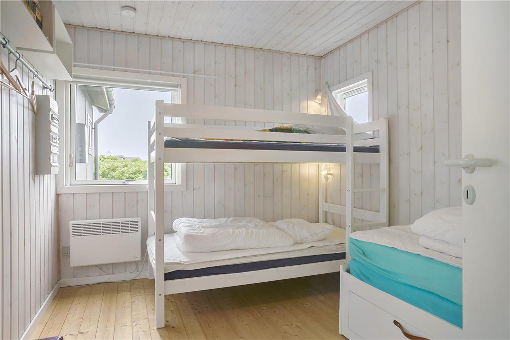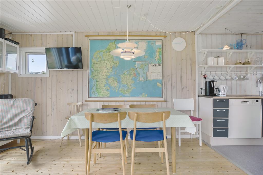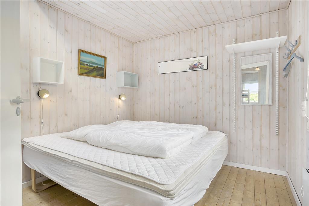 Huset er indrettet med lyse møbler, som indbyder til hygge og afslapning. Brændeovnen lige ved sofakrogen skal nok sikre varmen selv på kølige aftener. Det moderne og funktionelle køkken er forbundet med spisestue og opholdsstue, og så er der direkte udgang fra køkkenet til en østvendt terrasse, hvor man kan nyde morgenmaden og den opadgående sol. Der er to gode soveværelser – et med dobbeltseng og et med køjeseng og en enkeltseng. Badeværelset er lyst og godt indrettet.