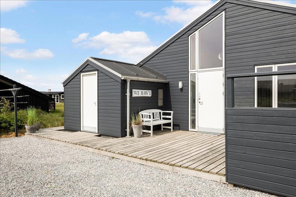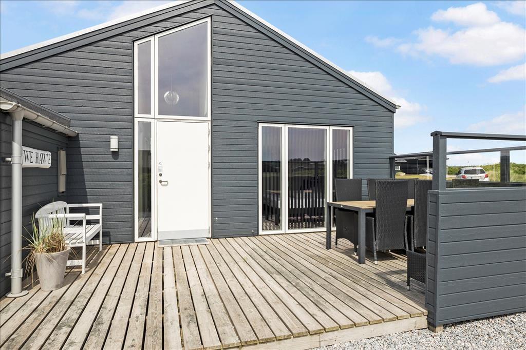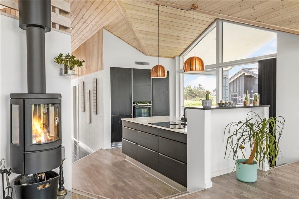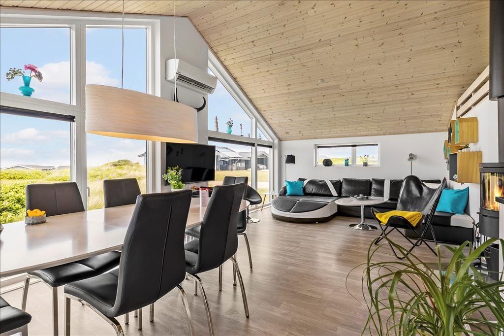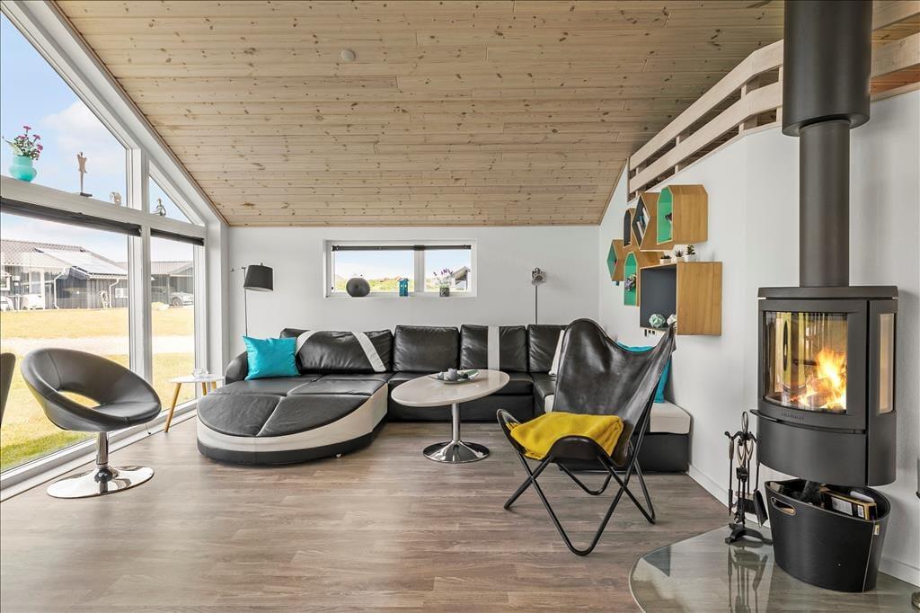 Sommerhuset er smagfuldt og praktisk indrettet med de bedste materialer. Især skal fremhæves det smukke Invita køkken, som indbyder til kulinarisk udfoldelse. Fra køkkenet giver en dobbelt havedør adgang til en overdækket terrasse, hvor man kan nyde sine måltider. Et par skridt op fra køkkenet ligger den smagfuldt indrettede stue med flotte og moderne møbler. Fra stuen har du en flot udsigt over Vesterhavet. Sommerhuset er godt isoleret, har gulvvarme og vand til luft varmepumpe, så energiomkostningerne er rimelige. Sommerhusets brændeovn giver god varme på kolde aftener, og bidrager til den hyggelige stemning. Der er store flotte panoramavinduer, som giver et flot lysindfald. Hemsen er indrettet med 2 madrasser og et par skønne ”Fatboys”, så man kan hygge sig, mens man samtidig kan kigge på stjerner gennem ovenlysvinduet. Der er 3 gode soveværelser alle med dobbeltværelser og god skabsplads. Sommerhuset har 2 badeværelser, hvor det ene byder på spa og infrarød sauna.