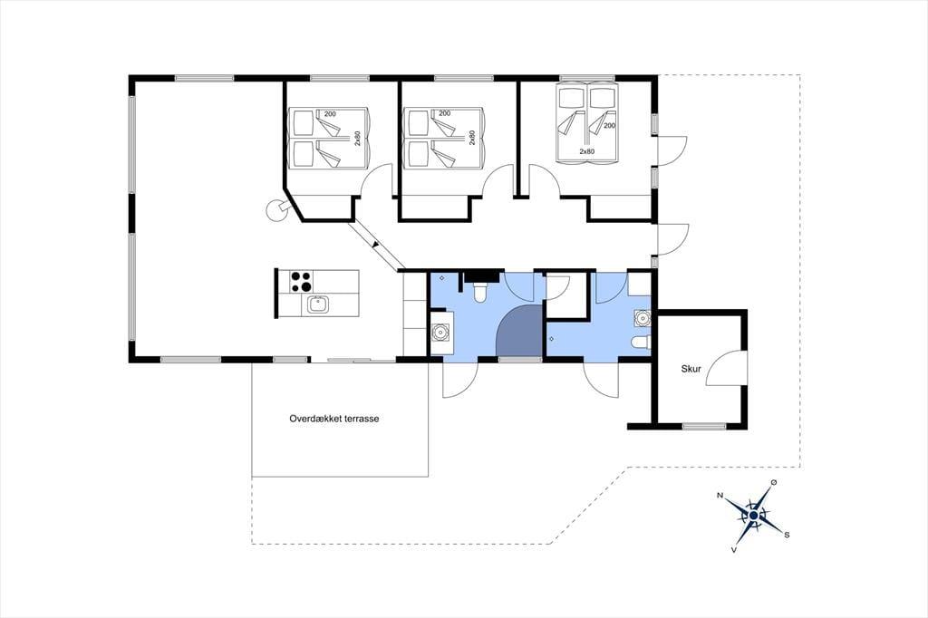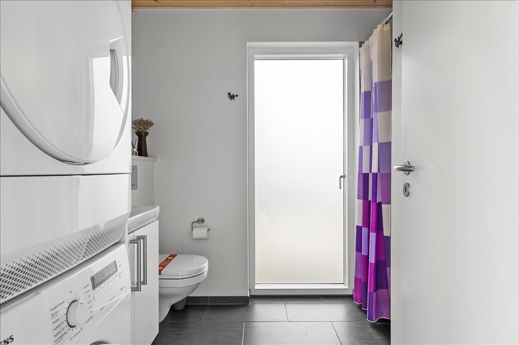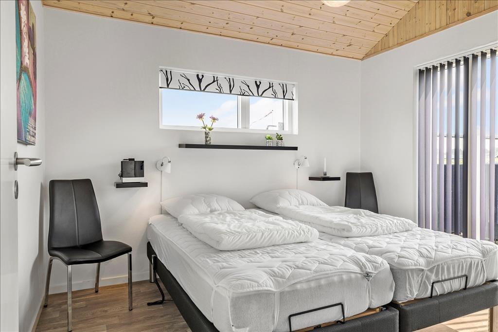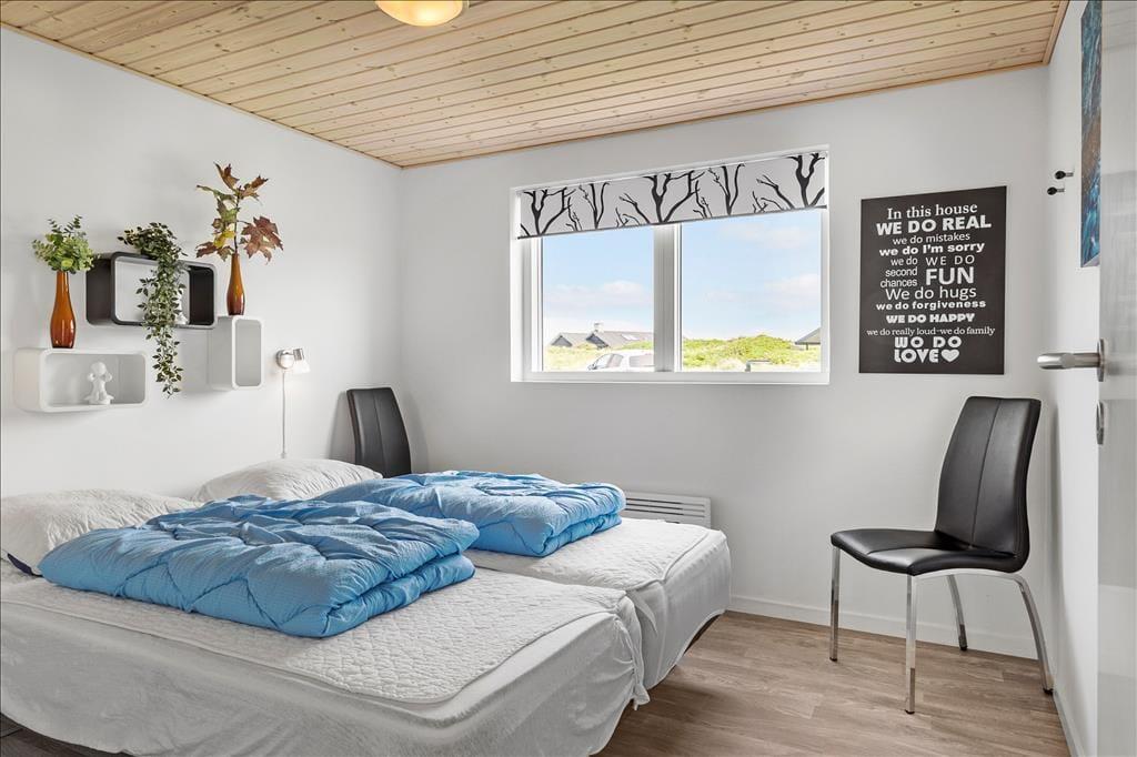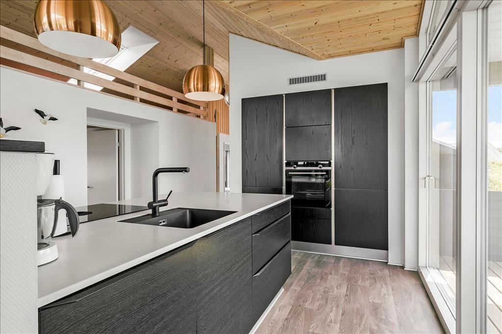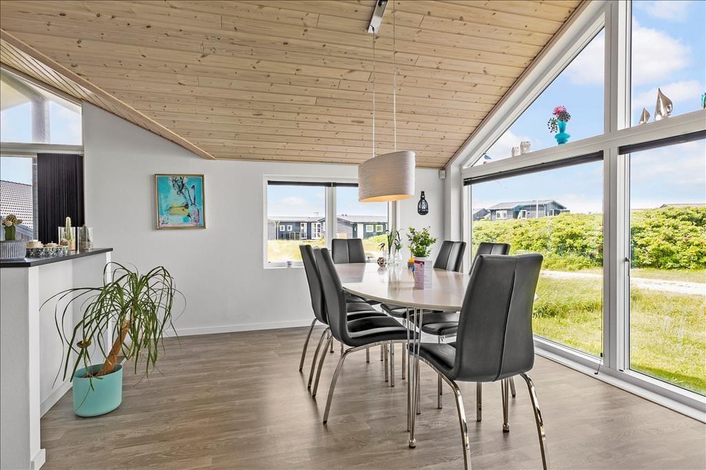 Sommerhuset er smagfuldt og praktisk indrettet med de bedste materialer. Især skal fremhæves det smukke Invita køkken, som indbyder til kulinarisk udfoldelse. Fra køkkenet giver en dobbelt havedør adgang til en overdækket terrasse, hvor man kan nyde sine måltider. Et par skridt op fra køkkenet ligger den smagfuldt indrettede stue med flotte og moderne møbler. Fra stuen har du en flot udsigt over Vesterhavet. Sommerhuset er godt isoleret, har gulvvarme og vand til luft varmepumpe, så energiomkostningerne er rimelige. Sommerhusets brændeovn giver god varme på kolde aftener, og bidrager til den hyggelige stemning. Der er store flotte panoramavinduer, som giver et flot lysindfald. Hemsen er indrettet med 2 madrasser og et par skønne ”Fatboys”, så man kan hygge sig, mens man samtidig kan kigge på stjerner gennem ovenlysvinduet. Der er 3 gode soveværelser alle med dobbeltværelser og god skabsplads. Sommerhuset har 2 badeværelser, hvor det ene byder på spa og infrarød sauna.