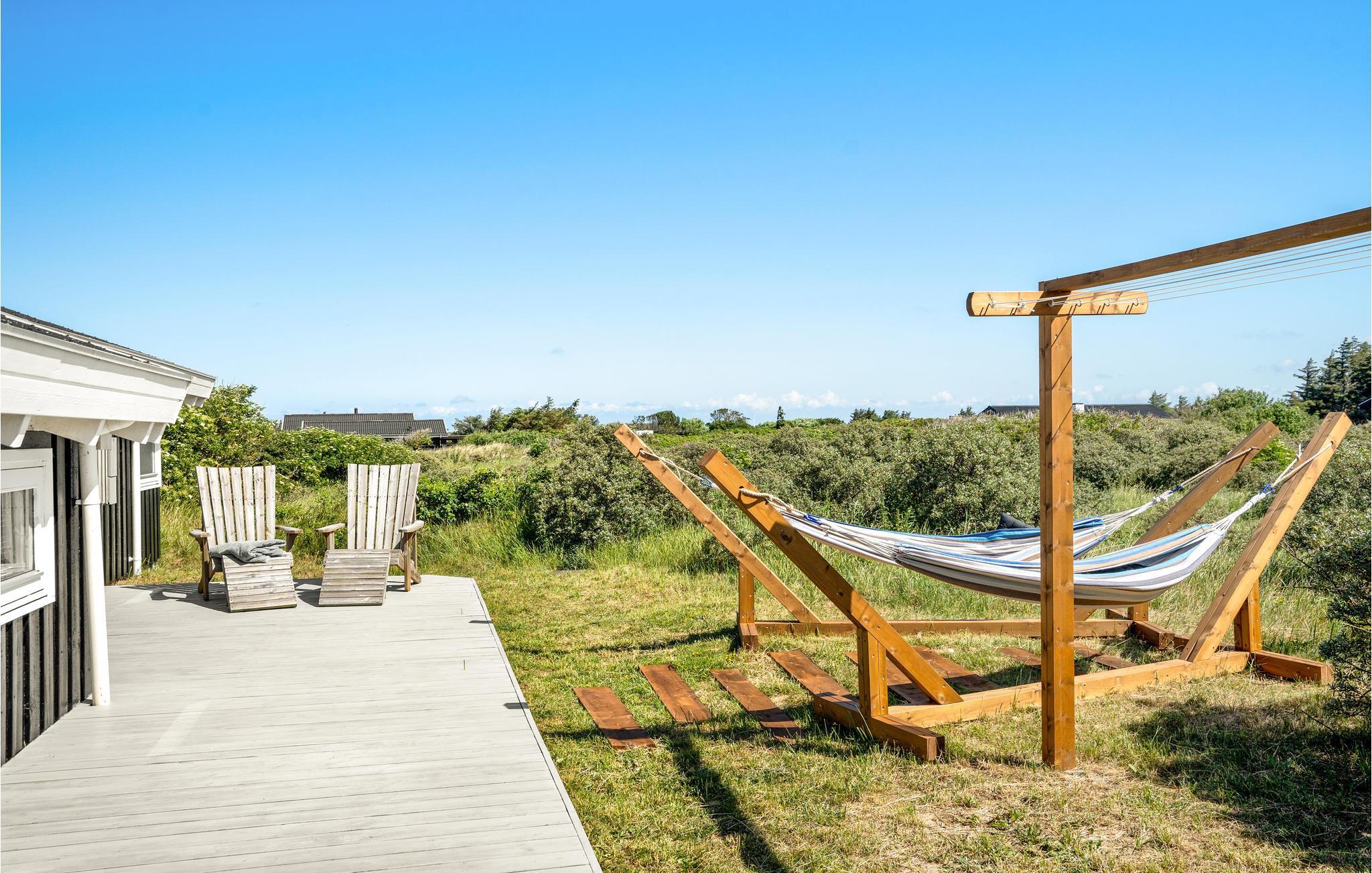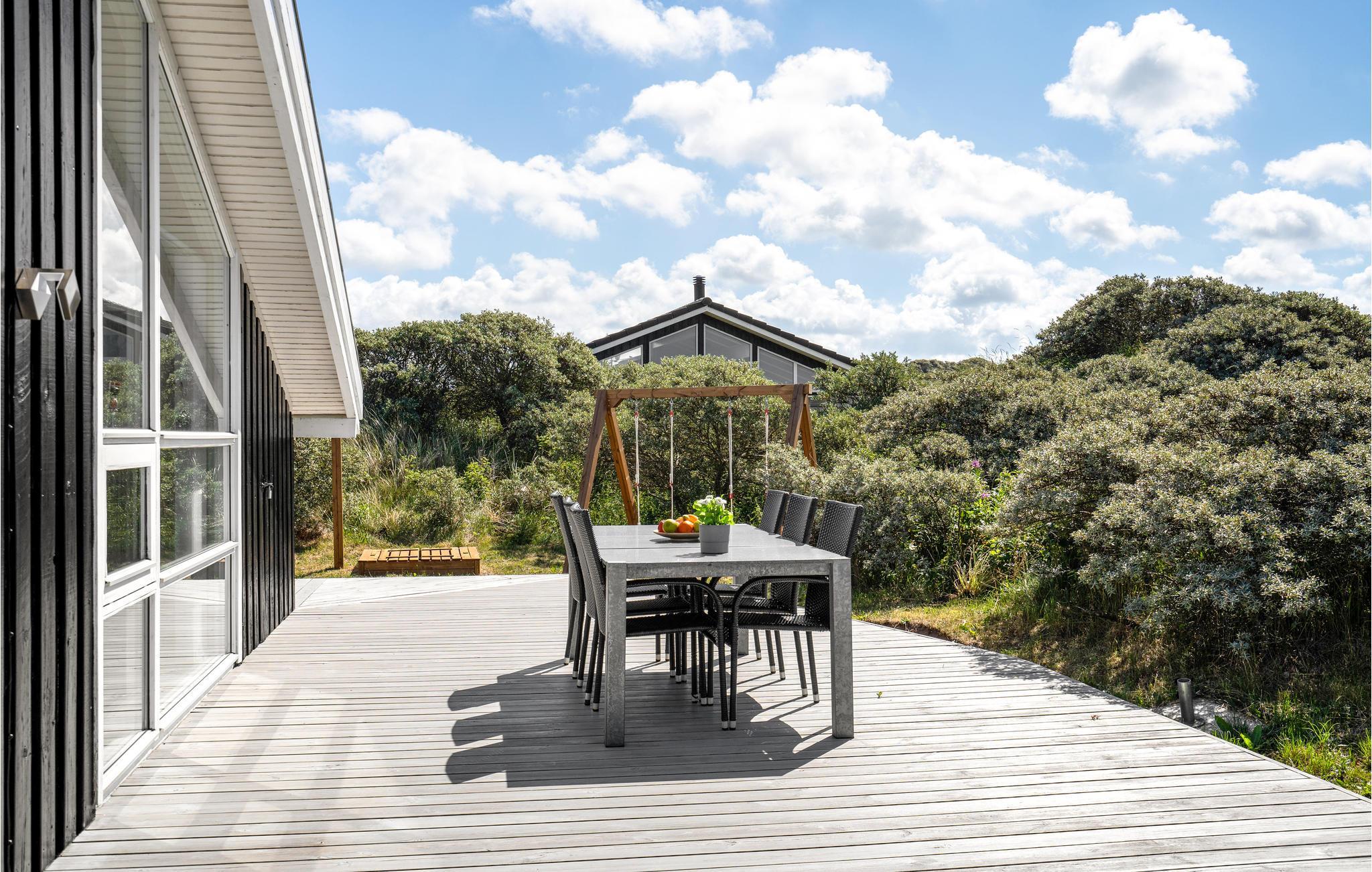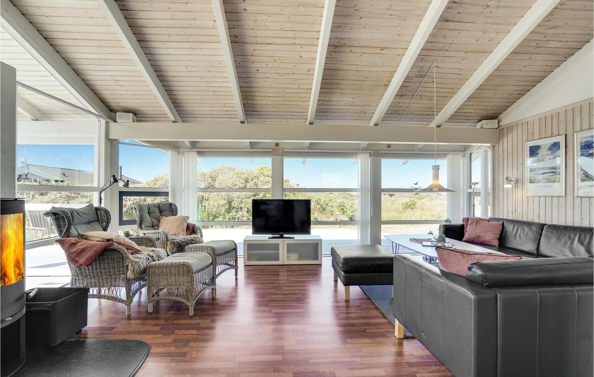 Dette herlige feriehus ligger på en kuperet klitgrund ved en af vestkystens fineste badestrande. Her er en bred, børnevenlig sandstrand og lune klitgryder at solbade i. Solnedgangene er her til alle årstider en helt fantastisk oplevelse. Der er kun få minutters kørsel til Lønstrup, hvor man som et af de få steder i Danmark stadig kan se fiskekutterne blive trukket op på stranden med deres fangst af frisk fisk. I Lønstrup hersker en egen, charmerende stemning med spændende butikker, gallerier, kunstværksteder og hyggelige spisesteder. Hvis man vil se hvad naturens barske kræfter kan udrette, hvis de uhindret får lov at rase, skal man tage til Mårup Kirke, som endnu står på den yderste kant af en klint i fare for at falde i havet, samt vandreklitten Råbjerg Mile, som flytter sig årligt flere meter mens den begraver alt under sig. Søger man sportslig udfoldelse, ligger Skallerup Klit feriecenter med et tropisk badeland, minigolf, squash, bordtennis, badminton- og tennisbaner samt et aktivitetscenter 5 minutters kørsel fra huset. Mere end 50 spændende forlystelser for alle uanset alder og vovemod byder også FÅRUP SOMMERLAND på, kun en halv times kørsel fra feriehuset. Her finder man f.eks. Aquaparken, som er Nordens største udendørs vandland. Er man villig til at køre en lille times tid, er Nordjyllands hovedstad Aalborg med de prægtige gamle huse i bykernen, det smukke kunstmuseum, Tivoliland, Zoologisk Have samt flere gode museer et godt udflugtsmål. Dagen kan afsluttes med en bid mad i den maleriske Jomfru Ane Gade eller på toppen af det 105 m høje Aalborg-tårn, mens man nyder udsigten over by og fjord.