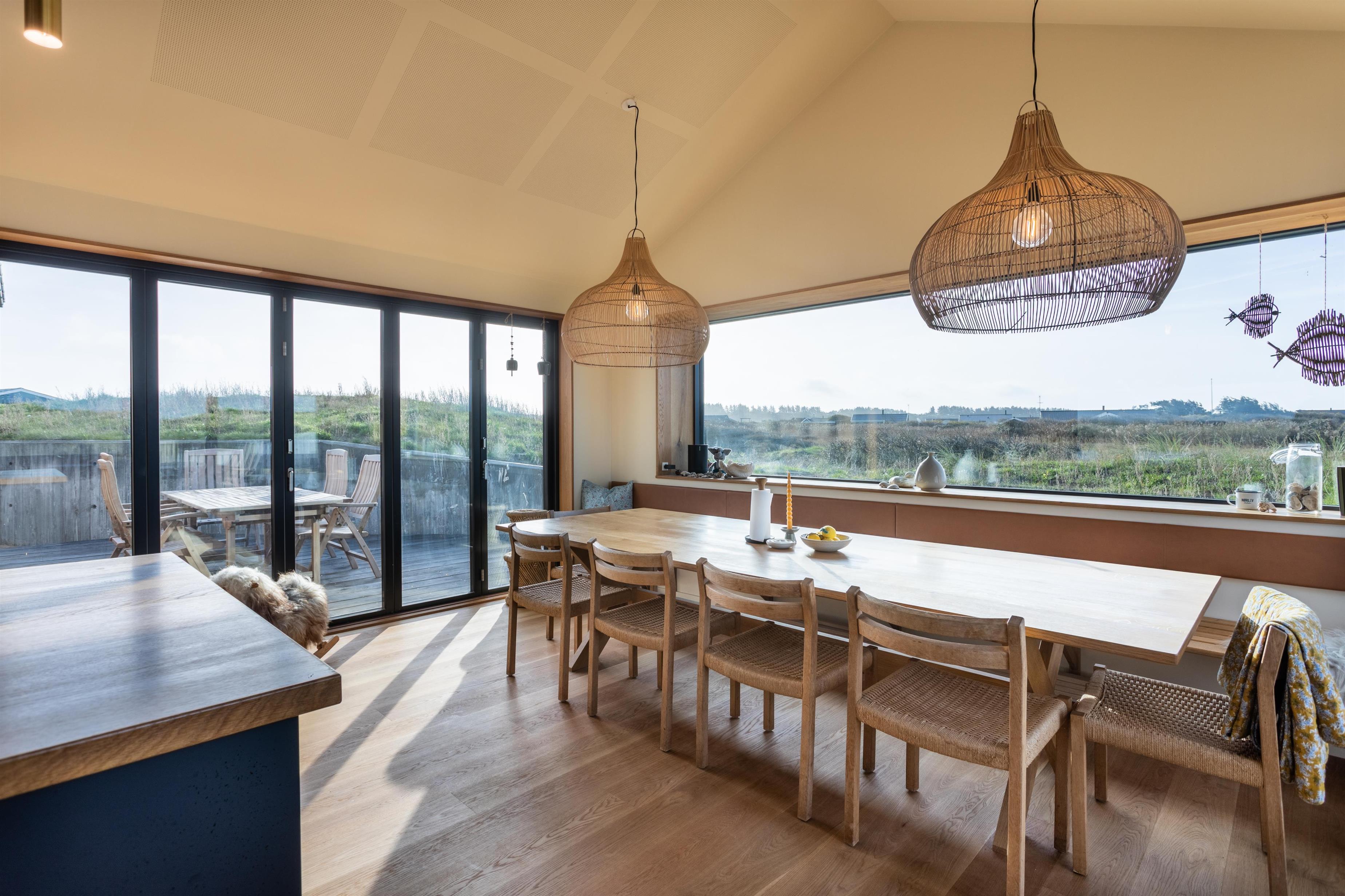 Huset består af et stort køkken-alrum, som opfylder alle kriterier for en ferie med samvær i fokus. Slå jer ned ved det store spisebord og spil et brætspil mens der kokkereres i køkkenet på gaskomfuret eller læs en god bog i stuen, som ligger i direkte forlængelse af køkken-alrummet. Huset rummer op til 8 overnattende gæster og byder på tre gode soveværelser - alle med direkte udgang til den skønne, rå natur. To af soveværelserne er med dobbeltsenge og det sidste er med to speciallavede køjesenge med ekstra bredde, der gør dem meget komfortable for store og små. Fra alrummet har I adgang til en stor, hyggelig hems med to sovepladser. Til slut er der to badeværelser; Det store badeværelse er med dobbeltbruseniche, mens det andet badeværelse er med bruseniche og vaskesøjle.