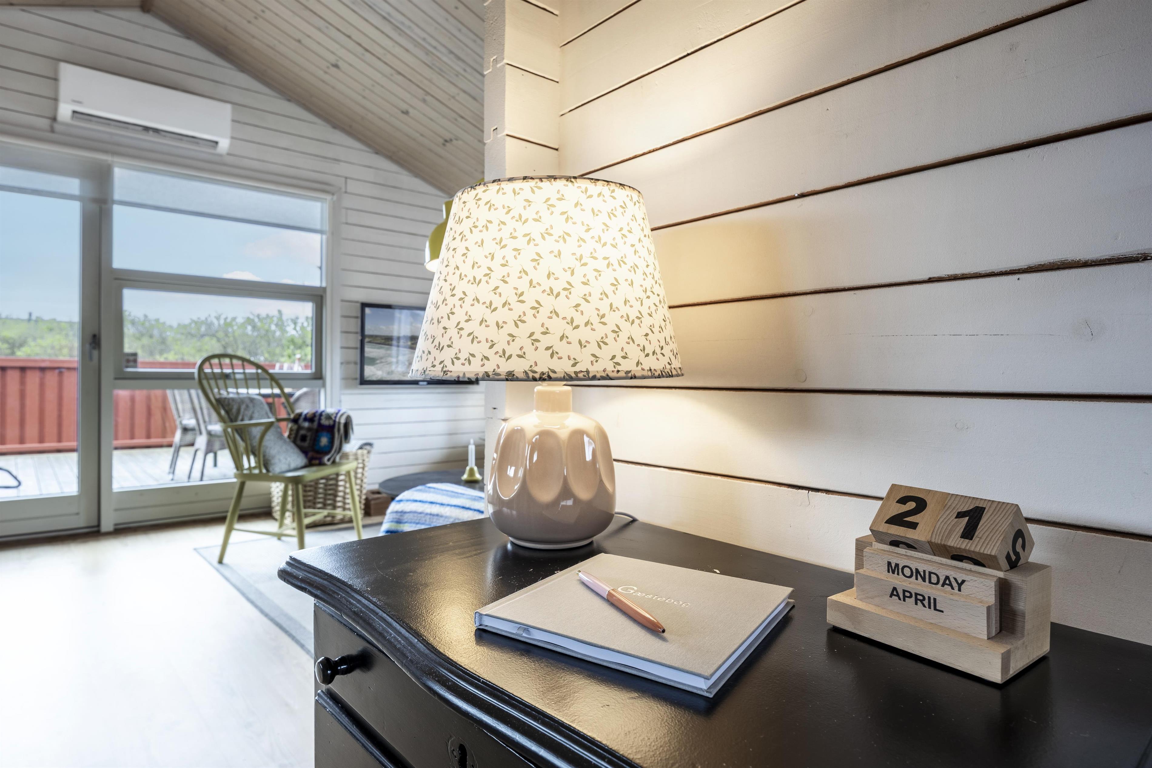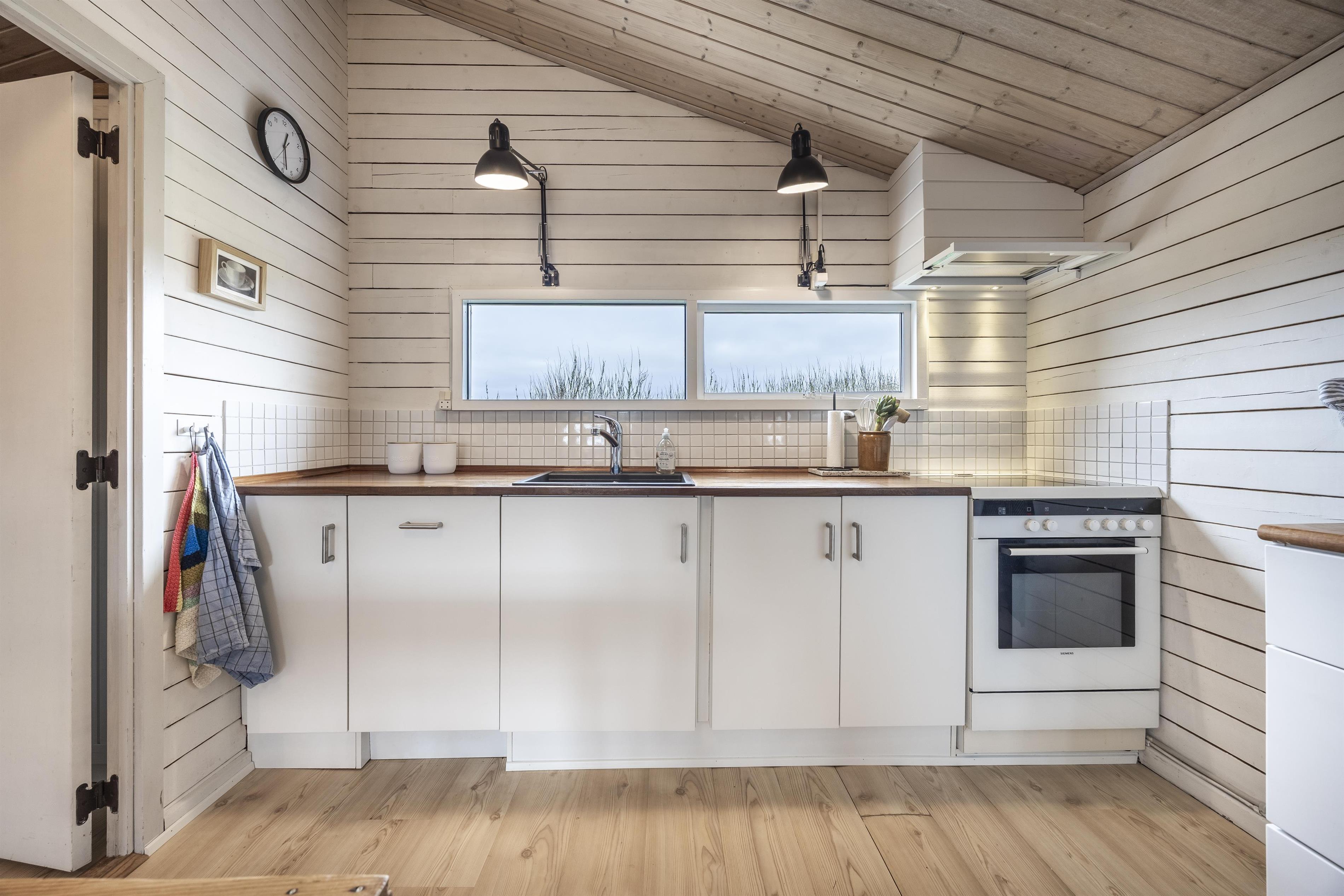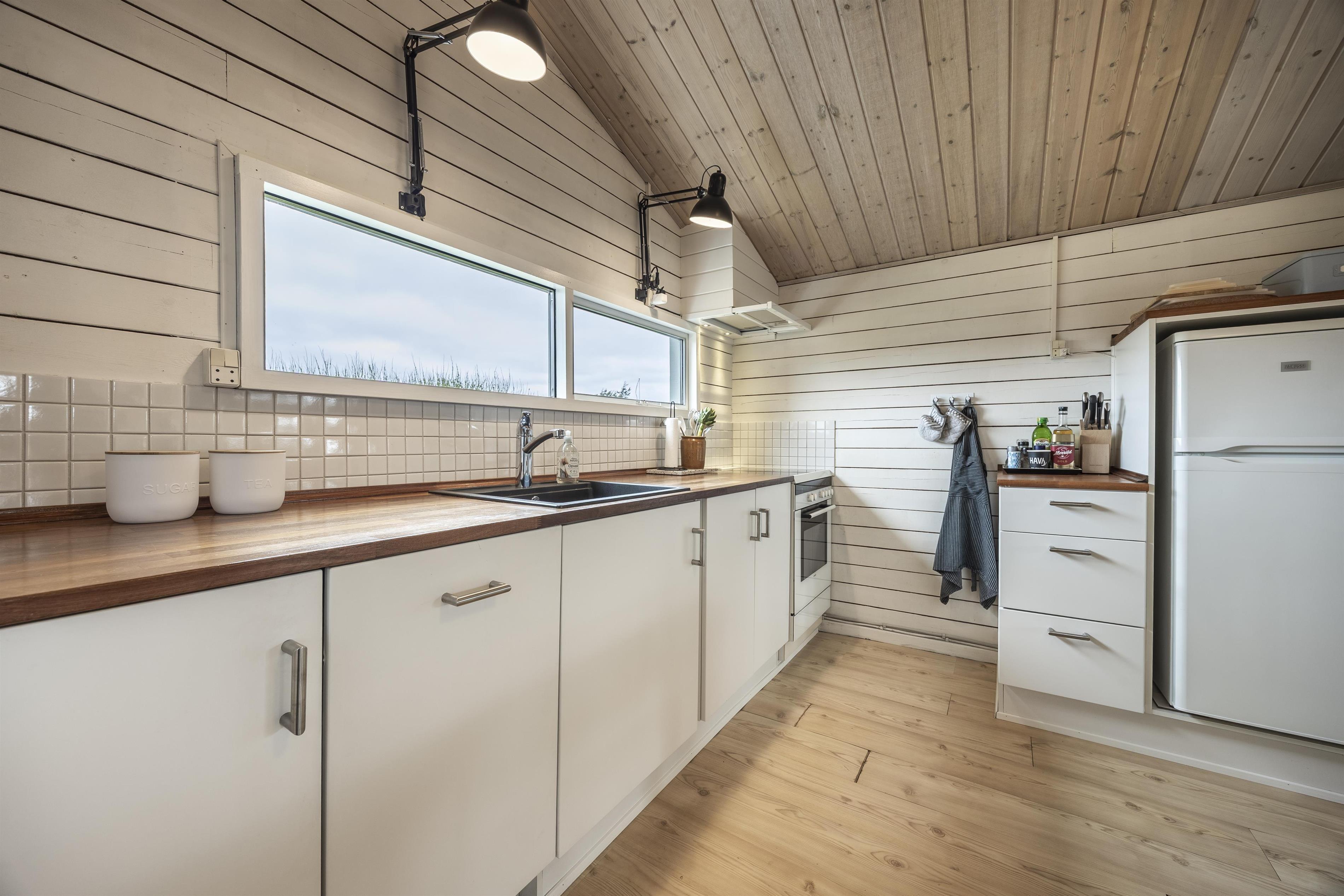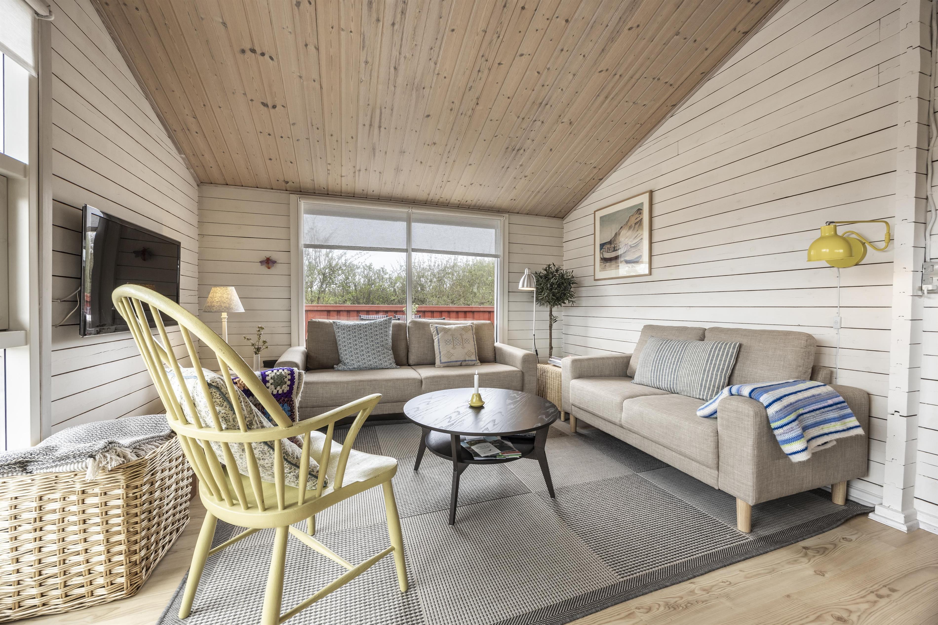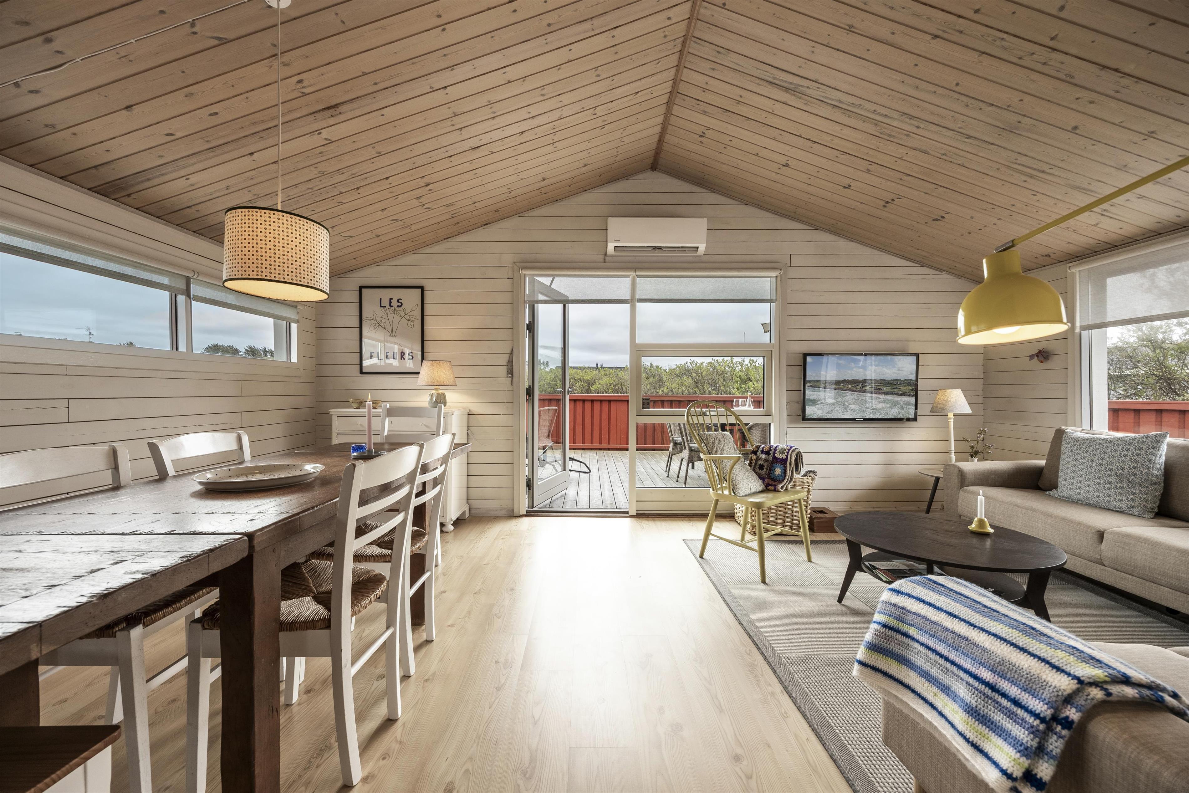Den indbydende stue har komfortable møbler og store vinduer, der lader lyset strømme ind og giver en følelse af at være tæt på naturen – også indefra. Køkkenet er veludstyret med alt, hvad der skal bruges for at gøre ferien bekvem og ubesværet, uanset om I laver nem ferieaftensmad eller morgenmad med friskbagte boller. Atmosfæren er rolig og afslappende – et ægte fristed.
